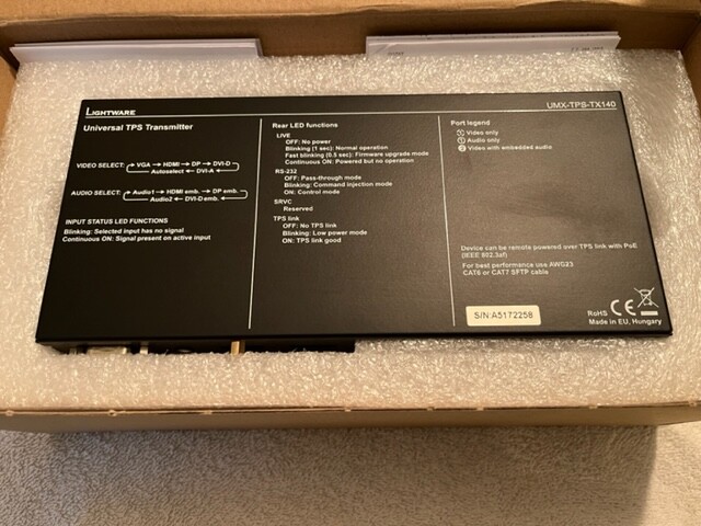 UMX Series TPS Transmitter UMX‑TPS‑TX140 transmits universal 4K video, audio and control up to a range of 170 m over a single CAT cable. This transmitter was designed for digital and analog video and audio signals: VGA, YPrPb and HDMI 1.4, DVI and DP 1.1 with analog stereo audio from local input or embedded 7.1 HBR audio. Highlighted features Built-in Event Manager control automation feature 1920x1080@120Hz/4:4:4, 4096x2160@30Hz/4:4:4 or 60Hz/4:2:0 maximum resolutions (300MHz) Audio embedding (or replace original audio) Ethernet extension (100 Mbps) Command injection on RS-232 and IR ports GPIO control ports Extends VGA, DVI, HDMI 1.4 or DP 1.1 + Audio + Ethernet + RS-232 + IR over one CAT5/6/7 cable Bi-directional RS-232 and IR extension (pass-through and control Company wide policy: All items are subject to 3% restocking fee if buyer returns, changes mind, or purchases item by accident. The 3% restocking fee WILL NOT be assessed if item is defective or not received as described.