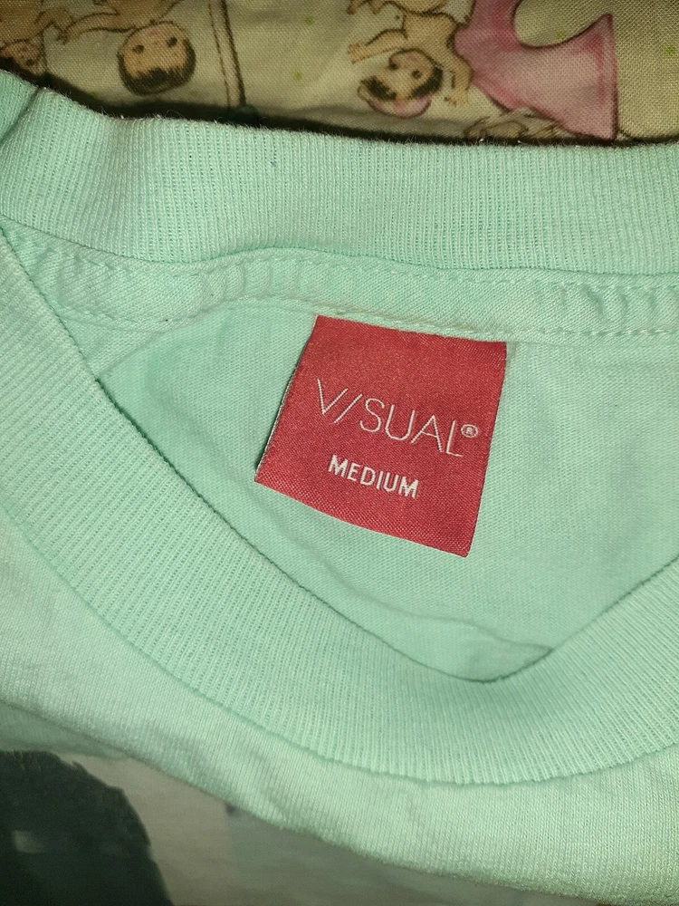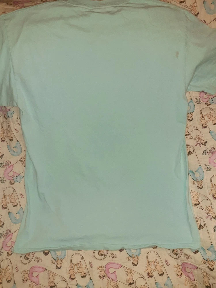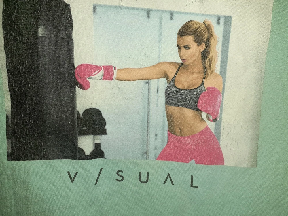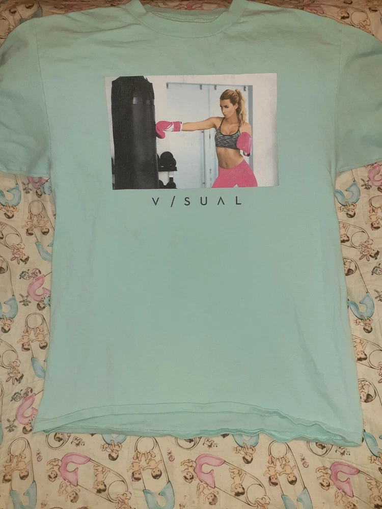 Visual mens light blue green top has a girl boxer on it looks like liberty bell from netflix show glow sz m t shirt preowned