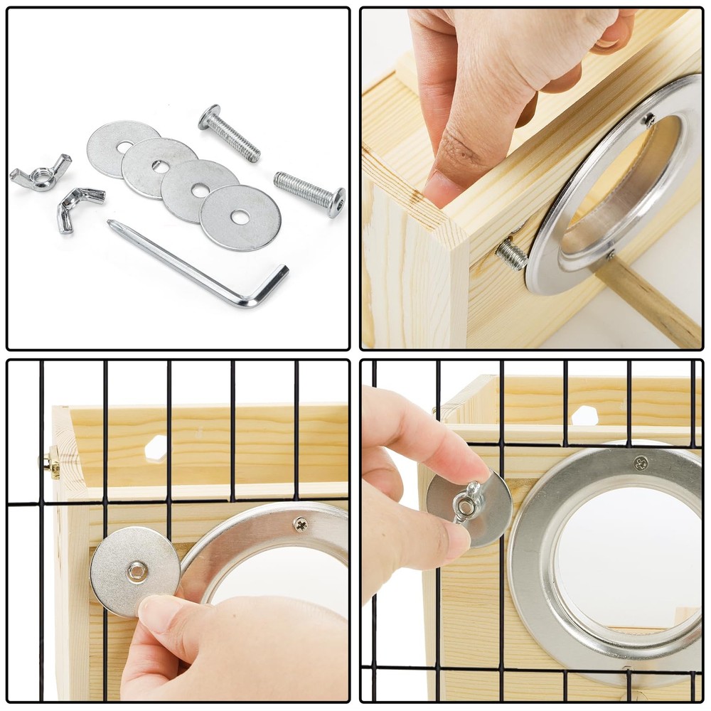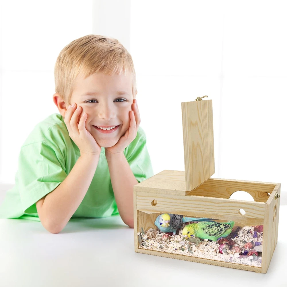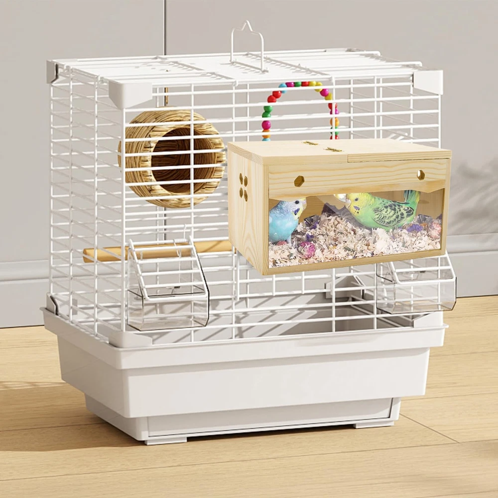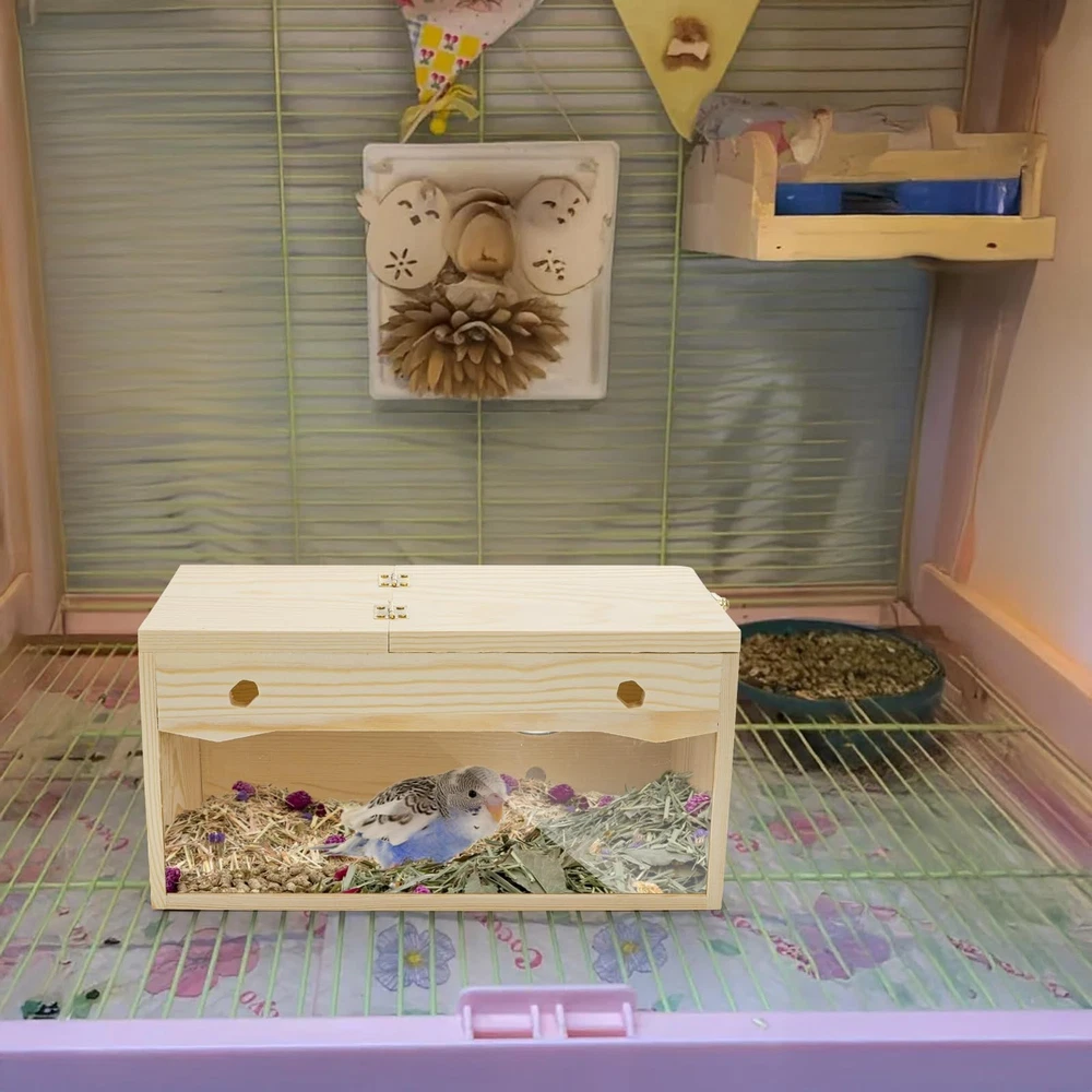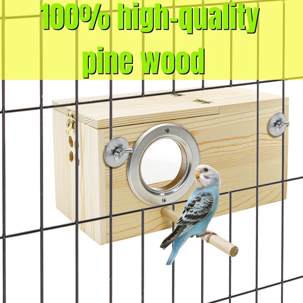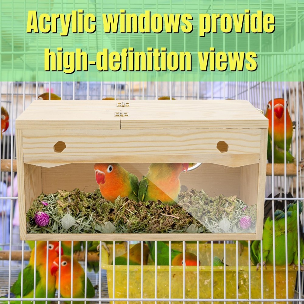 Featuring a medium size, which is 9.8" x 4.9" x 5", this nesting box offers ample space for birds to build their nests and raise their young. Equipped with a sturdy perch, bird box provides a cozy resting and playing area for your love bird. Crafted from high-quality pine wood, our bird breeding box ensures durability and a natural aesthetic that complements any home or aviary decor. This pine bird breeding box features a transparent acrylic cover, allowing you to observe the fascinating process of bird hatching at any time. 【Comfortable Resting】Featuring a medium size, which is 9.8" x 4.9" x 5", this nesting box offers ample space for birds to build their nests and raise their young. Equipped with a sturdy perch, bird box provides a cozy resting and playing area for your love bird. 【Durable Natural Pine】 Crafted from high-quality pine wood, our bird breeding box ensures durability and a natural aesthetic that complements any home or aviary decor. Create a safe and comfortable environment for your avian companions. 【Observation Friendly Design】 This pine bird breeding box features a transparent acrylic cover, allowing you to observe the fascinating process of bird hatching at any time. There are also four hexagonal holes on both sides of the box for decoration, which can increase both aesthetics and ventilation performance. 【Easy Maintenance】The design of this bird breeding box facilitates effortless cleaning and maintenance, ensuring a hygienic living space for your birds. Keep their habitat fresh and tidy with minimal effort. Witness the miracle of life unfolding right before your eyes. 【Versatile Usage】 Perfect for parakeets, cockatiels, and other small birds, the nesting box is a must-have for any bird enthusiast. This product is perfect for breeding, nesting, or simply providing a secure relax place for your avian pets.