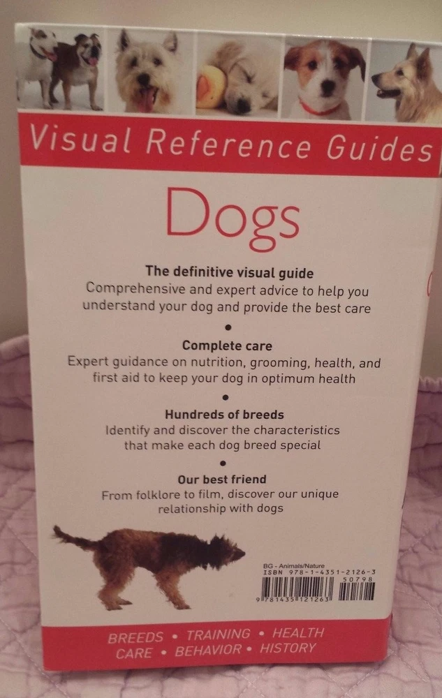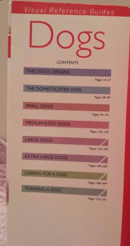 You are buying a soft cover edition of Visual Reference Guides; Dogs by Bruce Fogle. This general guides covers breeds, training, history, and care of dogs. The guide is divided by size of dogs and gives a general description of most dog breeds. Filled with photos that highlight points of breeds. Example: Cairn Terrier shows photos of 4 color types; Black, Wheaten, Brindle, and Cream. Each entry gives basics of breed characteristics, temperament, and origins. Photos are of actual book. We ship promptly upon receipt of payment. Thank you for considering this listing.