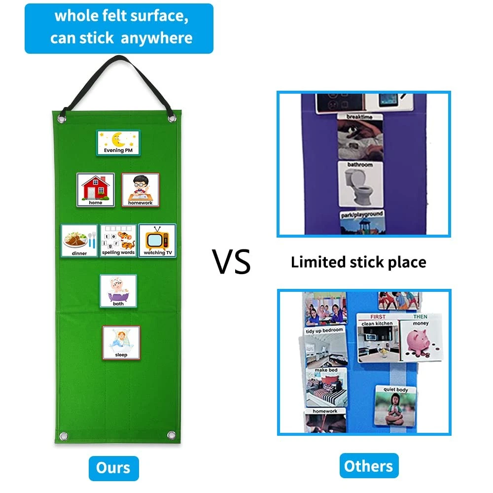 visual schedule pocket chart OUR FEATURES:The Visual Behavior Schedule Chart with a suitable sized clear bag with enough space to store your all cards,and there have 4 grommets can display it a few different ways. You can hang it horizontally or vertically and even fold it so it sits upright on the table or counter PACKAGE CONTENTS:1 pieces Felt Board Chart with 70 pieces visual behavior schedule cards and 1 pieces clear storage bag,1 strip and enough number of dot stickers PREMIUM QUALITY:The Daily Routine Chart is made by durable felt,Cards are made from sturdy,waterproof,durable does not tear RICH COMBINATION:Daily Visual Routine Chart consists of 70 different cards,including morning AM, Evening PM,school,home,zoo, shopping ,dancing,siging,field trip,dentist,park and more,which covers all aspects of life; Kids can put the completed tasks into the bag, they often rely on vision to gather information to understand their daily tasks PERFECT LEARNING TOOL:Children often rely on visuals to gather information to understand their daily task,when they see the pictures on the daily schedule card, their receptive communication will be stronger,encouraging them to complete daily tasks independently without constant verbal reminders