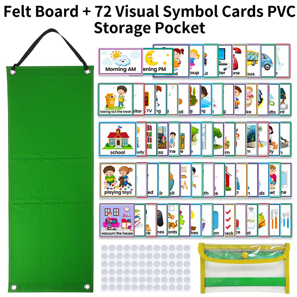 OUR FEATURES:The Visual Behavior Schedule Chart with a suitable sized clear bag with enough space to your all cards,and there have 4 grommets can display it a few different ways. You can hang it horizontally or vertically and even fold it so it sits upright on the table or counter PACKAGE CONTENTS:1 pieces Felt Board Chart with 70 pieces visual behavior schedule cards and 1 pieces clear storage bag,1 strip and enough number of dot stickers PREMIUM QUALITY:The Daily Routine Chart is made by durable felt,Cards are made from sturdy,waterproof,durable does not tear RICH COMBINATION:Daily Visual Routine Chart consists of 70 different cards,including morning AM, Evening PM,school,home,zoo, shopping ,dancing,siging,field trip,dentist,park and more,which covers all aspects of life; Kids can put the completed tasks into the bag, they often rely on vision to gather information to understand their daily tasks PERFECT LEARNING TOOL:Children often rely on visuals to gather information to understand their daily task,when they see the pictures on the daily schedule card, their receptive communication will be stronger,encouraging them to complete daily tasks independently without constant verbal reminders
