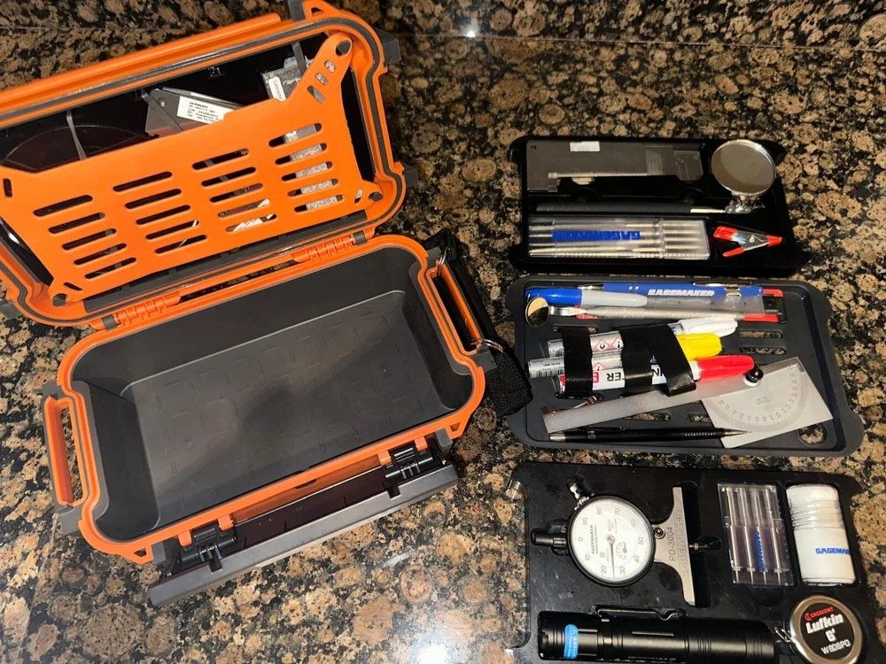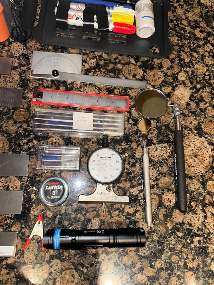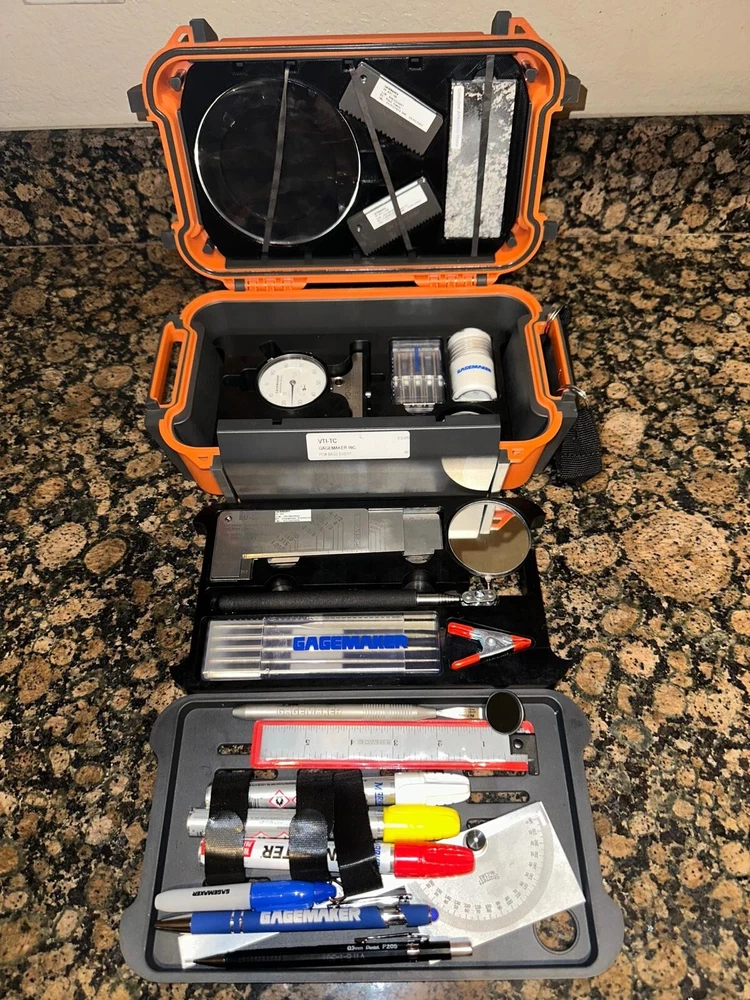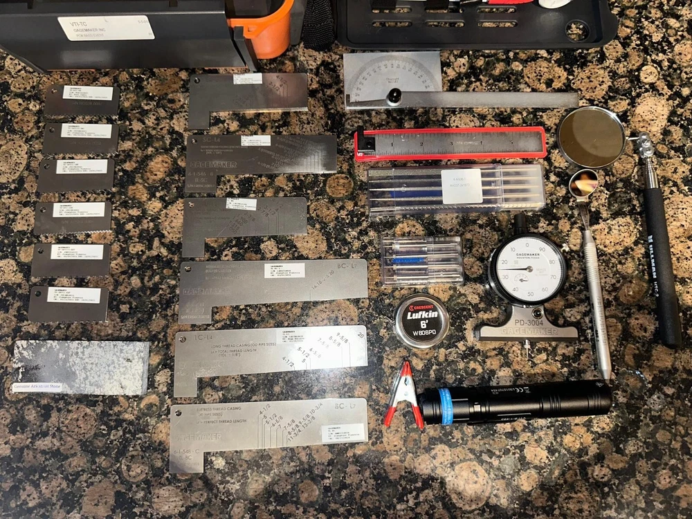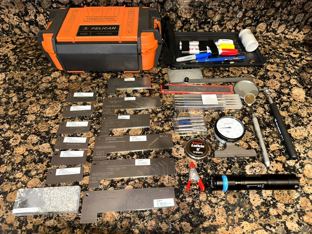 The Visual Thread Inspection Kit (VTI-TC) provides all the tools and visual aids required for a complete and thorough visual inspection of pipe tubing and casing connections. Visually identify imperfections and mechanical damage. Gagemaker has produced a slide show demonstrating how the various tools are used. The Gagemaker VTI-TC Kit inspects all internal & external tubing & casing threads: 8 Round 10 Round Buttress Proprietary Premium Semi-Premium 5B 5B1 The Visual Thread Inspection Kit provides the user with all the tools necessary to detect, evaluate, and classify all internal and external tubing & casing threads. The Visual Thread Inspection Kit is supplied in a custom 3-layer Pelican case and includes the following : Length Templates: Lc, L4, L7, PTL, A1 Triangle, BC, SC, LC, EU, & NU (all sizes & styles) External & Interal Thread Form Profiles: LC, SC, BC, EU, & NU Protractor High-powered Flashlight (100+ ft-Candle) Combination Flexible Pi & Length Tape Cotton for Detecting Burrs Utility Clamp 6" Precision Hook Scale Machinist Scale Field Safe Magnifier Marking Instruments 2" Telescoping Inspection Mirror Miniature Mirror Arkansas Honing Stone Thread Picks Diamond Files PD-3004 Pit Depth Gage