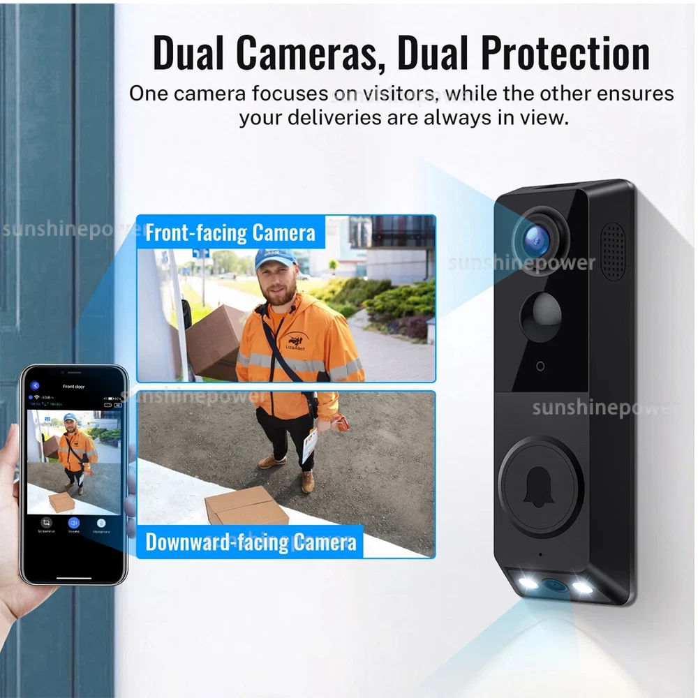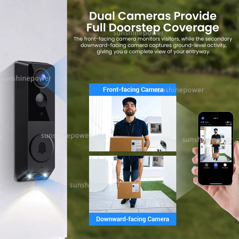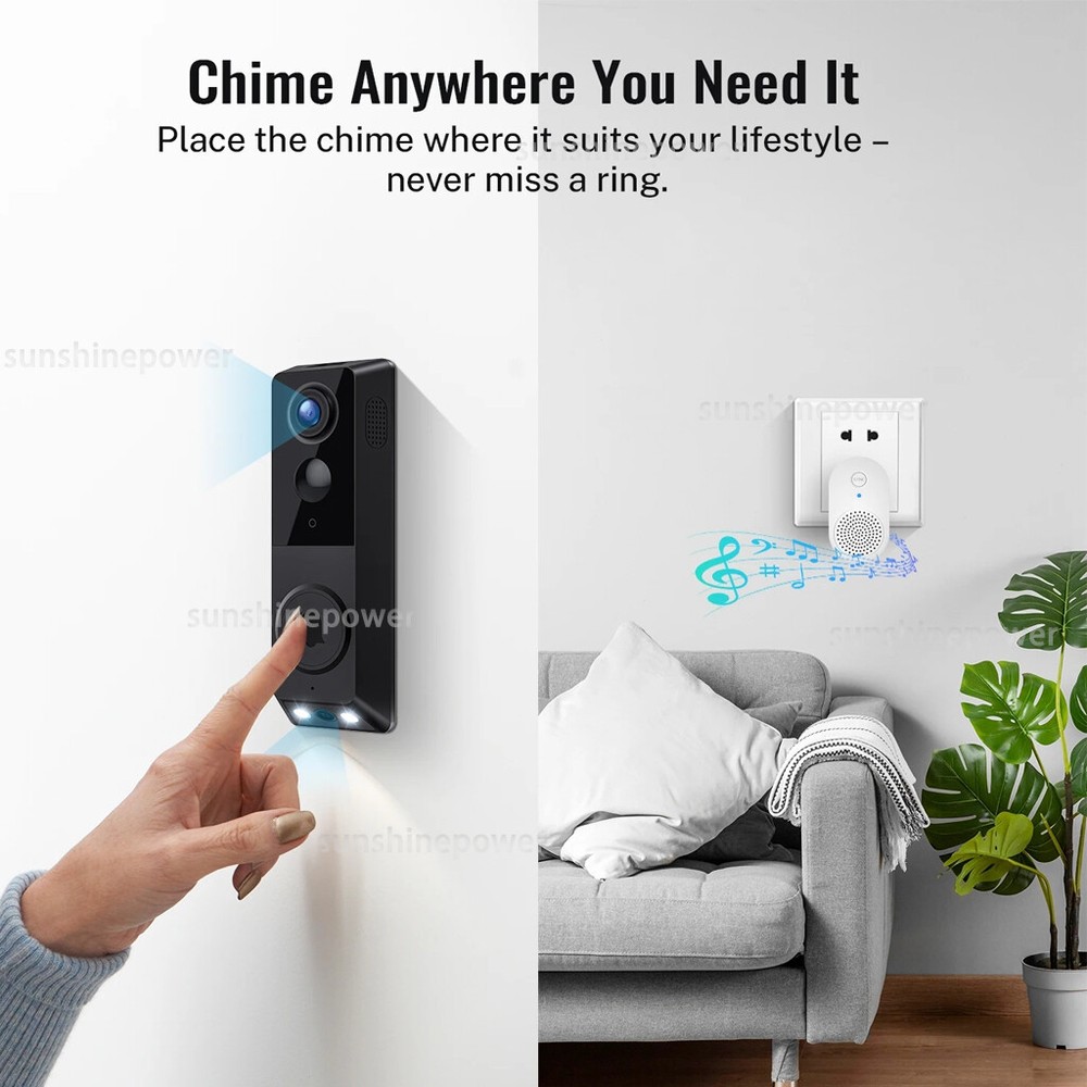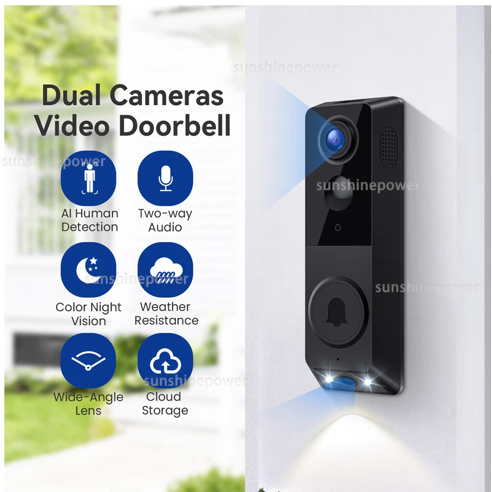 Product Description Setup Tips: 1. Please first remove the battery door to access the insulation tape located at the bottom of the battery, and remove it accordingly. 2. The included batteries are rechargeable, and the doorbell features a USB charging port at its rear. Be aware that a charging adapter is not provided. 3. Ensure the batteries are fully charged before mounting the doorbell. Use the provided USB cable and a DC 5V 1A or 5V 2A power adapter (a phone charger will suffice) to charge the device. 4. The indoor chime is equipped with a USB port, so you will need an existing USB adapter or USB outlet for power. 5. This wireless video doorbell is ONLY compatible with 2.4GHz Wi-Fi networks. Please make sure to use a high-speed, stable Wi-Fi connection. Smart Video Doorbell Camera with Chime, AI Smart Human Detection, Cloud Storage, HD Live Image, 2-Way Audio, Night Vision, with Batteries How to set up the wireless doorbell camera 1. Download App, sign up an account and log in. 2. Open the battery cover of the door bell camera, and remove the insulation tape at the bottom of batteries. 3. Press and hold the doorbell button till it flashes red, and it will say "entering pairing mode" 4. Tap "add device" in app, confirm the doorbell is flashing red, then tap "yes" 5. Enter your WIFI name and password. It supports only 2.4GHz WIFI. Then confirm again your WIFI name and password, tap "confirm" 6. It will show a QR code on your phone. Use your doorbell camera to scan this code. Then it will start pair. When it says "registration successful", tap "confirm", then your doorbell is setup in your account. How to connect the smart video doorbell with wireless charm Set up the doorbell camera in App first. Press the button on chime, indicator will flash blue. Press the doorbell button, while the chime is flashing blue. Package include: 1 x Doorbell 1 x USB Chime 1bag x Screws 1 x Adhesive Tape 1 x User Manual Choose me, every purchase is a surprise! Payment Shipping Return Feedback Customer Service We accept Ebay Payment . All major credit cards are accepted through secure payment processor Ebay. Payment must be received within 7 business days of auction closing. We ship to your eBay address . Please make sure your eBay address is correct before you pay. Package was ship out from Shenzhen,China . Orders will be processed and dispatched within 48 hours after payment is clear. You will get the product in 30-45 working days . Delivery may be delayed during weekends and holidays. We only ship to confirmed eBay addresses . Your eBay address MUST MATCH your Shipping address. We do not charge VAT, any taxes will be the buyer responsibilities. We offer 30 days return policy. Please contact us within 14 days from the date you receive your order if you have any issues with the product and would like to return. All returned items MUST BE in the original packaging and you MUST PROVIDE us with the return shipping tracking number, specific reason for the return, and your eBay ID. We will refund YOUR FULL WINNING BID AMOUNT , upon receipt of the item in its original condition and packaging with all components and accessories included, AFTER BOTH Buyer and Seller cancel the transaction from eBay. OR , you may choose to have a replacement. Buyer is responsible for return shipping cost. If you have any questions, please feel free to contact us , we will try our best to Provide the best service for you. We will leave you positive feedback on receipt of payment and would appreciate you leaving us 5 star score positive feedback as we are new to ebay and it really helps. Before leave us negative feedback for this order, we still hope you can give us a chance, please contact us firstly . Thank you very much! We commit to offer customer the best products and services. If you have any problems, please contact us via eBay message at any time. All message will be replied within 1 business day. If you don't receive any reply, please kindly send your message again, we must reply it asap. We really feel very happy to make you content for our responsible service. Payment We accept Ebay Payment . All major credit cards are accepted through secure payment processor Ebay. Payment must be received within 7 business days of auction closing. We ship to your eBay address . Please make sure your eBay address is correct before you pay. Shipping Package was ship out from Shenzhen,China . Orders will be processed and dispatched within 48 hours after payment is clear. You will get the product in 30-45 working days . Delivery may be delayed during weekends and holidays. We only ship to confirmed eBay addresses . Your eBay address MUST MATCH your Shipping address. We do not charge VAT, any taxes will be the buyer responsibilities. Return We offer 30 days return policy. Please contact us within 14 days from the date you receive your order if you have any issues with the product and would like to return. All returned items MUST BE in the original packaging and you MUST PROVIDE us with the return shipping tracking number, specific reason for the return, and your eBay ID. We will refund YOUR FULL WINNING BID AMOUNT , upon receipt of the item in its original condition and packaging with all components and accessories included, AFTER BOTH Buyer and Seller cancel the transaction from eBay. OR , you may choose to have a replacement. Buyer is responsible for return shipping cost. Feedback If you have any questions, please feel free to contact us , we will try our best to Provide the best service for you. We will leave you positive feedback on receipt of payment and would appreciate you leaving us 5 star score positive feedback as we are new to ebay and it really helps. Before leave us negative feedback for this order, we still hope you can give us a chance, please contact us firstly . Thank you very much! Customer Service We commit to offer customer the best products and services. If you have any problems, please contact us via eBay message at any t