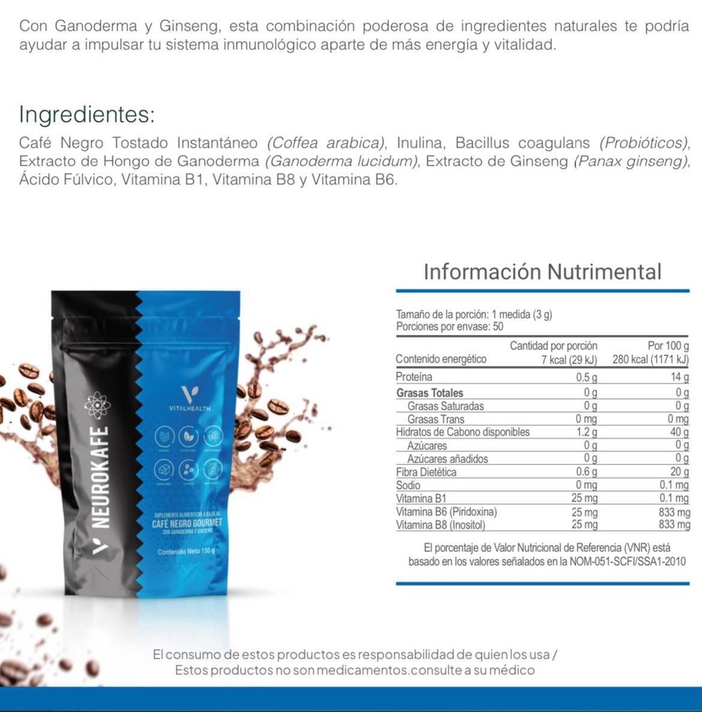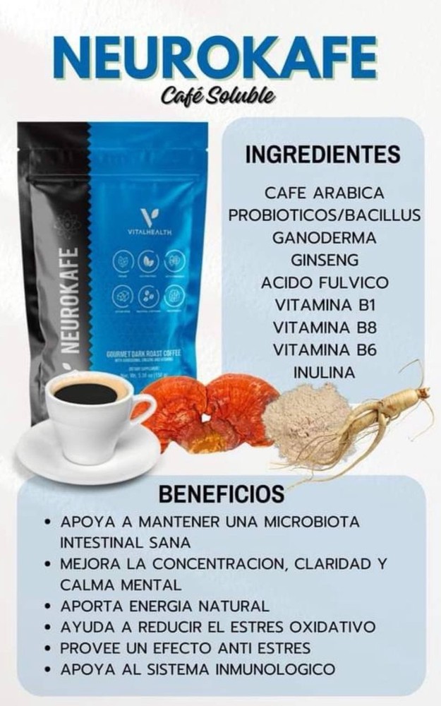El café gourmet, NeuroKafé se convierte en una bebida funcional, ideal para quienes quieren rendir más, pensar mejor y mantenerse enfocados sin los altibajos del café convencional. ingrediente principal de NeuroKafé es el extracto de hongo Lion’s Mane (Melena de León). Este hongo es ampliamente conocido por sus beneficios para el cerebro y el sistema nervioso, ya que: • Estimula el crecimiento de nuevas conexiones neuronales (neurogénesis). • Mejora la memoria, la concentración y la claridad mental. • Ayuda a reducir el estrés y la fatiga mental.