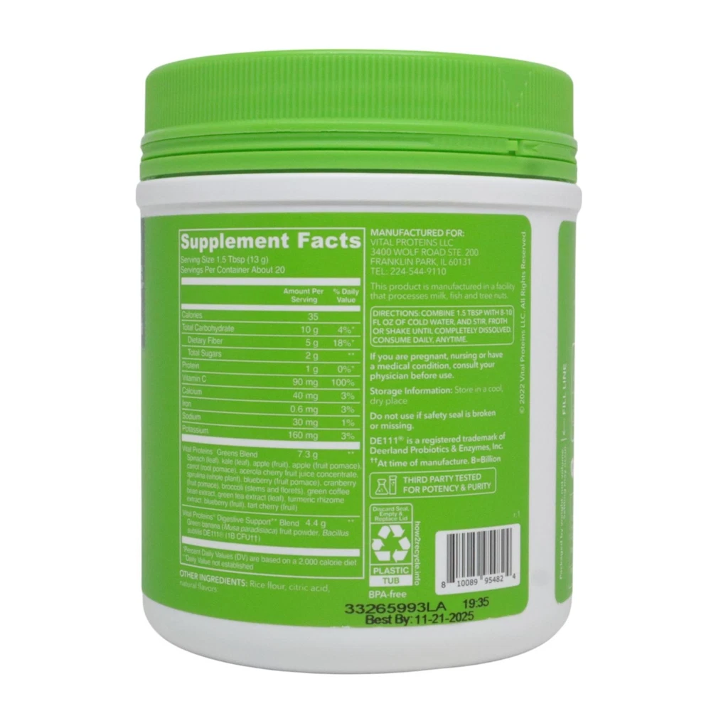 Vital Proteins Daily Greens to Support Healthy Digestion - Green Apple - 9.3 oz Vital Proteins Daily Greens is a delicious, plant-based supplement that can easily be incorporated into your daily wellness routine. Available in Original (unflavored) and Green Apple, this light and refreshing greens supplement is loaded with support for your immune system and digestive health—a true plant-based multitasker. Features Getting your greens just got tastier with a light and refreshing apple flavor derived from real apples This powerful, nutrient-rich blend contains 2 servings of fruits and vegetables^ and zero wheatgrass Probiotics and plant fiber supports digestive health and a healthy immune system** by increasing daily intake of vitamins, minerals and antioxidants** These collagen-free Vital Proteins Daily Greens provide a boost of vitamin C which supports collagen intake making this the perfect supplement to pair with collagen peptides Start your day off on the right foot by combining 1.5 TBSP with 8-10 fl oz of cold water, and stir, froth or shake until completely dissolved Details Product Dimensions: 4.8 x 3.74 x 3.7 inches Item Weight: 0.71 pounds Shipping Weight: 0.71 pounds Manufacturer: Vital Proteins Item model number: 0810089954824 Item MPN: 0810089954824 Item part number: 0810089954824 Fast & Free Shipping Orders are shipped out within 2-3 business days usually and delivered to your doorstep as quickly as possible. Competitive Pricing Our competitive prices are some of the lowest that you will find on the internet. Rest assured that you're getting a good deal when purchasing from us. 30-day Money Back Guarantee We are committed to making sure that you leave this transaction satisfied. If you're unhappy with the product for any reason, you may return it back for your money-back or a replacement if available within 30 days.