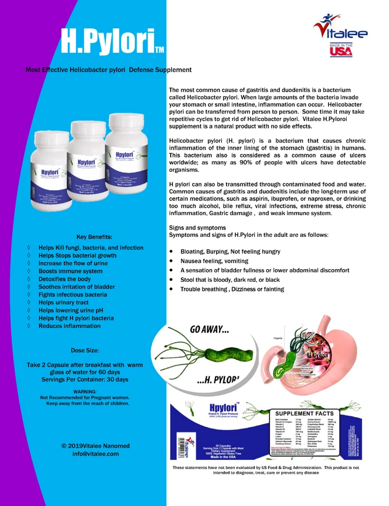 Helicobacter pylori (H. pylori) is a bacterium that causes chronic inflammation of the inner lining of the stomach (gastritis) in humans. This bacterium also is considered as a common cause of ulcers worldwide; as many as 90% of people with ulcers have detectable organisms. This product may help you get rid of Leak Gut over time. Key Benefits: May help Kill fungi, bacteria, and infection, may help stop bacterial growth, increase the flow of urine, boosts immune system, detoxifies the body, soothes irritation of bladder, fights infectious bacteria. Vitalee Helicobacter pylori supplement may help get rid of H. Pylori bacteria in 60-90 days evidenced by H.Pylori stool/breath test report. Be advised that some time Helicobacter pylori test can be falsely positive or negative and must be discussed with your primary physician. H.Pylori is a stubborn ailment buy it upon confirmed H.Pylori stool/breath test. When you start using Helicobacter pylori supplement your results may vary depending on the severity and length of this ailment. While some people see changes in as little as 60 days and it may take others longer to see a difference. Note : All modern medicine for treating H.Pylori such as Tetracycline , metronidazole , Clarithromycin , Ranitidine, or Zantac antibiotic are likely to cause stomach pain. These statements have not been evaluated by the Food and Drug Administration. This product is not intended to diagnose, treat, cure, or prevent any disease.