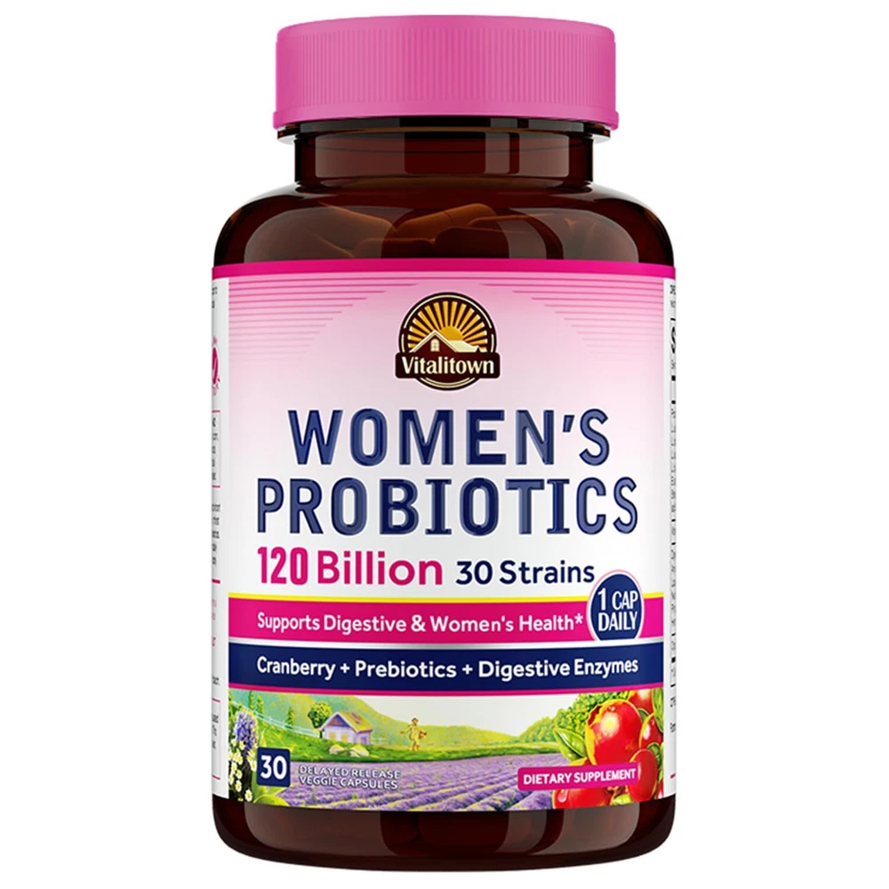 120 Billion CFUS & 30 Strains Per Capsule: Vitalitown Women’s Probiotics contains 120 billion CFUs and 30 proven strains, providing the highest number of CFUs and the most researched probiotics strains. The formula is specially designed for women's specific health needs with unsurpassed quality & value. All Vitalitown products are 100% vegan and contain no GMOs, gluten, dairy, soy, eggs, fish, shellfish, tree nuts, or peanuts. Pro + Pre + Digestive Enzymes + Organic Cranberry: Our Once Daily Probiotics for Women is enhanced with organic cranberry extract and natural plant-based digestive enzymes as well as water-soluble prebiotics fiber to help support the gut, immune and vaginal health.* All the ingredients work synergistically to maximize their strength and maintain natural gastrointestinal & urinary tract balance.* Take Care of Women’s Health*: Cranberry is considered to be a superfood due to its high nutrient and antioxidant content. Organic cranberry extract is added in this formula with powerful antioxidants to help protect your body from free radicals.* It helps support immune health and urinary tract detox and protection without the sugar and calories.* Shelf Stable & Delayed Release: Our shelf-stable probiotics is protected in a moisture-tight bottle to ensure probiotics stability. Delayed-Release Technology allows probiotics to survive stomach acid and reach deep into the intestine. Refrigeration recommended but not required. Made in the USA: All Vitalitown products are manufactured and packaged in the USA. The products are tested by the third party for purity and potency to ensure that each and every bottle of Vitalitown products represents the highest standards.