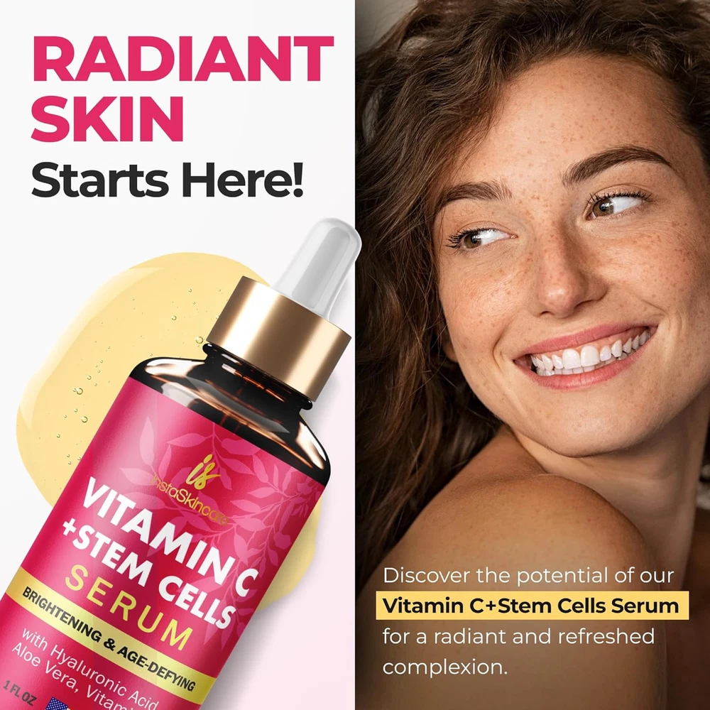 Gentle Skin Revitalization – InstaSkincare Vitamin C Serum for Face with Hyaluronic Acid is packed with antioxidants. Organic Vitamin C Serum evens skin tone, visibly reduces the appearance of discoloration & dull skin, promoting a healthy glow. Powerful Age-Defying Effect - Face Vitamin C Serum minimizes the appearance of fine lines & wrinkles by stimulating collagen production. Regular use of our skin serum visibly enhances skin health & appearance. Optimal Skin Health - Vitamin C serum for face can significantly treat & defend skin from further damage. Use in the morning before moisturizer to protect skin from the negative impact of sun, pollution & makeup. Natural & Safe Formula - Product safety & highest quality are our top priorities. Our Vitamin C face serum is made only from natural & high-quality ingredients: Vitamins C & E, Hyaluronic Acid & Aloe Vera. Safe even for the most sensitive skin! Proudly Made in the USA by a Family-owned and Operated business, dedicated to providing top-quality skincare with premium ingredients and exceptional production standards. Product Description