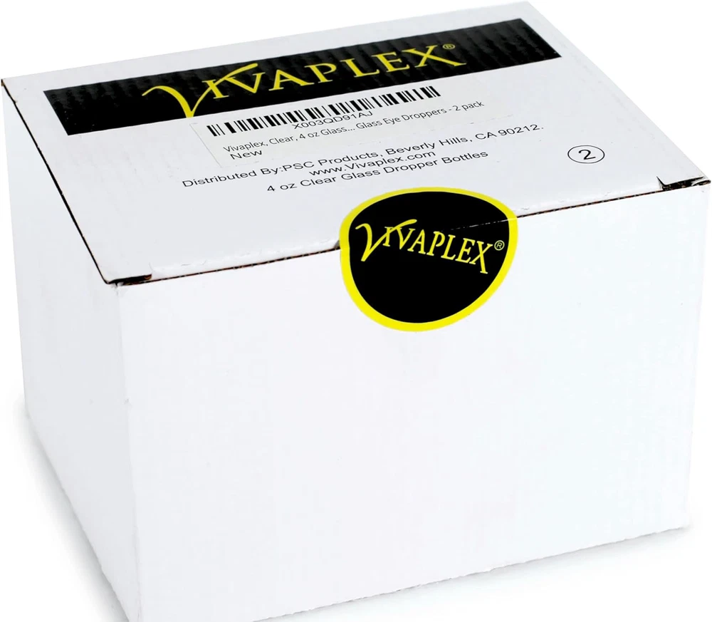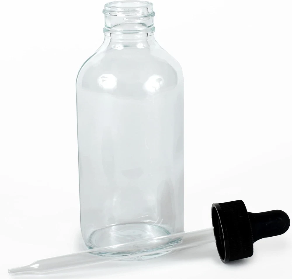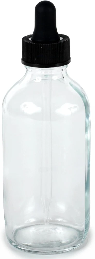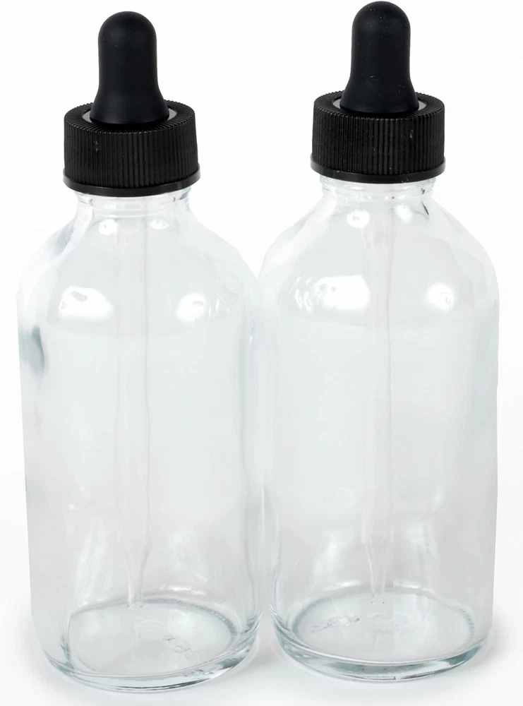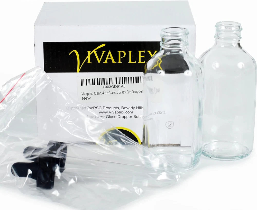 Vivaplex, Clear, 4 oz Glass Bottles, with Glass Eye Droppers - 2 pack 2 - 4 oz, Clear Glass Bottles, with Glass Droppers, and Black Caps Perfect for essential oils, perfume oils, or other liquids Safe, secure and convenient packaging Perfect for travel, and conveniently fits in your purse These high quality clear glass bottles with glass eye droppers, are perfect for storing your essential oils, perfumes or colognes. The convenient size makes it perfect for travel. The Eye Droppers allow for the perfect amount of product to be used every time.
