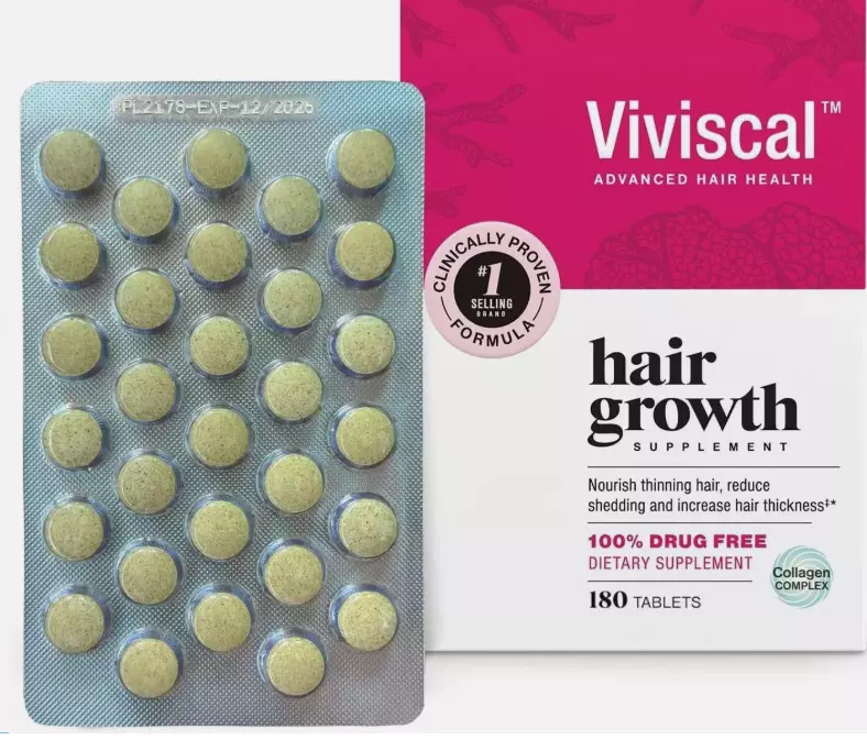 Item description from the seller: Viviscal Women's Hair Growth Dietary Supplement with Collagen Complex is a popular product designed to support healthy hair growth in women. Here are the key details: Key Features : Targeted for Women's Hair Health : Specifically formulated to help nourish thinning hair and promote healthy hair growth. Collagen Complex : Contains a marine complex (AminoMar C™) that is combined with Collagen and other nutrients. Collagen supports hair structure, which is key to promoting growth and strength. Vitamins & Minerals : The formula includes important nutrients such as: Biotin : Supports hair strength and helps prevent hair loss. Vitamin C : An antioxidant that supports collagen formation and overall hair health. Iron : Important for normal hair function and growth. Zinc : Supports hair regeneration and overall scalp health. Vitamin D : May support the growth of new hair follicles. Benefits: Promotes Hair Growth : Viviscal is known to be effective in supporting hair regrowth, especially for women with thinning hair due to hormonal changes, stress, or aging. Nourishes from Within : The supplement aims to nourish hair follicles from the inside out with essential nutrients. Fuller, Thicker Hair : Regular use may result in visibly thicker and healthier-looking hair. Dosage: Serving Size : 2 tablets daily. 180 Tablets : This bottle provides a 3-month supply (taking 2 tablets daily). Usage: For best results, Viviscal should be taken consistently for several months. Visible results typically appear after 3-6 months of regular use, although individual results can vary. Safety: No Artificial Colors or Preservatives . Suitable for women 18 years and older. It's generally well-tolerated, but individuals with allergies to fish or shellfish should avoid this supplement due to the marine ingredients. Other Considerations: Non-GMO, Gluten-Free : Viviscal is free from genetically modified organisms and gluten, making it suitable for people with dietary sensitivities. This supplement is often recommended for women experiencing hair thinning or loss, especially those seeking a non-invasive solution to promote hair growth.