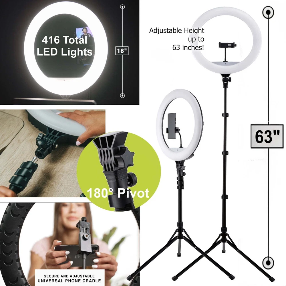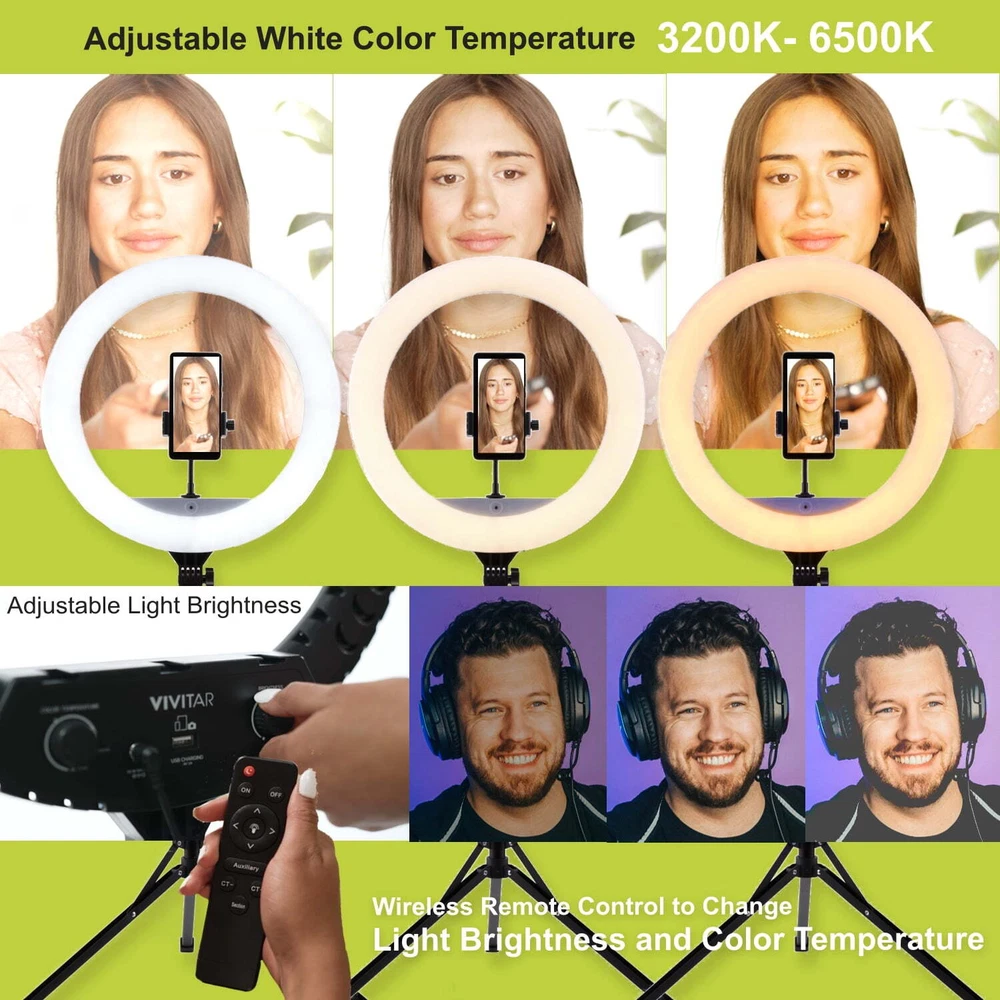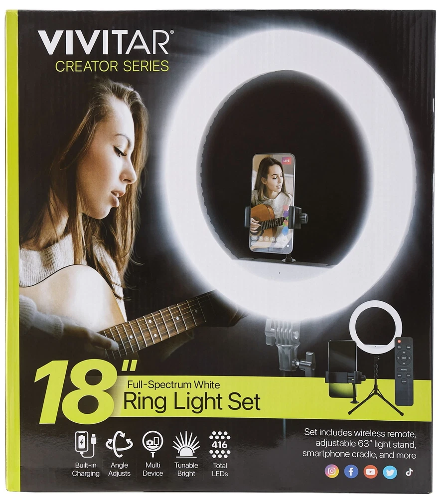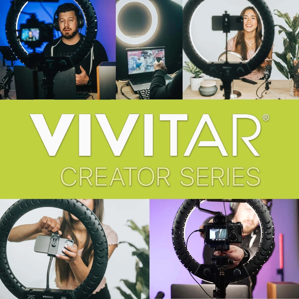 3-in-1 Lighting Kit: This selfie ring light with a stand and phone holder is an ideal tool for photographers, streamers and video bloggers who want the right light conditions wherever they shoot. This LED ring light set comes with an 18-inch ring light, adjustable light stand, phone stand with gooseneck mount, wireless remote and a carry bag. Light Up Your Space: Our LED right light for vlogging and streaming is bright, easy to use and portable to help you get just the right lighting to minimize shadows while keeping your phone safely in place during recording Adjustable Brightness: Thanks to the wireless remote control, the Vivitar ring light adjusts its brightness to match your space. It’s simple to use and comes with a wireless shutter release to help you get the perfect shots every time. Foldable and Portable: The light stand gives you the option to increase the height to up to 63 inches to accommodate proper framing. A gooseneck phone holder allows you get the right angle. This kit includes a durable black carrying bag that's ideal for storing or carrying the ring lights with you on the go. Versatile and Multi-Purpose: This stationary camera light for video recording is compatible with a wide variety of phones and provides an ideal setup for doing makeup on the go, taking photos, recording videos, live streaming and more. Record, Stream and Make Videos in Perfect Lighting With Vivitar LED Ring Light Kit Adjustable Stand and Brightness for Seamless Use Our dimmable ring light offers the right balance for your photo and video lighting. The adjustable ring light stand lets you adjust the height up to 63 inches to center taller or wider shots. Use the wireless remote to adjust the brightness level. Portable With Quick Release Cradle for Phones The phone gooseneck holder fits both iOS and Android phones to keep them securely in place while giving you the flexibility to adjust the angle for perfect shots. This 18-inch ring light with stand is ideal for use at home, outdoors, in studios or on photoshoots. Count on the integrated USB charger for dependable power. Portable Vivitar ring light with 63" stand and phone holder USB powered to keep your phone charged Includes a durable soft carry bag to take the camera light anywhere Phone stand offers wide compatibility for most devices Reduces shakiness and maintains stability when recording Wireless shutter release for phone helps make taking photos easier Sleek design in black allows for the perfect video setup