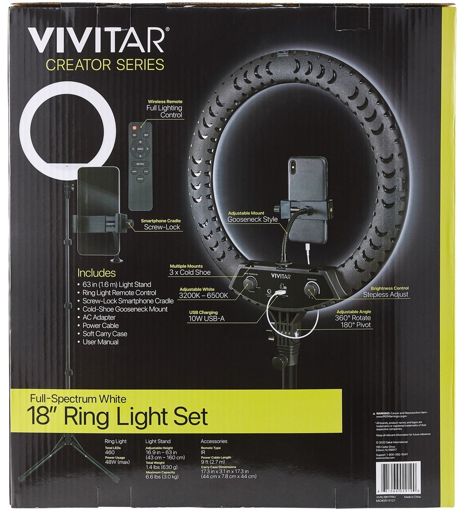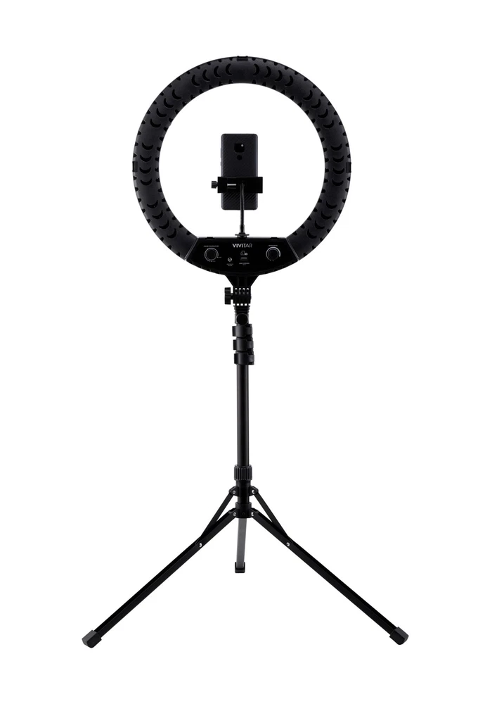 3-in-1 Lighting Kit: This selfie ring light with a stand and phone holder is an ideal tool for photographers, streamers and video bloggers who want the right light conditions wherever they shoot. This LED ring light set comes with an 18-inch ring light, adjustable light stand, phone stand with gooseneck mount, wireless remote and a carry bag. Light Up Your Space: Our LED right light for vlogging and streaming is bright, easy to use and portable to help you get just the right lighting to minimize shadows while keeping your phone safely in place during recording Adjustable Brightness: Thanks to the wireless remote control, the Vivitar ring light adjusts its brightness to match your space. It’s simple to use and comes with a wireless shutter release to help you get the perfect shots every time. Foldable and Portable: The light stand gives you the option to increase the height to up to 63 inches to accommodate proper framing. A gooseneck phone holder allows you get the right angle. This kit includes a durable black carrying bag that's ideal for storing or carrying the ring lights with you on the go. Versatile and Multi-Purpose: This stationary camera light for video recording is compatible with a wide variety of phones and provides an ideal setup for doing makeup on the go, taking photos, recording videos, live streaming and more. Record, Stream and Make Videos in Perfect Lighting With Vivitar LED Ring Light Kit Adjustable Stand and Brightness for Seamless Use Our dimmable ring light offers the right balance for your photo and video lighting. The adjustable ring light stand lets you adjust the height up to 63 inches to center taller or wider shots. Use the wireless remote to adjust the brightness level. Portable With Quick Release Cradle for Phones The phone gooseneck holder fits both iOS and Android phones to keep them securely in place while giving you the flexibility to adjust the angle for perfect shots. This 18-inch ring light with stand is ideal for use at home, outdoors, in studios or on photoshoots. Count on the integrated USB charger for dependable power. Portable Vivitar ring light with 63" stand and phone holder USB powered to keep your phone charged Includes a durable soft carry bag to take the camera light anywhere Phone stand offers wide compatibility for most devices Reduces shakiness and maintains stability when recording Wireless shutter release for phone helps make taking photos easier Sleek design in black allows for the perfect video setup