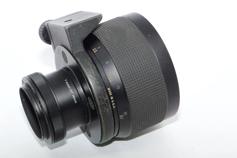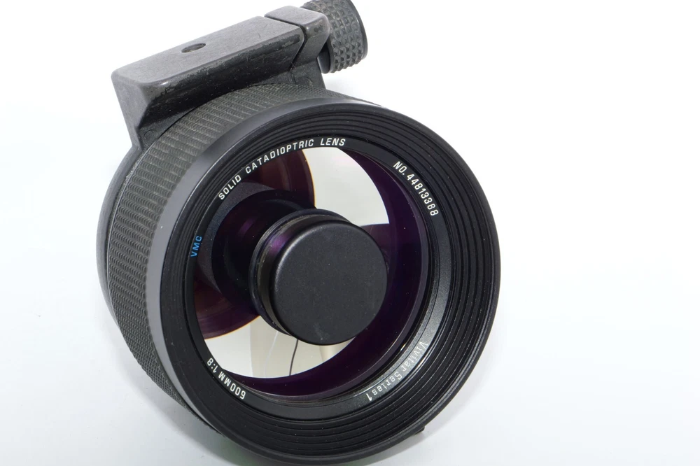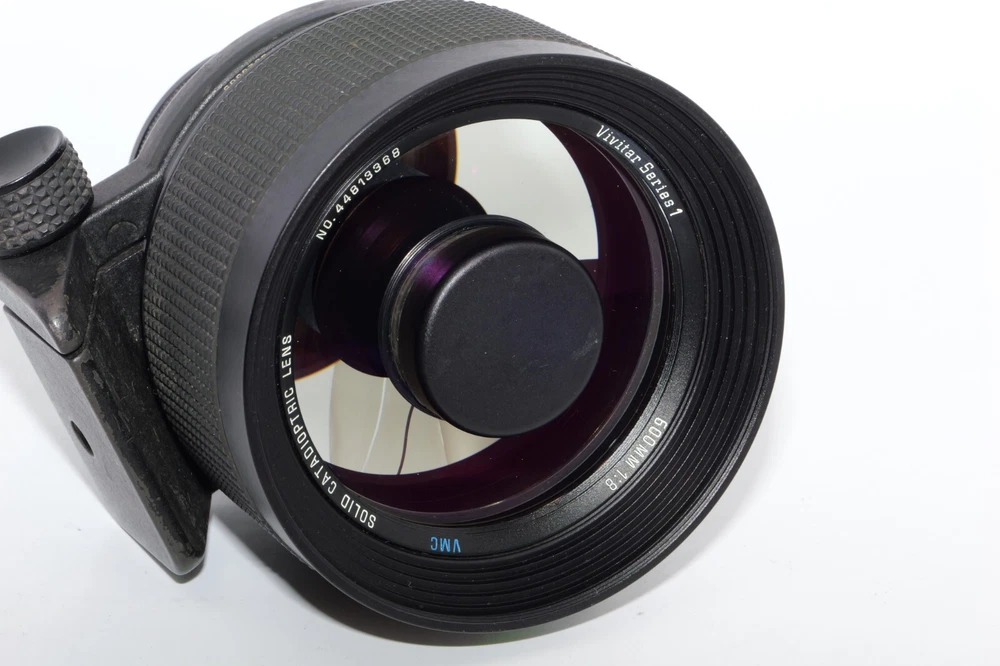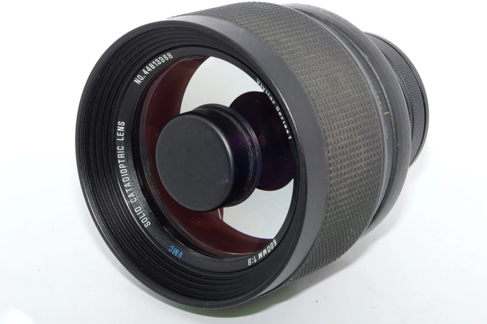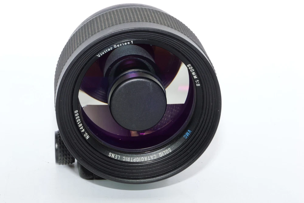 Vivitar Series 1 Solid Catadioptric 600 mm f/ 8 MIRROR manual focus lens. Made in USA. Serial # 44813368. This lens will fit Canon R mount mirorless cameras with the included Fotodiox Canon R t-mount adapter. Lens will fit many 35mm manual focus cameras. This lens has a universal t-mount, and will fit most camera brands with the proper t-mount adapter. Also a great lens to use on most mirrorless digital cameras with the proper adapter. This is a unique mirror telephoto lens that has fixed f/8 lens aperture. Quality solid cat optics, and heavy duty build. Focusing with this lens is quick and easy. Uses 35.5mm rear mounted filters. This 600mm solid cat lens is only 5 inches tall when focused at infinity. Minimum focus distance is about 9 meters. Lens is Ex- or 7.5 of 10 cosmetic condition. No dings or dents. Clean glass. Clean mirror without any separations. Smooth focus. This very compact heavy duty lens is seldom seen lens and makes for a fantastic long telephoto lens for 35mm film cameras, dslr cameras, or digital mirrorless cameras with the correct adapter. Lens comes with case (some foam on the inside of the case is deteriorated from age), lens hood, rear 35.5mm UV, red, ND4X, and yellow filters, & new Canon R t-mount adapter, caps. Sells with NO RESERVE at price of $395 . I have more SLR lenses, Medium and Large Format cameras, lenses and accessories on my other auctions and E-Bay Store.