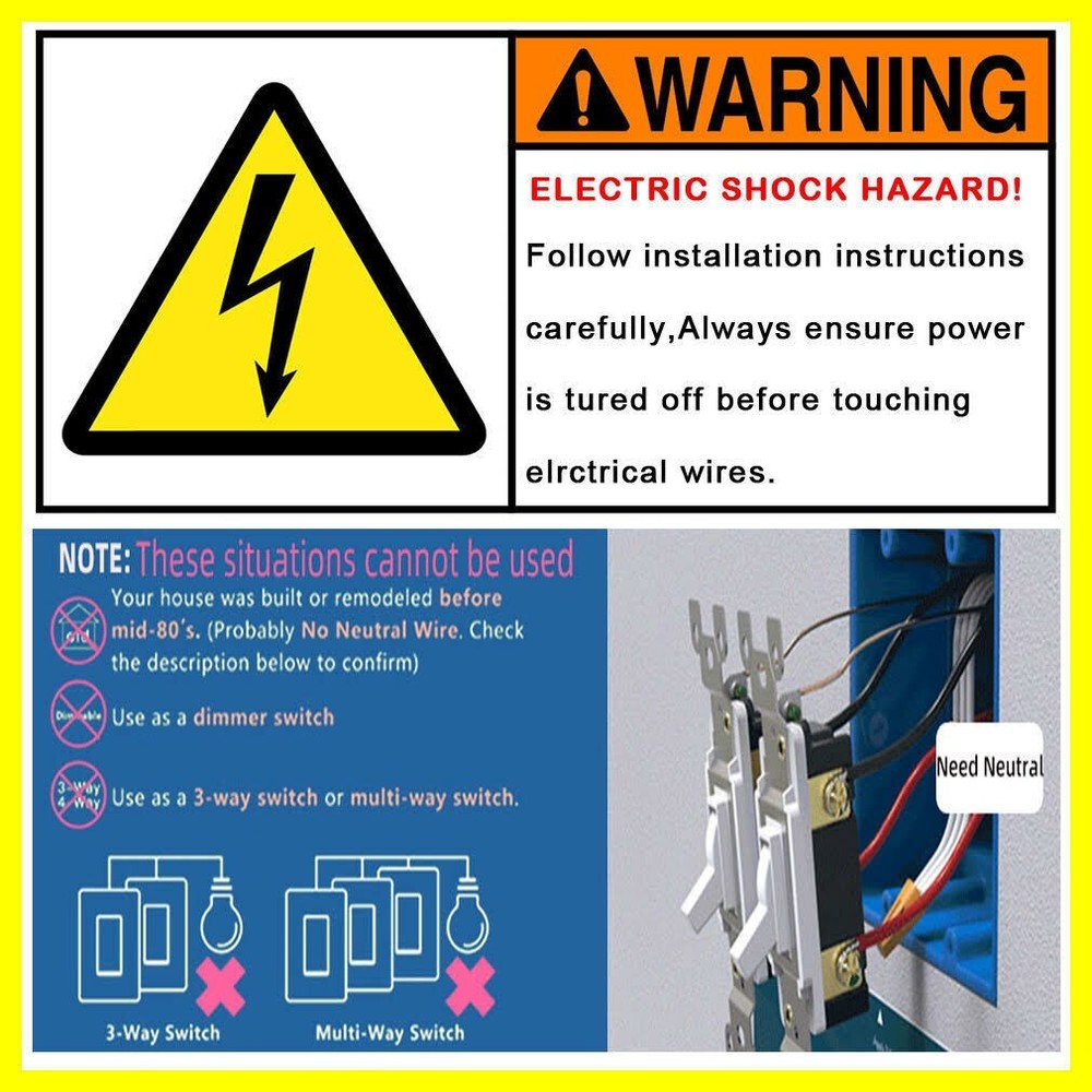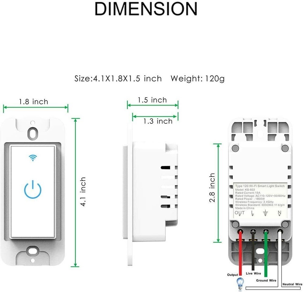 Features: 1. Wi-Fi Enabled Smart Light Switch, Control your lights from anywhere 2. Hands-free lighting control with Amazon Alexa and Google Home 3. Set your favorite lighting for an entire room with a single touch 4. Lights turn on while you aren't home, keep your home safe by using App 5. Reliable Performance enable you to enjoy the benefit of the smart home technology Specifications: Power supply: Neutral + Live wire Rated Current: 15A Rated Voltage: AC110V-125V~50/60Hz Rated Power: INC 1650W(Max) LED 300W(Max) Wireless Standard: IEEE802.11b/g/n Working frequency: 2.4GHz Safety: WEP/WPA-PSK/WPA2-PSK Encryption: WEP/AES/TKIP Static power loss: ≤0.5W Working Temp:-20゜C~75゜C Humidity: <95% Control Distance : no limitation Easy to Set Up 1. Download the “Smart life” from App Store or Google Play store. 2. Connect your mobile device to your 2.4GHz Wi-Fi network. 3. Launch “Smart life” and follow the wiring steps provided. 4. Connect the Smart Switch to your home network. 5. If you don’t know how to install the switch, or don’t know how to connect to wifi or Alexa, please feel free to contact us. Kindly Remind: 1. Live wire and neutral wire are required. 2. We recommend asking professional electrician to install. 3. Support 2.4 GHz Wi-Fi Only. 4. WiFi name and password should only contain letters and numbers. No special symbols allowed. 5. Our switch is one-way switch, can't be compatible with 3-way switch box. 6. If you have any problem in installation and use, please contact us any time by checking Your Orders and clicking Contact Seller On Apr 22, 2025 at 00:18:36 PDT, seller added the following information: