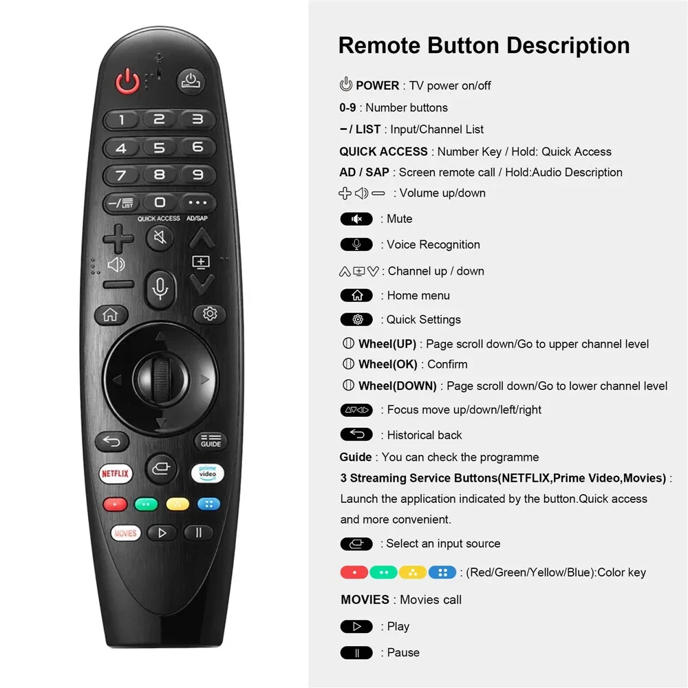【Applicable TV Series】 Replacement magic voice remote control fit for LG Smart TVs 2017 2018 2019 2020 Models Only: OLED Models: ZX, WX, GX, CX, BX, W9, E9, C9, B9, W8, E8, C8, B8, NanoCell Models: SM99, SM95, SM90, SM86, SM81, NANO99, NANO97, NANO95, NANO91, NANO90, NANO86, NANO85, NANO81, 4K UHD Models: UM80, UM75, UM73, UM71, UM6970, UN85, UN81, UN80 UN74, UN73, UN71 Series etc. 【Powerful Magic Remote】 With point, click, scroll functions, you can select the functions easily by moving and clicking the curson,this universal magic remote control for LG is like a air mouse. For LG akb75855501 remote also comes with voice control and 3 hot-keys, NETFLIX, Prime Video, Movies. You can also use Alexa and Google Voice Assistant, you'll find your content faster than ever before. 【Easy To Pair】 Notice: If you don't pair this lg tv remote,you can use most of this MR20GA remote control's button functions,but you don't use pointer function and voice function. Pair Steps: Turn on the TV and insert 2*AA 1.5V batteries for the remote . After about 20 seconds, point the remote toward the TV, then press the Wheel (OK). The remote control will be registered automatically, and the pairing completion message is displayed on the TV screen. (Note: batteries are not included) 【Accurate Control & Fast Response】 New upgraded smart chip, feature with over 40 feet farther transmitting distance, stable performance, easily replace missing or damaged remote,keep the same full control functionality of your original lg tv remote control. 【Premium Material】 The remote control for lg smart tv remote is made of high quality ABS plastic and silicone,so that makes the remote very comfortable and durable, the buttons are soft and sensitive.