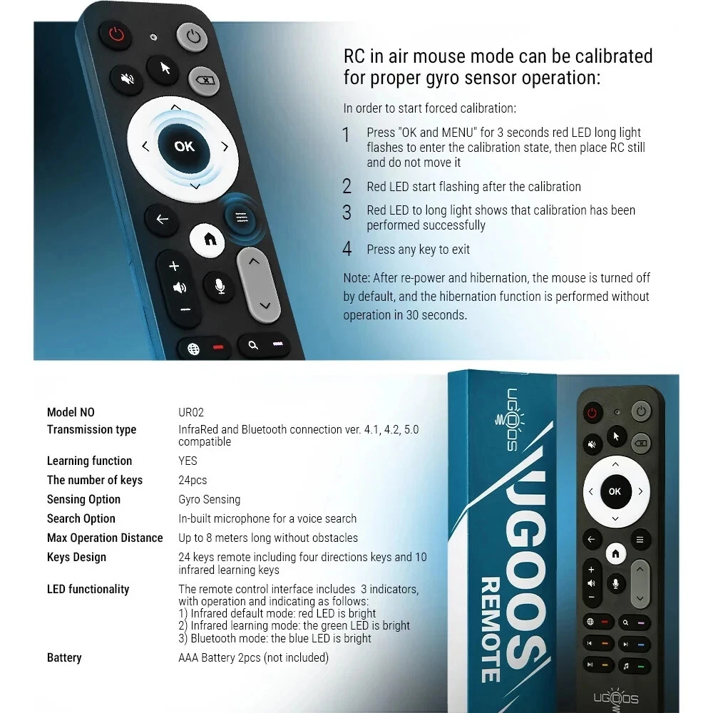 BT Voice Remote Control Replacement for Ugoos TOX1 TOX3 TOX4 AM8 PRO AM6B PLUS X4 X4Q Cube Pro Extra TV Box Original Ugoos UR02 New BT RemoteControl ready, The RC 100% suitable for following models: - Ugoos AM8/AM8 Pro - Ugoos AM7 - Ugoos AM6B Plus - Ugoos AM6 Plus/AM6 Pro/AM6 - Ugoos X4Q Cube/X4Q Pro/X4Q Plus/X4Q Extra - Ugoos X4 Cube/X4 Pro/X4 Plus - Ugoos X3 Cube/X3 Pro/X4 Plus - TOX1/TOX3/TOX4