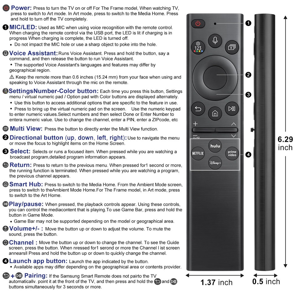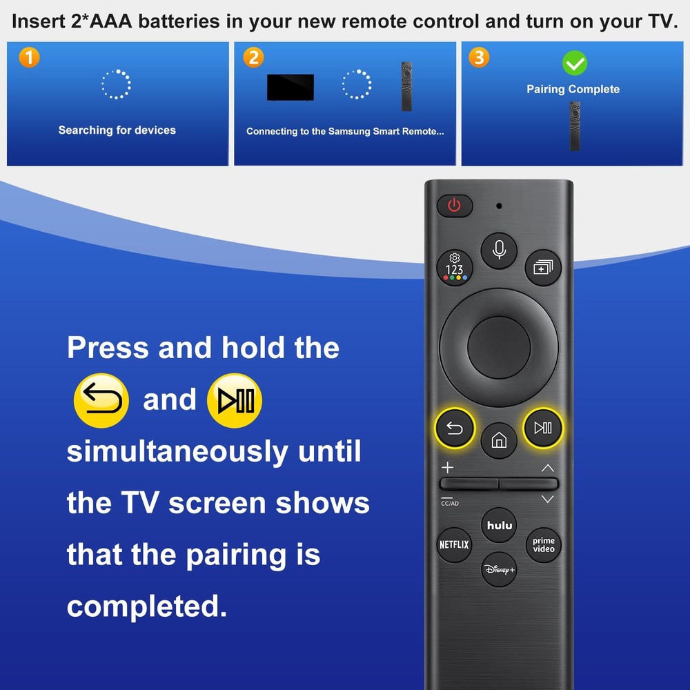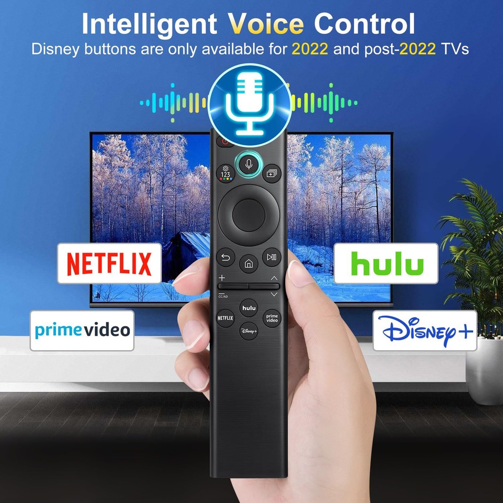 【Good Compatibility】Fit for Samsung Voice TV models in 2022 and beyond: S95B, QN95BD, QN95B, QN90B, QN900B, QN85B, QN800B, QN100B, Q80B, Q60B, LS03BD, LS03B, LS01B, BG970N etc. for Samsung Smart Monitor: LSP3B, G85SB, G7, G70B, G65B, M70B, M8.【Not solar charging feature】 【for Samsung Voice Remotes】Compatible with Samsung TV voice remote control models: BN59-01391A, BN59-01385A, BP59-00149A, BN59-01312A, BN59-01330A, TM2281E, TM2280E etc. Disney buttons are only available for TVs in 2022 and beyond 【Easy Pairing】①Turn on your TV and insert 2*AAA batteries in your new remote, then point it at the remote control sensor of the TV. ② Press and hold the “Return" and "Play/Pause" button simultaneously and you will see the message "Pairing Complete" in your TV screen. (Note: batteries are not included)(Not solar charging feature) 【Voice Command & Channel Shortcuts 】Its voice search function enables you to easily search your favorite moives or shows by simply speaking into the remote. And you can swiftly open your favorite apps with just one click because of its pre-set shortcut buttons. 【Important Notes】Please confirm your Samsung TV allows voice funtion before placed order. Please feel free to contact us if you have any questions. We are committed to providing you with a satisfactory solution promptly.