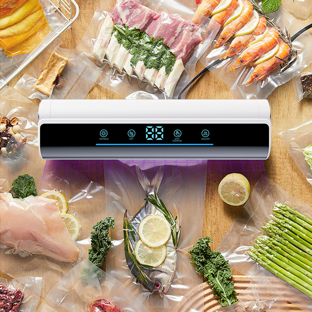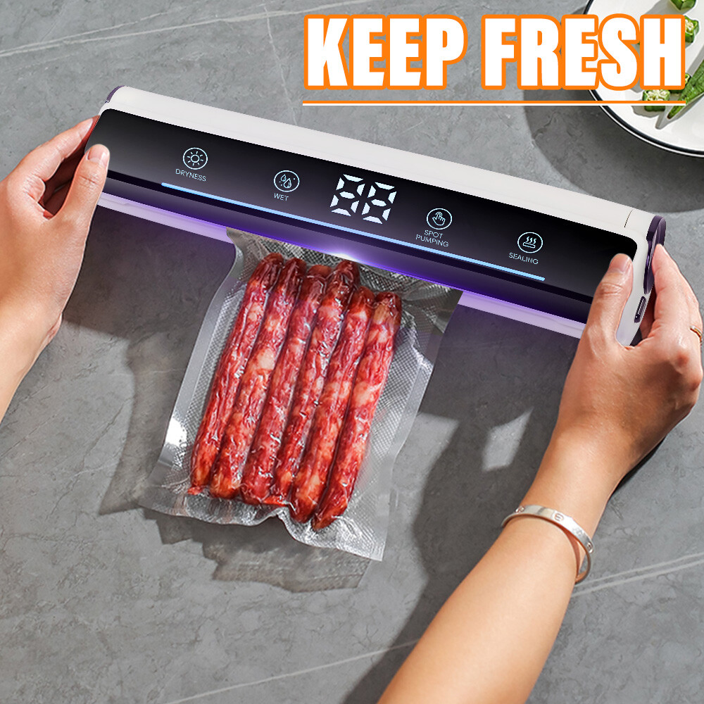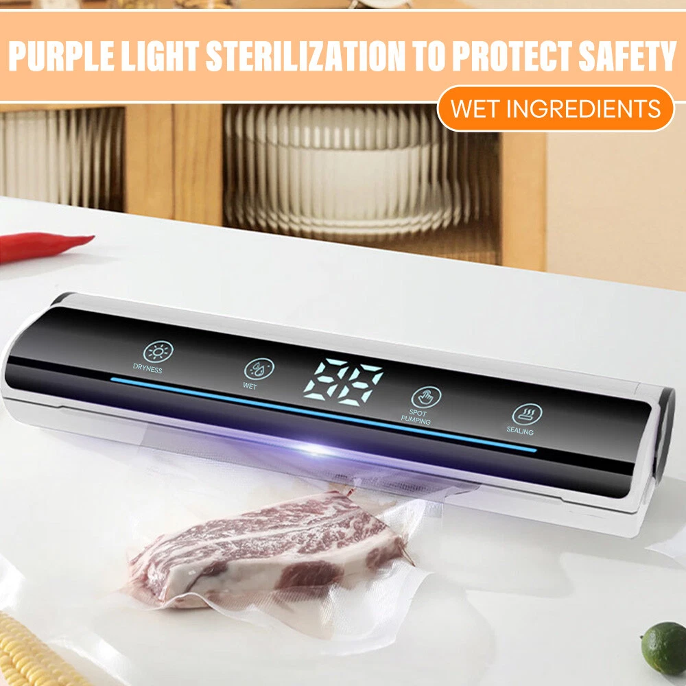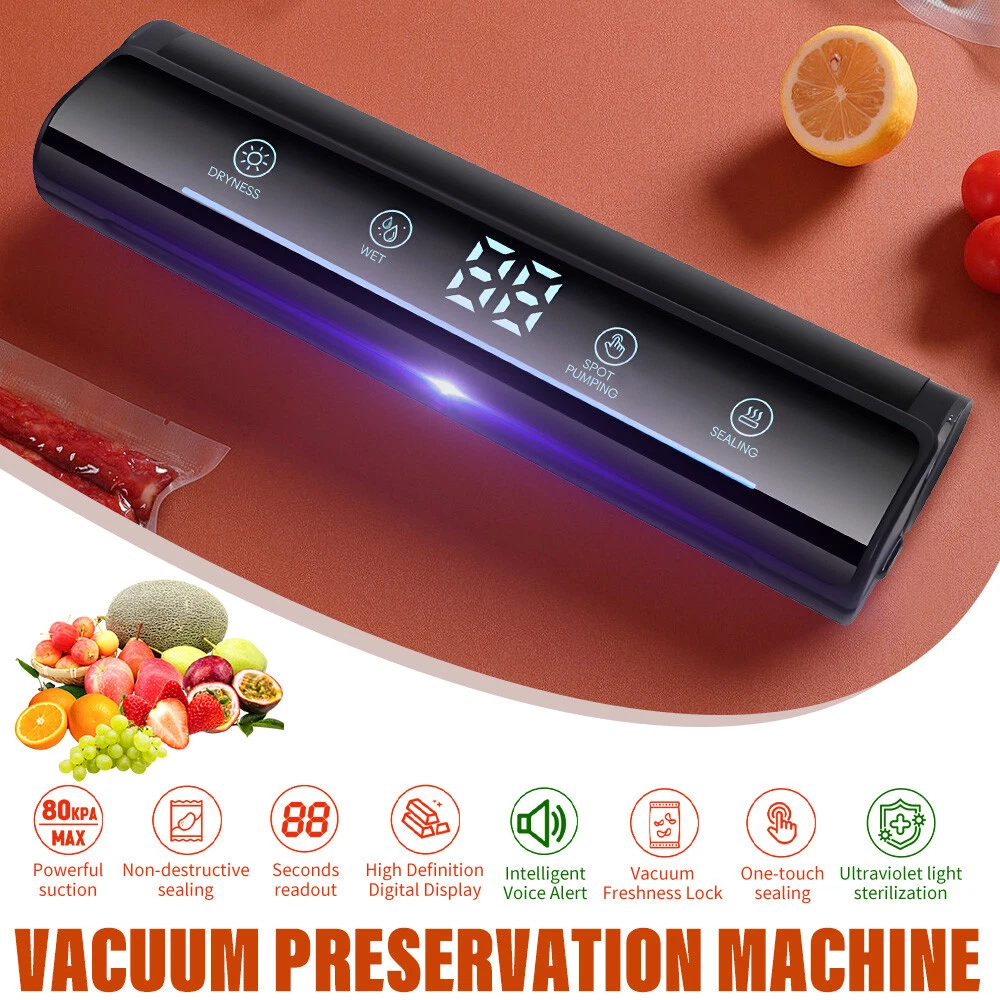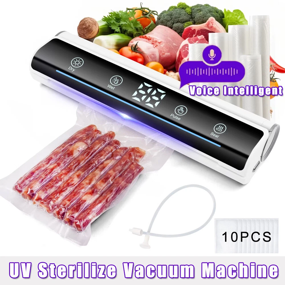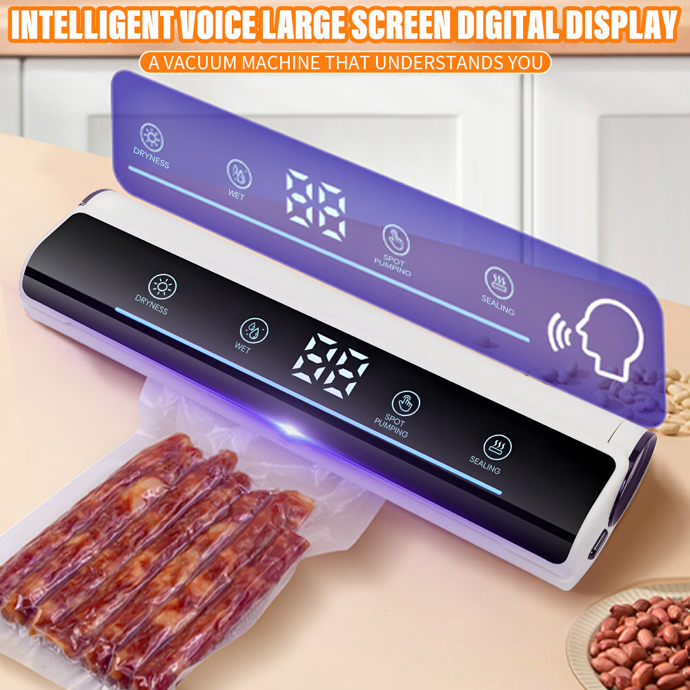 Voice Intellig ent High Quality Home Vacuum Sealer Automatic Dry And Wet Extraction Vacuum Sealer 80Kpa with 10 Vacuum Seal Bags For Home Use Performance: voice intelligent broadcast, large screen touch control, digital display time, low power consumption, fast heating. High sealing efficiency. Seal the mouth flat and beautiful not leakage vacuum pumping thoroughly, extend the shelf life of food, plus UV sterilization light Function: 1. dry and wet mode 2. external pumping function 3. can pump liquid 4. sealing machine length lengthened 31cm 5. UV sterilization sterilization light 6. intelligent voice broadcast function Specification: Material: environmental engineering ABS + transparent acrylic + thickened pe sticker + pure copper motor Size: 37*10*6.5cm Rated power: 120W Rated voltage: 100-240V Rated frequency: 50Hz Vacuum degree: 80kpa Power supply mode: plug-in Power cord length: 120CM Package list: 1 x Vacuum Sealer Machine 1 x Instruction manual 10 x Vacuum bag 1 x Extractor tube 1 x Cutter