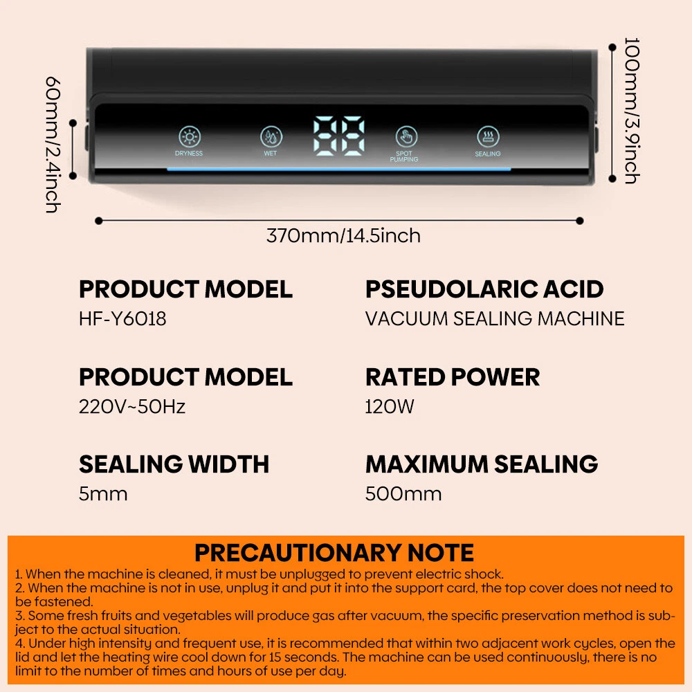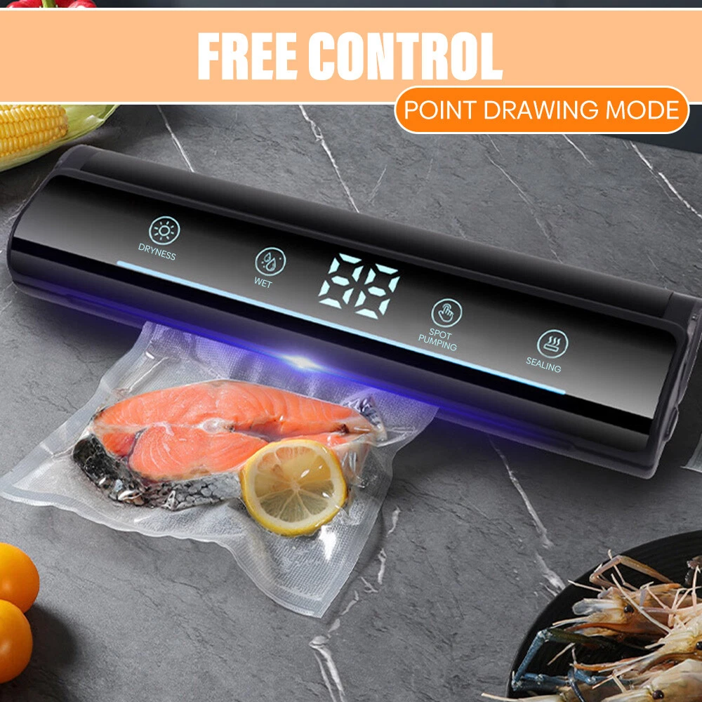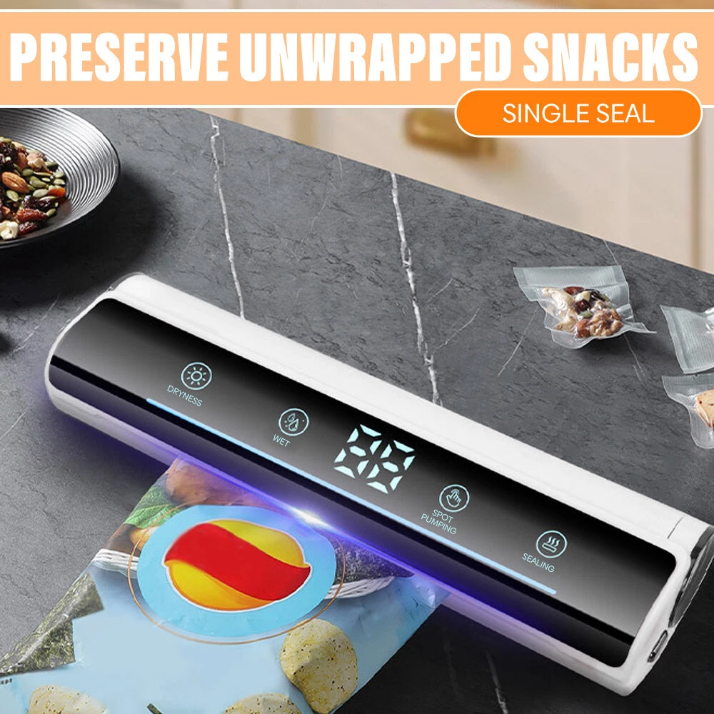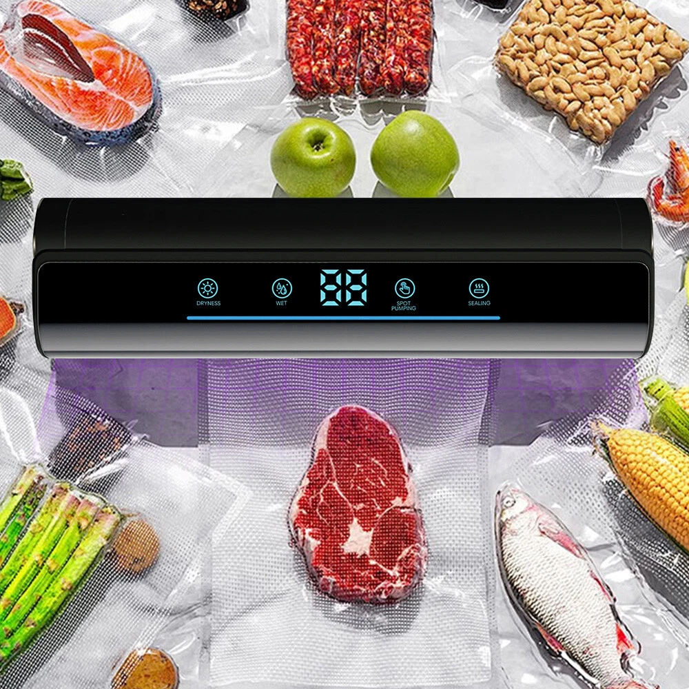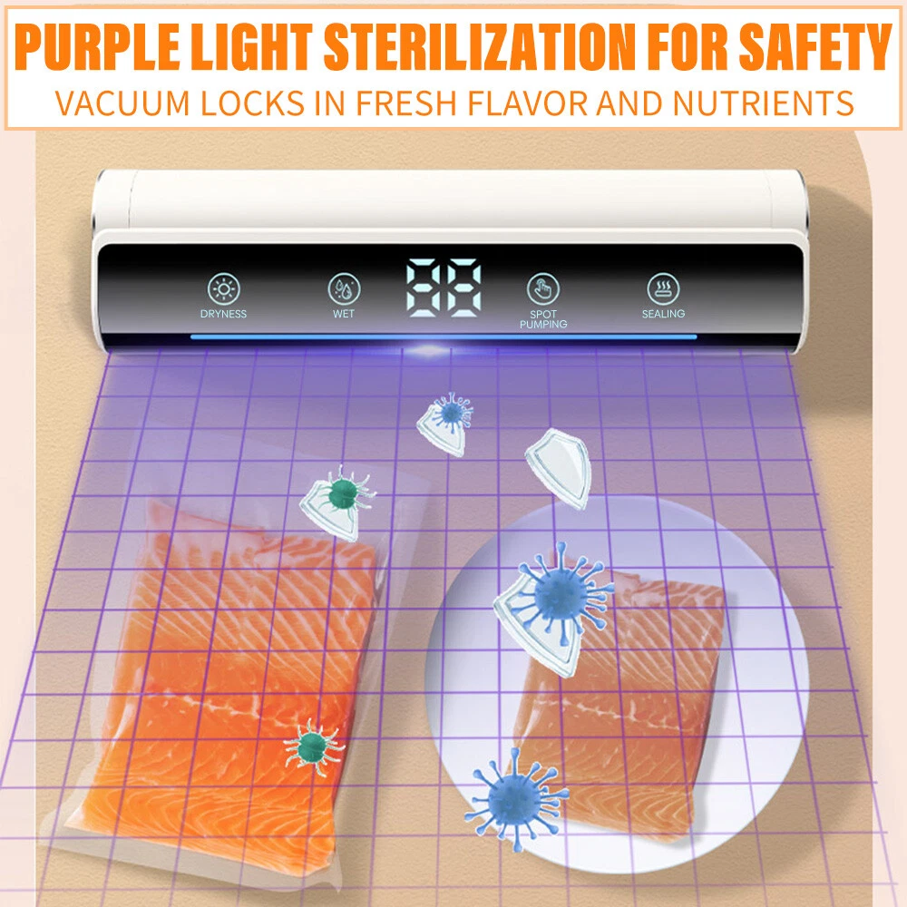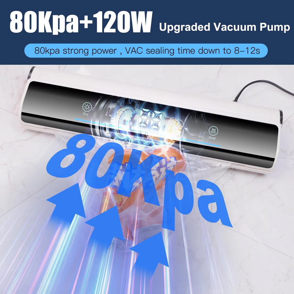 Voice Intellig ent High Quality Home Vacuum Sealer Automatic Dry And Wet Extraction Vacuum Sealer 80Kpa with 10 Vacuum Seal Bags For Home Use Performance: voice intelligent broadcast, large screen touch control, digital display time, low power consumption, fast heating. High sealing efficiency. Seal the mouth flat and beautiful not leakage vacuum pumping thoroughly, extend the shelf life of food, plus UV sterilization light Function: 1. dry and wet mode 2. external pumping function 3. can pump liquid 4. sealing machine length lengthened 31cm 5. UV sterilization sterilization light 6. intelligent voice broadcast function Specification: Material: environmental engineering ABS + transparent acrylic + thickened pe sticker + pure copper motor Size: 37*10*6.5cm Rated power: 120W Rated voltage: 100-240V Rated frequency: 50Hz Vacuum degree: 80kpa Power supply mode: plug-in Power cord length: 120CM Package list: 1 x Vacuum Sealer Machine 1 x Instruction manual 10 x Vacuum bag 1 x Extractor tube 1 x Cutter