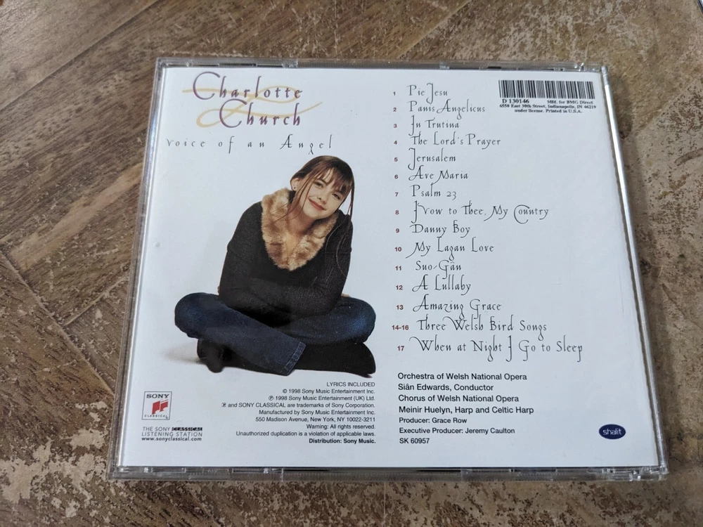 This CD features the angelic voice of Charlotte Church and includes a collection of classical and sacred music. Accompanied by harpist Meinir Heulyn, the album includes cantatas, psalms, anthems, lullabies, and hymns, as well as operatic arias and requiems. The recording is in stereo and has a duration of 52 minutes. Released by Sony Classical in 1998, this album is presented in a standard jewel case and features the contributing artist Meinir Heulyn. The music style includes sacred music, hymns, songs, and operas, and the genres range from Ave Maria to classical and religious music. This CD is a must-have for any fan of Charlotte Church or classical music.