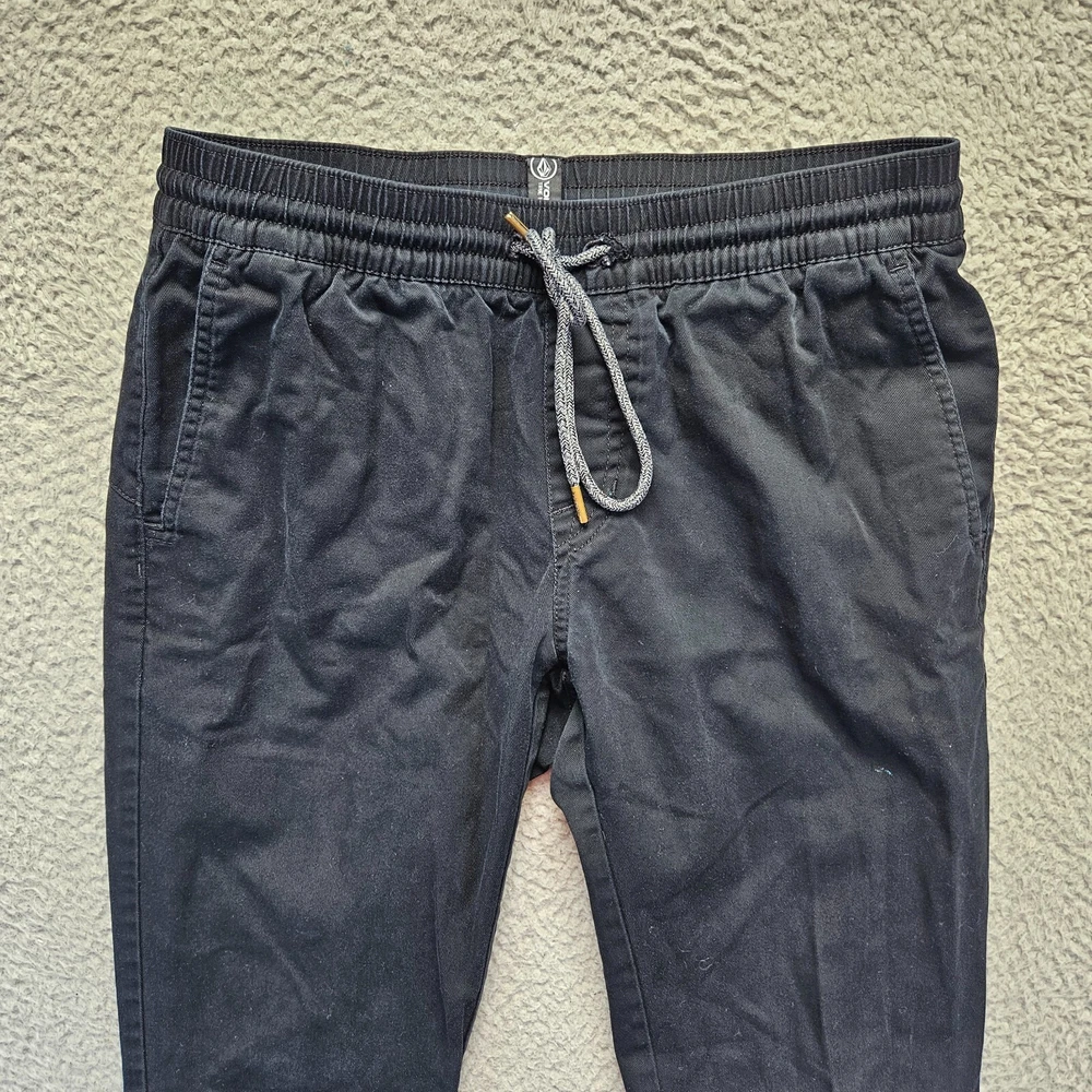 Color: Black Occasion: Casual, Travel, Workwear Pattern: Solid Leg Style: Straight Closure: Pull On Size: S Pocket Type: Slash Pocket Front Type: Flat Front gtin13: Does not apply Season: Fall, Spring, Summer, Winter Personalize: No Handmade: No Waist Size: 30 in Garment Care: Machine Washable Features: Elastic Waist Department: Men Inseam: 29 in Vintage: No Style: Chino Type: Pants Rise: Mid (10-12 in) Size Type: Regular UPC: Does not apply Brand: Volcom