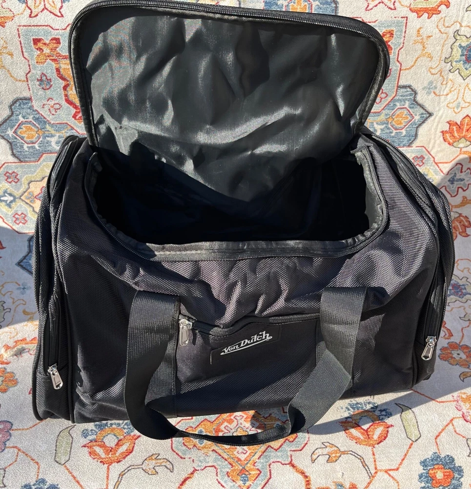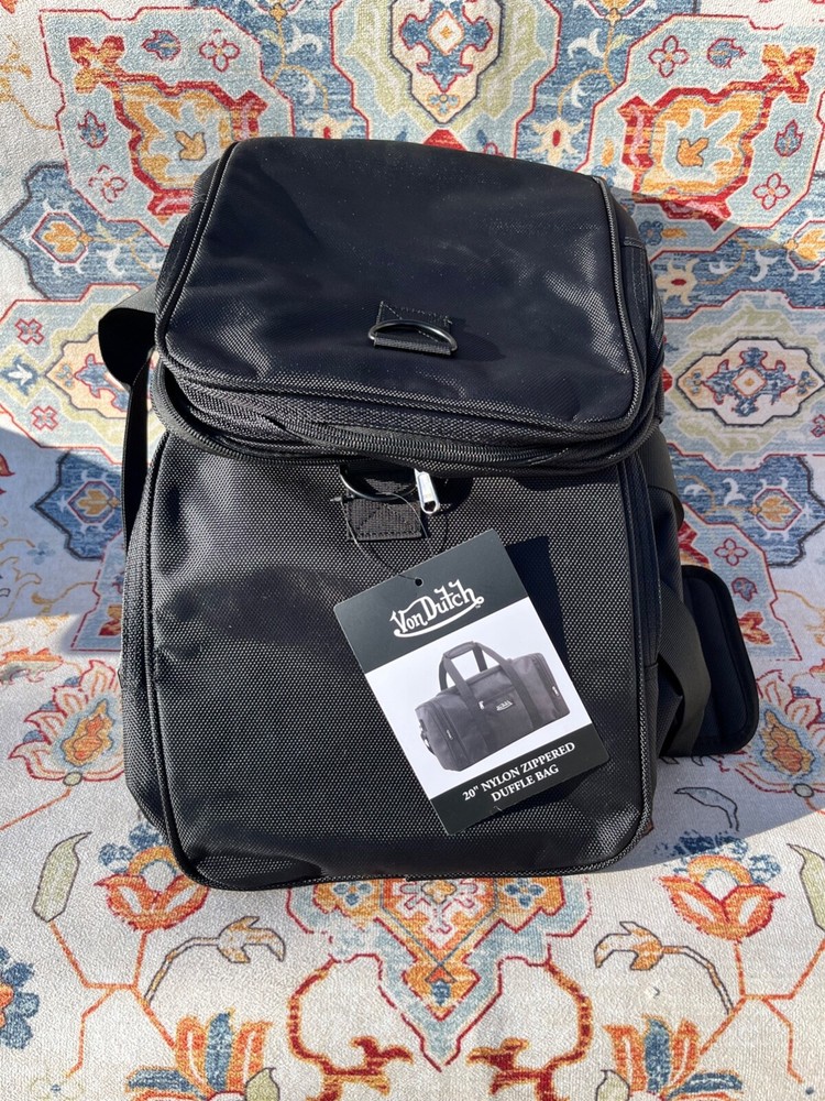 This is a Von Dutch duffle bag in black color made of nylon material. It has a zipper closure and measures 20" long, 10" tall, 9" deep. The bag features an adjustable Shoulder Strap and 2 padded handles. There are an additional 2 side zipper compartments. It is brand new with tags.