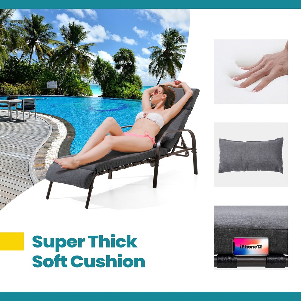 Relax outdoors with this outdoor adjustable chaise lounge chair from VredHom. Full steel frame is sure to be a reliable Patio Furniture for your home. Adjustable back height and you could even lay flat to enjoy sunbathing. Easy assembly required. Enjoy Your Life! Features: Set includes 2 chaise lounges with cushions and pillows Steel frame in brown powder coated Removable cushion and pillow 5 adjustable recline positions Ergonomic design Easy to assemble Holds 350 lbs. Dimensions: The highest position: 63 inches long x 19.7 inches wide x 38.1 inches high Backrest: 29 inches long x 17.7 inches wide Cushion: 79.92 inches long x 19.69 inches wide x 3.94 inches thick Pillow: 19.69 inches long x 7.87 inches wide x 3.94 inches thickWarm Tips: After assembling the chair, it's Free Shipping Over $49.99* Details VredHom Outdoor Adjustable Chaise Lounge with Cushion and Pillow (Set of 2) - Product Description: Relax outdoors with this outdoor adjustable chaise lounge chair from VredHom. Full steel frame is sure to be a reliable Patio Furniture for your home. Adjustable back height and you could even lay flat to enjoy sunbathing. Easy assembly required. Enjoy Your Life! Features: Set includes 2 chaise lounges with cushions and pillows Steel frame in brown powder coated Removable cushion and pillow 5 adjustable recline positions Ergonomic design Easy to assemble Holds 350 lbs. Dimensions: The highest position63 inches long x 19.7 inches wide x 38.1 inches high Backrest29 inches long x 17.7 inches wide Cushion79.92 inches long x 19.69 inches wide x 3.94 inches thick Pillow19.69 inches long x 7.87 inches wide x 3.94 inches thick Warm Tips: After assembling the chair, it's normal that the middle leg of the chair is suspended, such a design is to avoid the middle leg of the chair touching the ground, leading to the front and back legs may be suspended, the whole chair can not balance. The middle leg, which is suspended, is normal and has been designed for better balance. But once you sit on it, the middle leg touches the ground, so please customers don't have to worry.