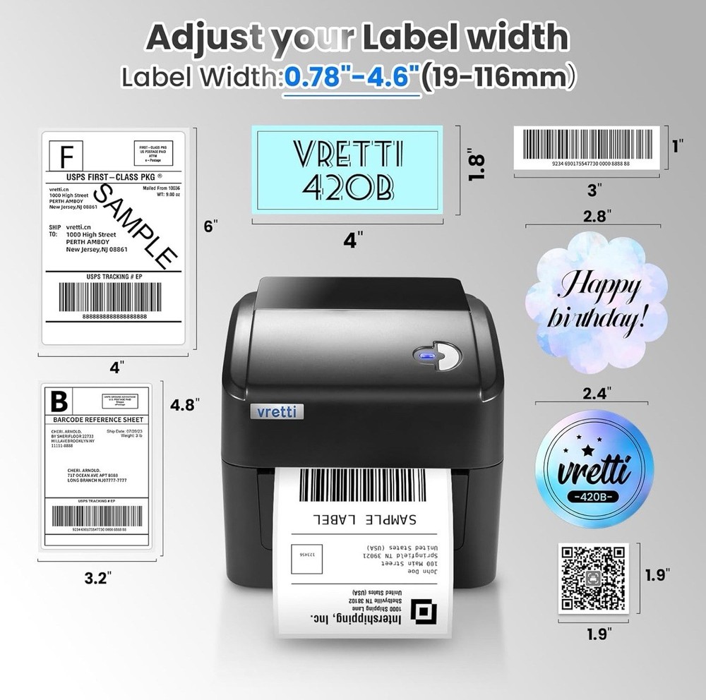 Vretti 4x6 Thermal Barcode Shipping Label Printer 420B USB Black