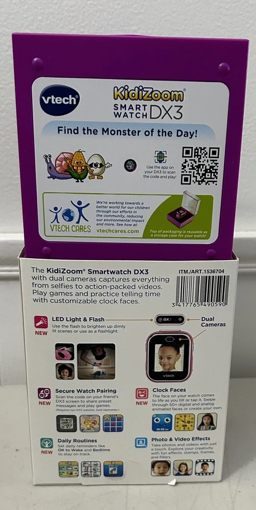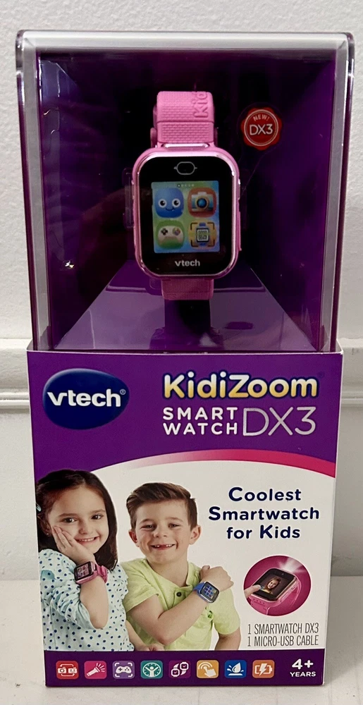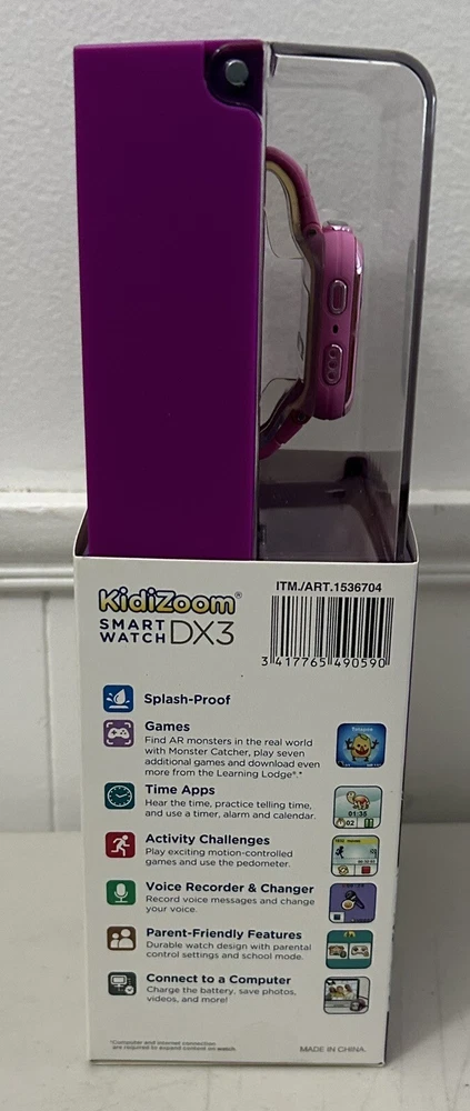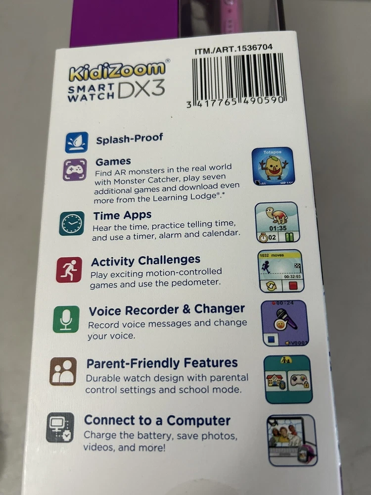 Splash proof. Games. Time apps. Activity challenges. Voice, recorder and changer. Parent friendly features. Connect to computer. Take photos and videos with just a touch. Dual cameras. LED light and flash. Secure, watch pairing.