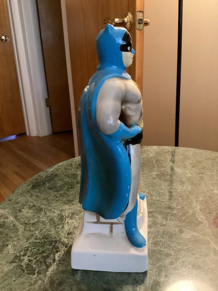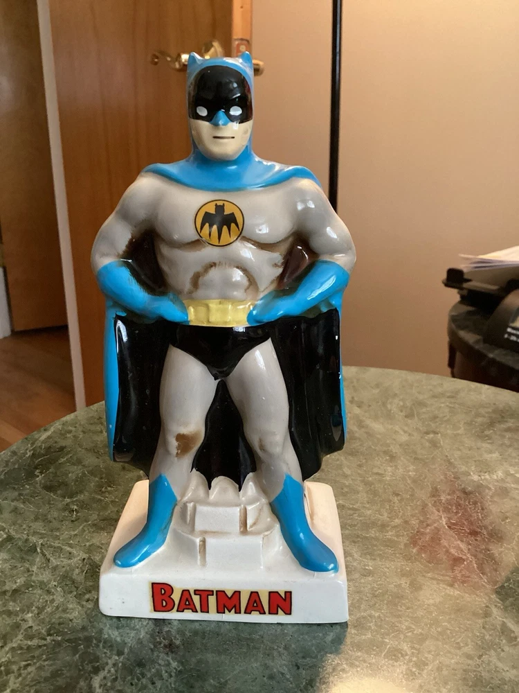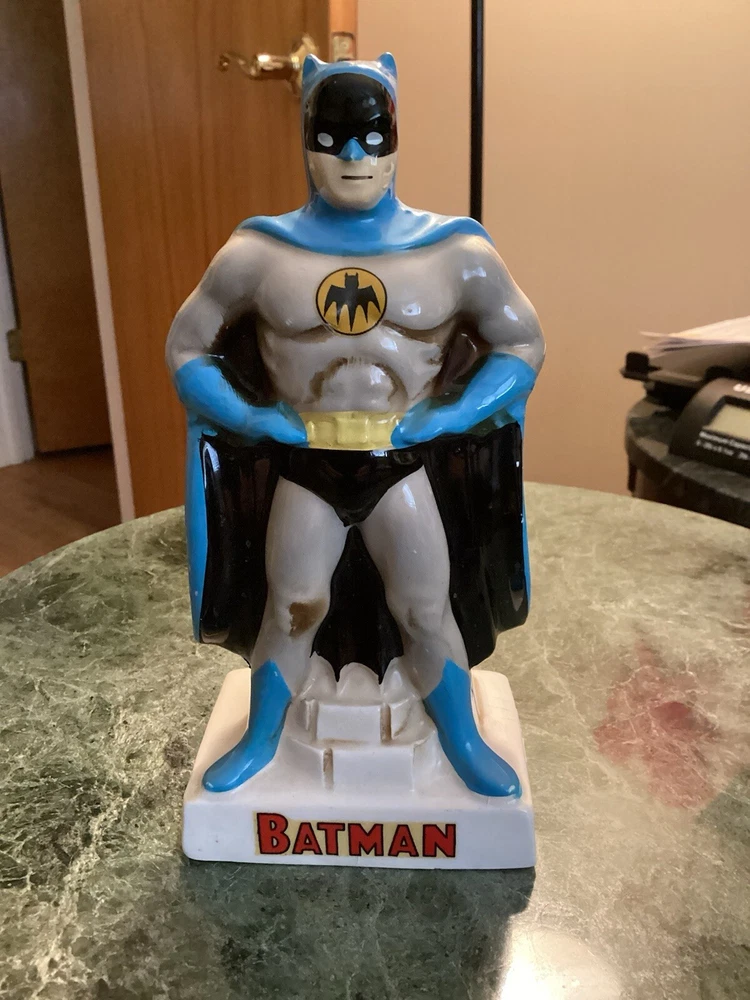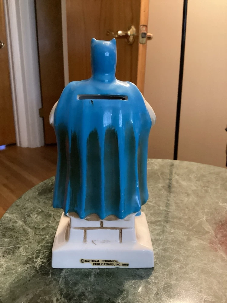 Vintage original Batman coin bank 1966 National Periodical Publications, Inc. This bank comes with the stopper. Still has part of the original sticker on the bottom. Bank is approximately 7” tall and 3 1/4” wide. There is very minimal paint loss on the tips of his ears and nose and a couple areas on his cape. See pics. There are no chips, cracks or crazing.