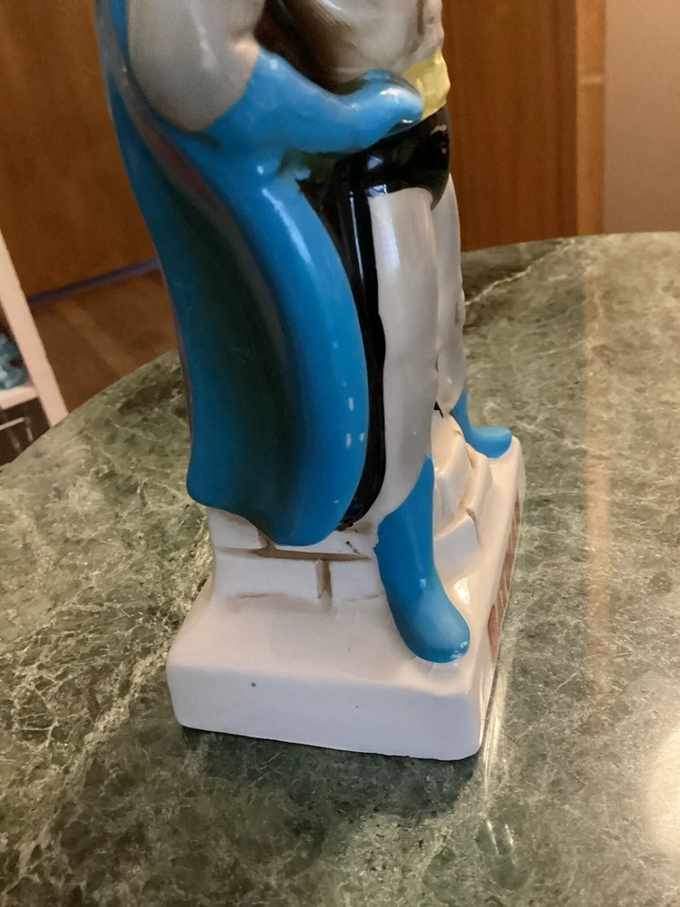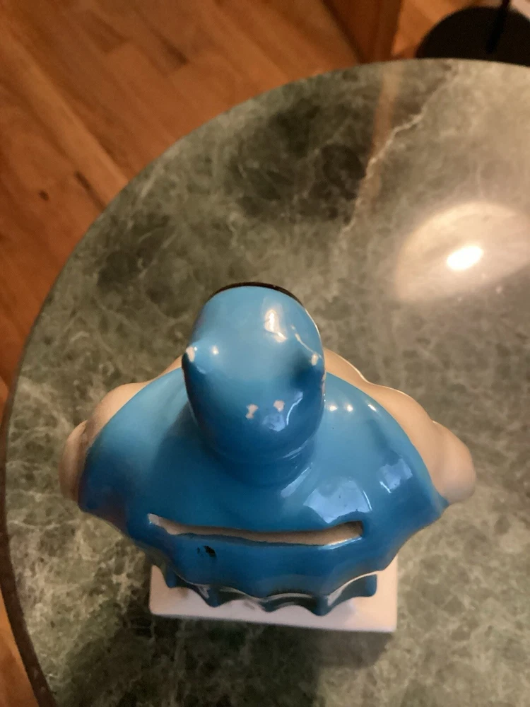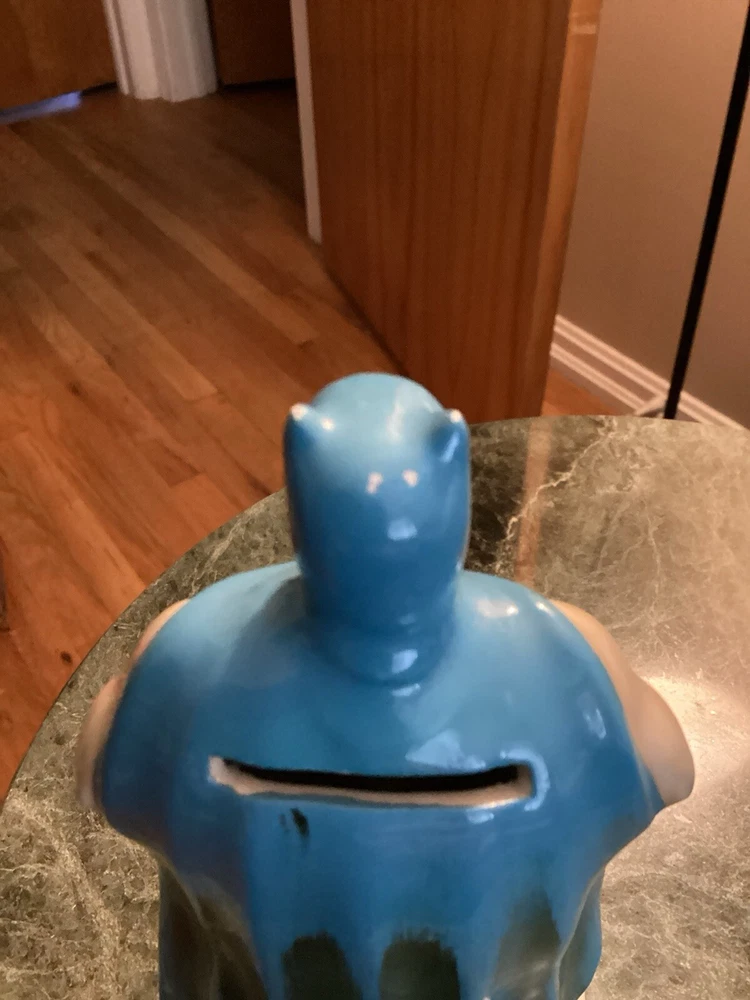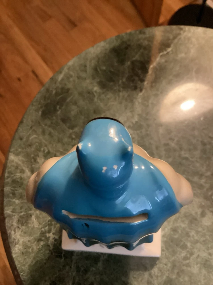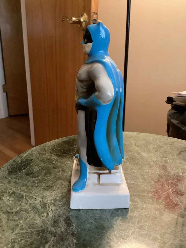 Vintage original Batman coin bank 1966 National Periodical Publications, Inc. This bank comes with the stopper. Still has part of the original sticker on the bottom. Bank is approximately 7” tall and 3 1/4” wide. There is very minimal paint loss on the tips of his ears and nose and a couple areas on his cape. See pics. There are no chips, cracks or crazing.