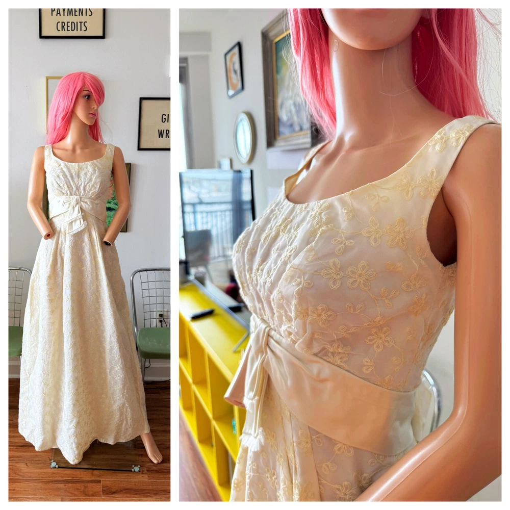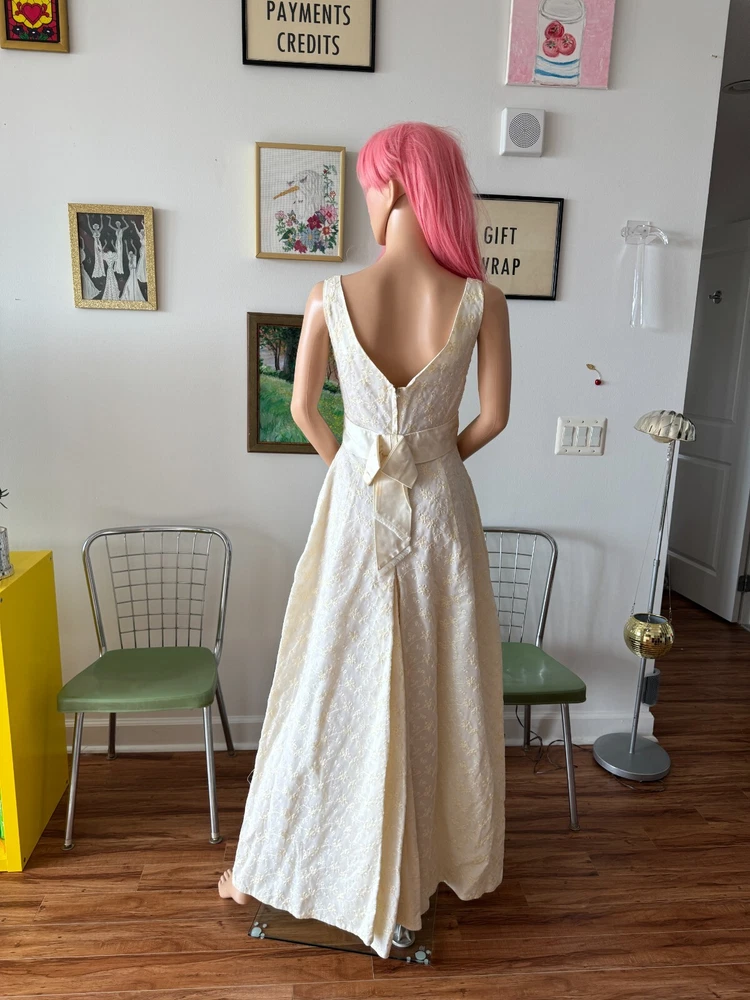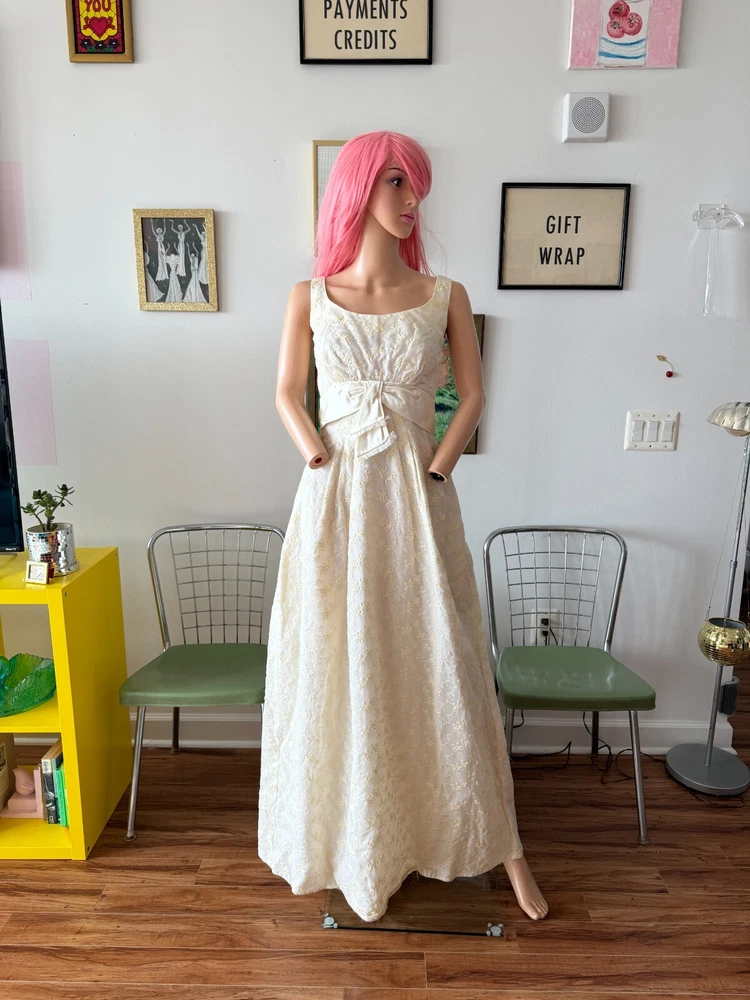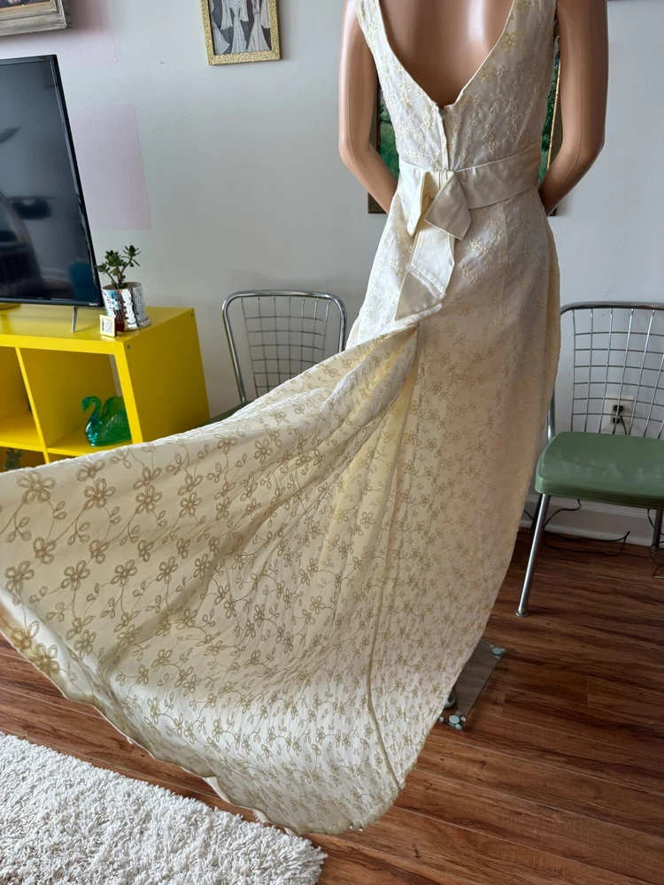 Details: gorgeous designer boutique wedding or party dress scooped neck, back metal zipper full bustle train in the back- tons of fabric white with off white/ivory/buttery floral brocade white silk ribbon details, some fringed flaws: great vintage condition, no holes or stains; note pictured some discoloration on the back bow Measurements: taken with the garment lying flat, please double. shoulder to shoulder: armpit to armpit: 16" waist: 12.5" hip (measured 6" below waist): length: 52" inseam: rise: please be sure to check measurements carefully. The size listed in the title is a general idea, and should not be used alone to decide fit.