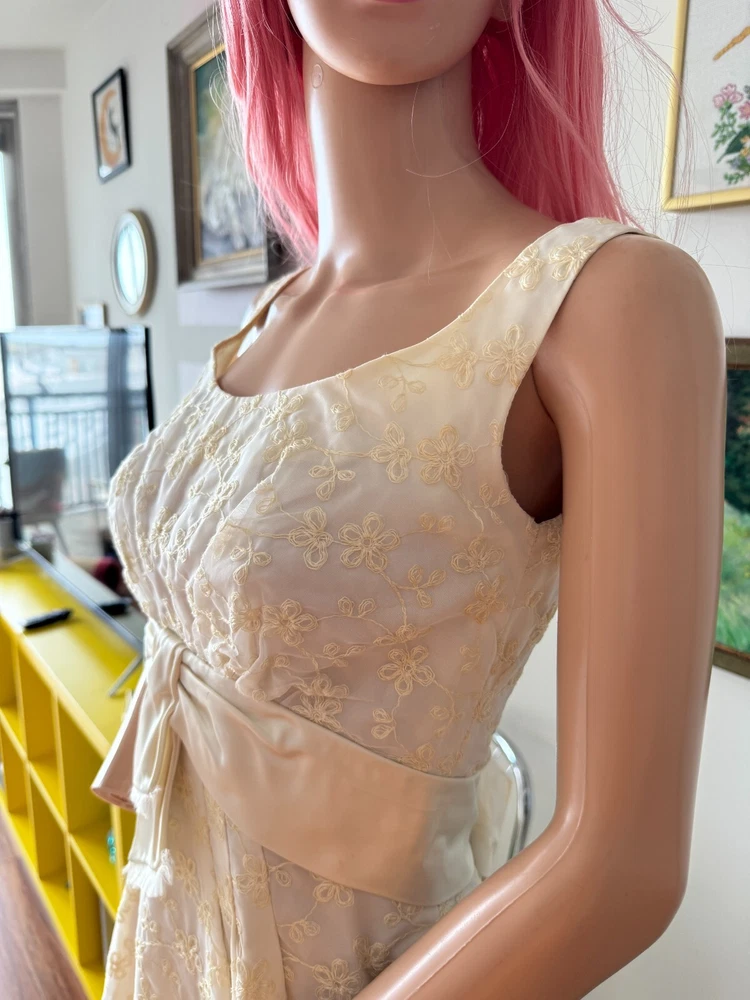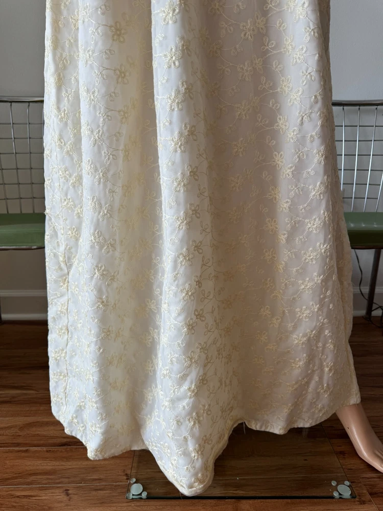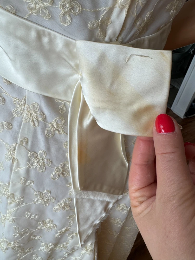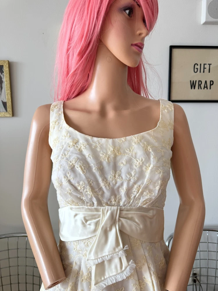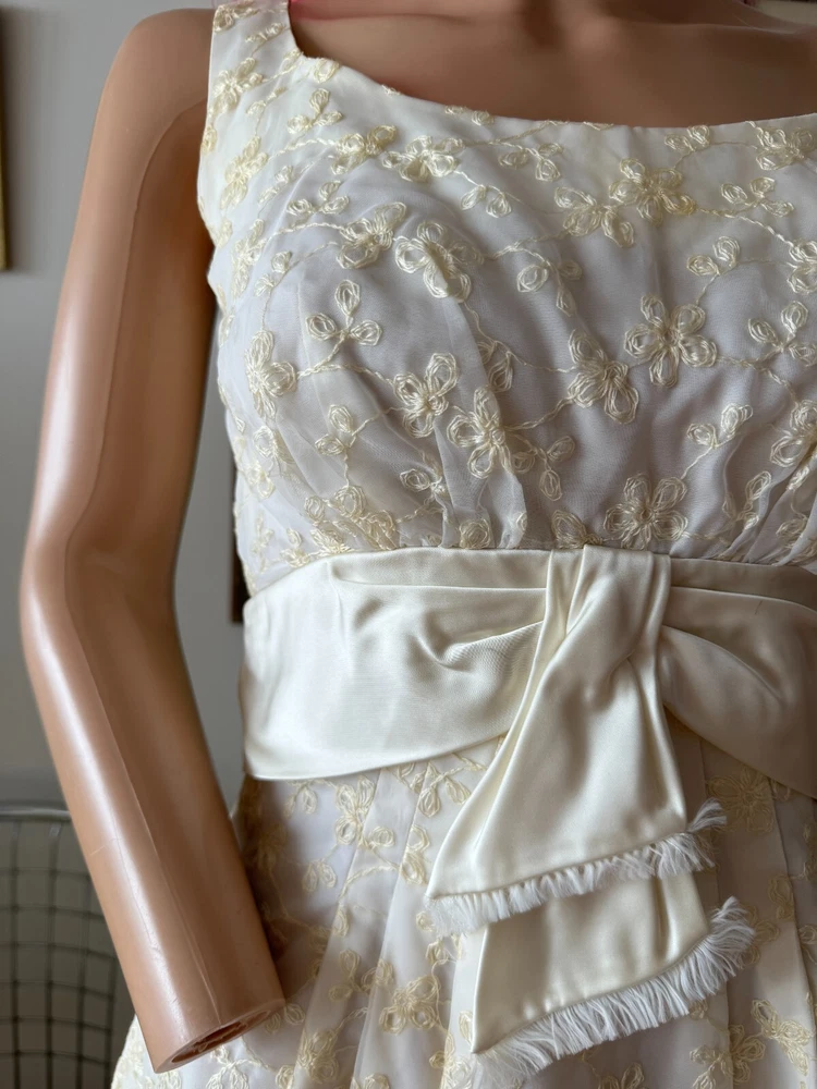 Details: gorgeous designer boutique wedding or party dress scooped neck, back metal zipper full bustle train in the back- tons of fabric white with off white/ivory/buttery floral brocade white silk ribbon details, some fringed flaws: great vintage condition, no holes or stains; note pictured some discoloration on the back bow Measurements: taken with the garment lying flat, please double. shoulder to shoulder: armpit to armpit: 16" waist: 12.5" hip (measured 6" below waist): length: 52" inseam: rise: please be sure to check measurements carefully. The size listed in the title is a general idea, and should not be used alone to decide fit.