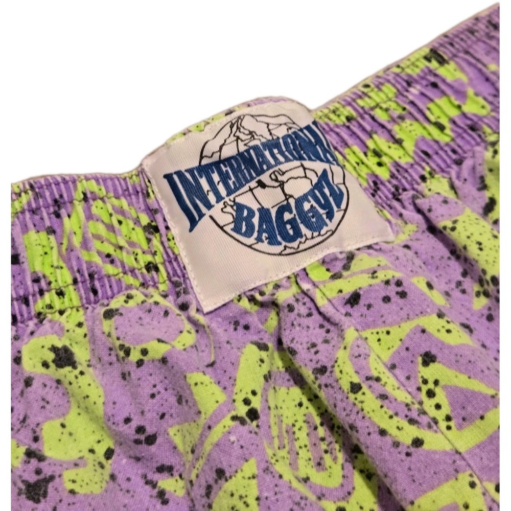 These vintage 80s International Baggyz Hammer Pants in neon colors are a unique and eye-catching addition to any wardrobe. Made in California, these pants feature a striped pattern, drawstring closure, and a classic fit with an elastic waist for comfort. The pants are crafted from cotton canvas fabric with a front flat design and come in a size XL with a 31-inch waist. Perfect for various occasions from casual to formal, these pants have a retro 80s and 90s theme with a touch of hipster and hippie style. Complete with cuffed legs, pockets, and a multicolor design, these pants are a stand-out piece for any fashion-forward individual.