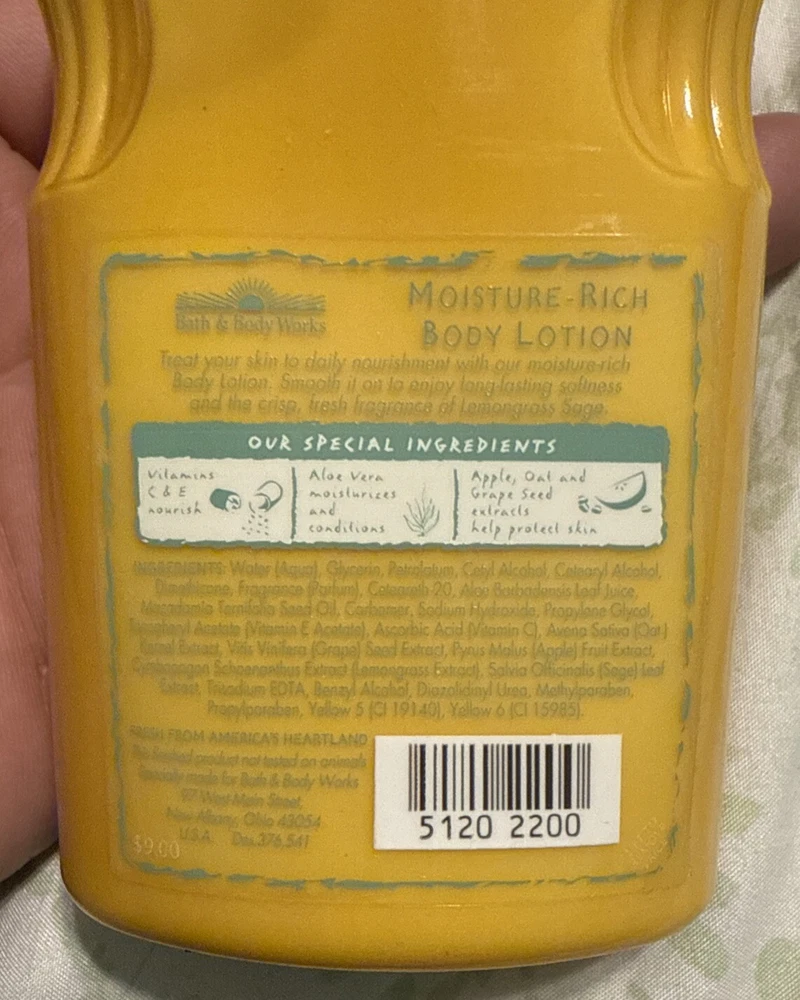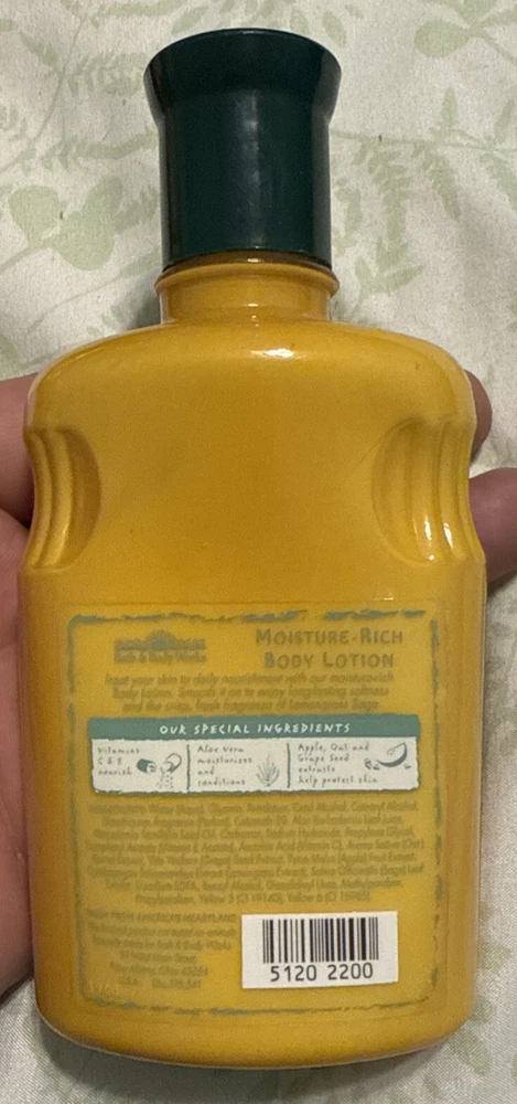 Ingredients:Aloe VeraScent:Lemongrass, SageSet Includes:Daily Usegtin13:Does not applyFeatures:All Natural IngredientsCountry/Region of Manufacture:UnknownSize:RegularMPN:Does not applyProduct Line:Bath & Body Works ClassicsSkin Type:All Skin TypesBody Area:Full BodyBrand:SAGEUPC:Does not applyColor:YellowFormulation:LotionMain Purpose:MoisturizerVolume:8 fl ozActive Ingredients:Aloe VeraDepartment:UnisexType:Daily Use