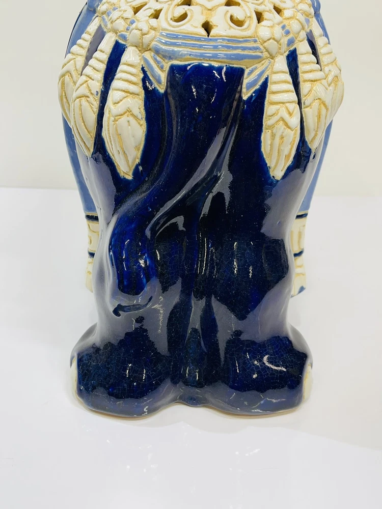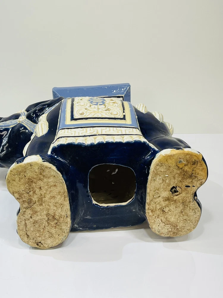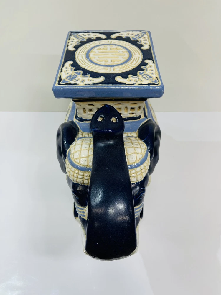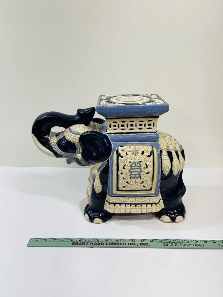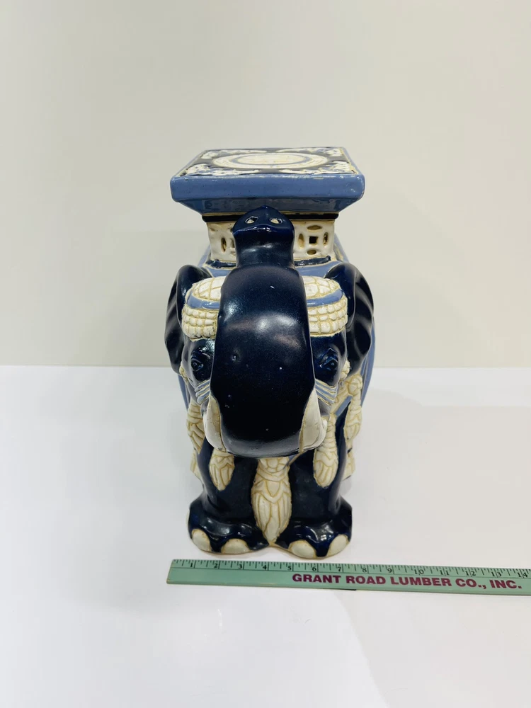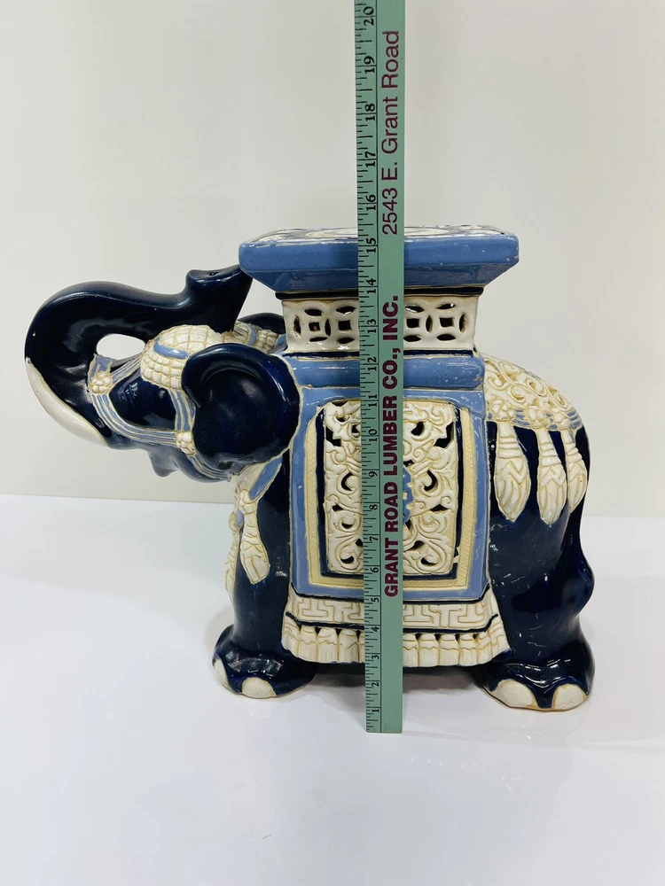 Vtg Blue Glazed Ceramic Elephant | Chinese Garden Stool | Pedestal | Side table. Measuring 20 inches long by 15 inches high and about 9 inches wide. It weighs just under 15 pounds.. it does show some signs of age such as crazing And some small imperfections in the glaze. There is a chip in the glaze on the tusk and a small one on the snout, as well as one on the dark blue line in the center of the elephant all three imperfections are shown in the last photos. Having just shipped one , It will be double boxed insured and signature confirmation added to insure safe delivery..
