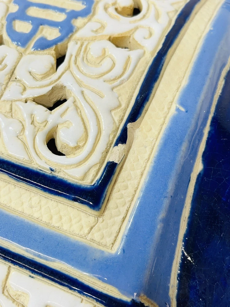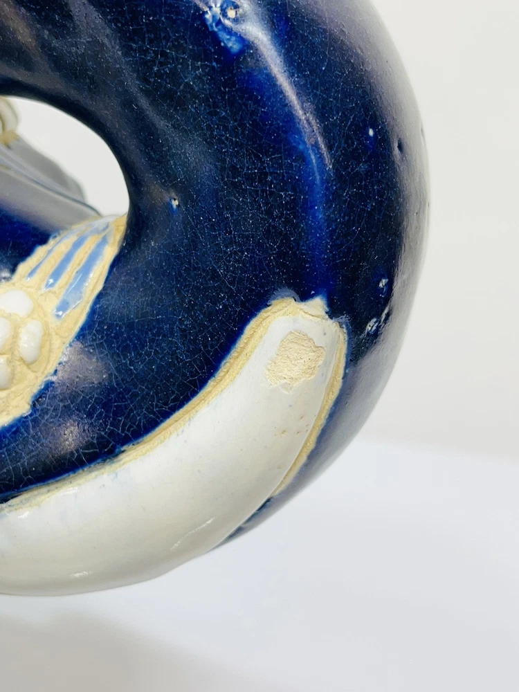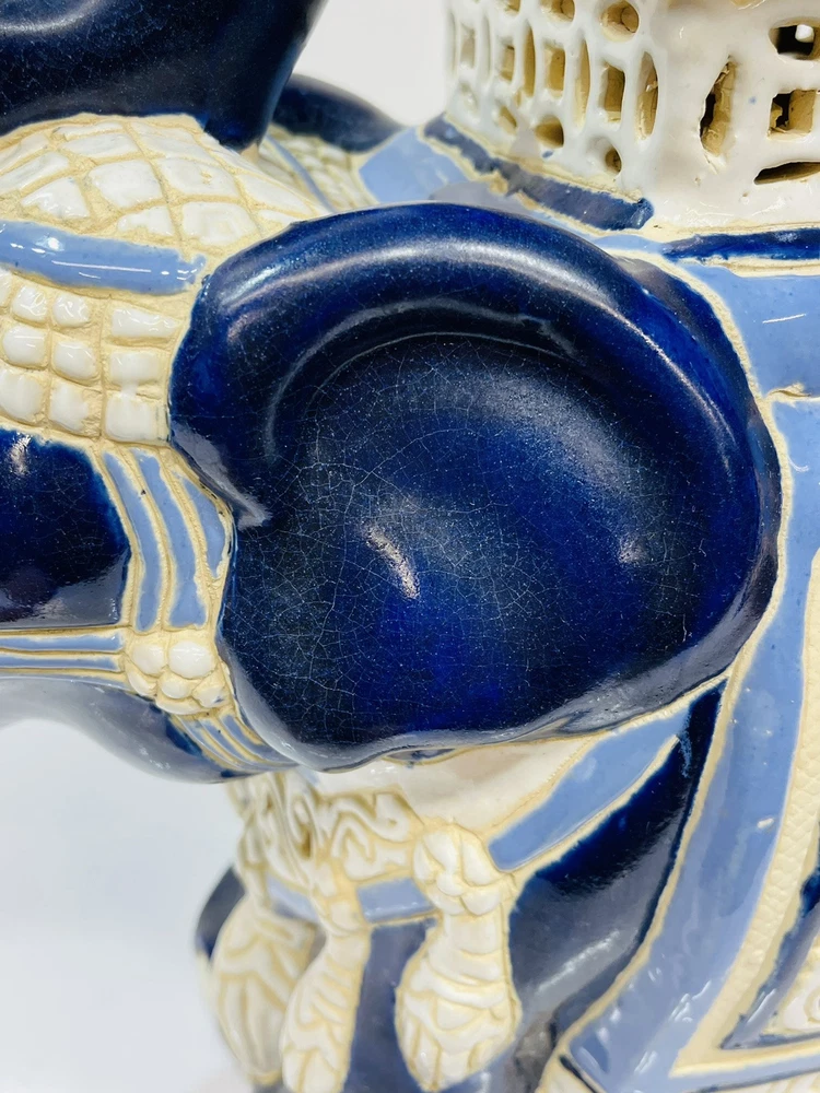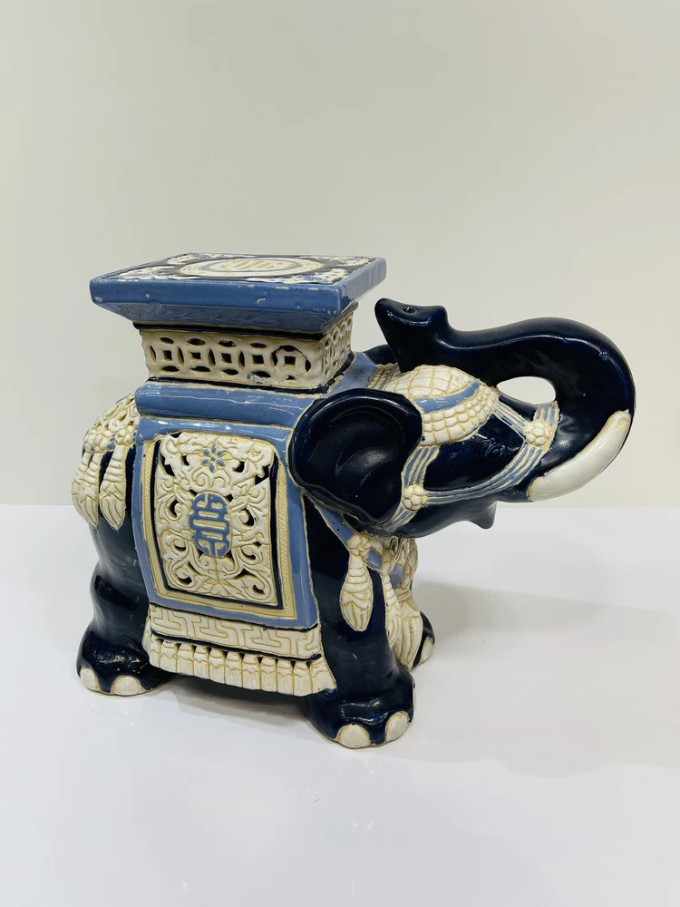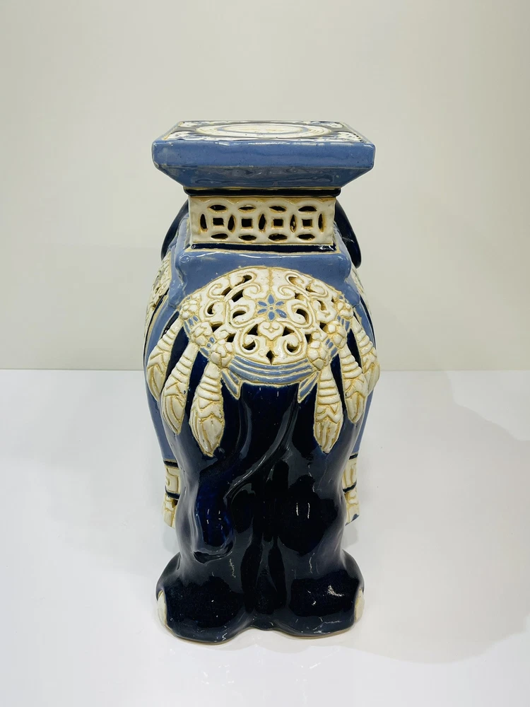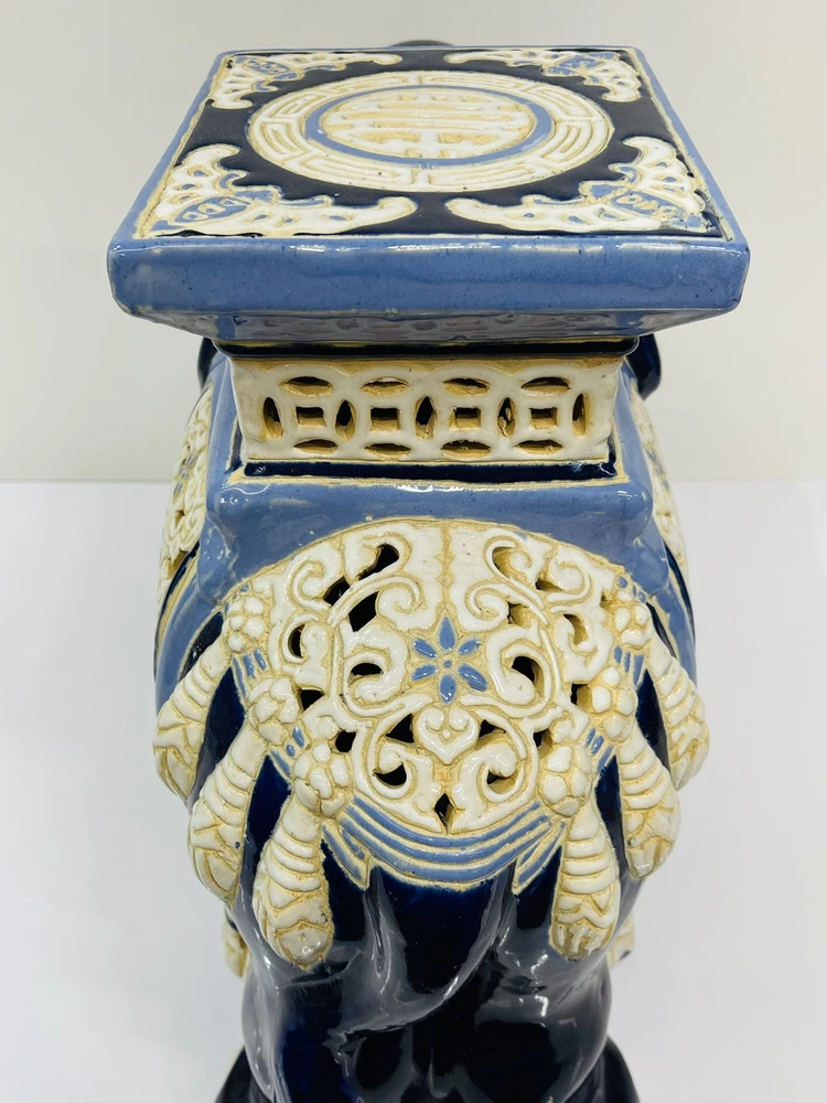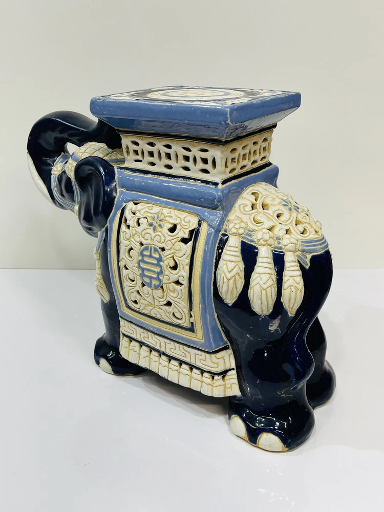 Vtg Blue Glazed Ceramic Elephant | Chinese Garden Stool | Pedestal | Side table. Measuring 20 inches long by 15 inches high and about 9 inches wide. It weighs just under 15 pounds.. it does show some signs of age such as crazing And some small imperfections in the glaze. There is a chip in the glaze on the tusk and a small one on the snout, as well as one on the dark blue line in the center of the elephant all three imperfections are shown in the last photos. Having just shipped one , It will be double boxed insured and signature confirmation added to insure safe delivery..