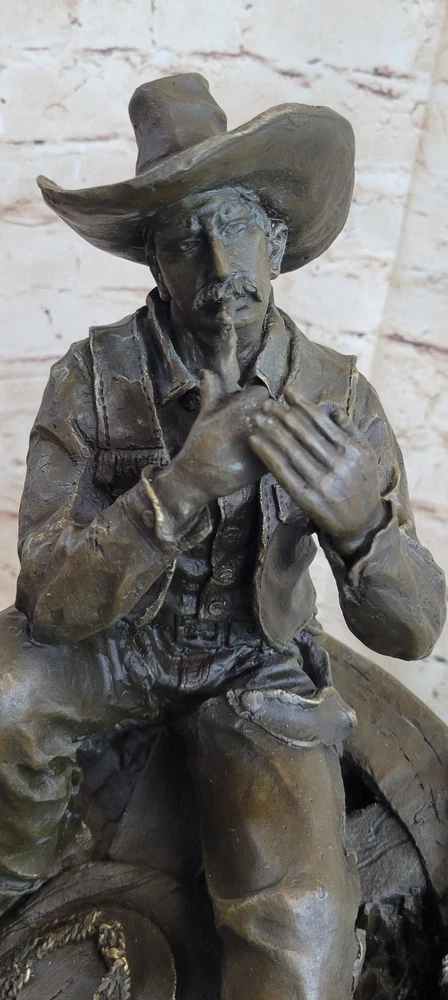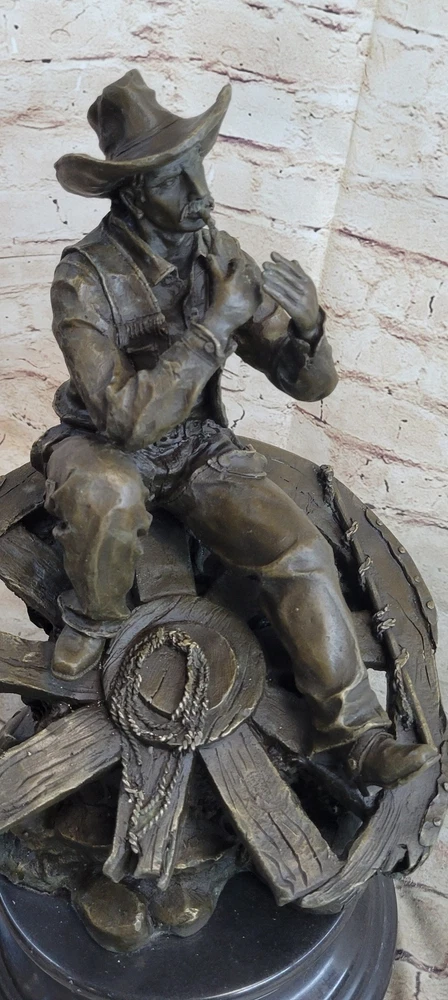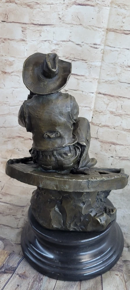 Vtg Bronze Copper Equestrian Cowboy Horse Tobacco Smoking Pipe Holder Statue Vtg Bronze Copper Equestrian Cowboy Horse Tobacco Smoking Pipe Holder Statue Condition: This sculpture is in perfect condition Bronze Dimensions with Marble Base: Height 17" X Width 10" Marble Dimensions: Diameter 9" Height without base:14" Weight:31 LBS Inventory:24YRD115712042 Capture the essence of the Wild West with our exquisite bronze sculpture titled "Lonely Cowboy." Handcrafted with precision and skill, this remarkable artwork portrays a cowboy sitting and daydreaming as he leisurely lights his pipe. The attention to detail in this piece, marked with the artist's name Fisher, brings the cowboy's character to life, evoking a sense of solitude and reflection. Molded using the ancient lost-wax casting method, the sculpture exudes authenticity and artistry, preserving the fine nuances of the cowboy's posture and expression. Enhanced with a brown patina finish, the artwork adds depth and richness, ensuring its lasting beauty and preservation for generations to come. Mounted gracefully on a sleek black marble base, this handcrafted bronze sculpture bears the signature of the artist Fisher, a symbol of its genuine artistry and craftsmanship. Whether displayed in a western-themed collection or as a centerpiece in your home, "Lonely Cowboy" is a timeless tribute to the spirit of the frontier and the enduring legacy of the Wild West. A captivating addition for collectors and enthusiasts alike, celebrating the mystique and allure of the cowboy way of life. Shipping Terms : Most of our items are shipped via USPS (United States Postal Service) mail or UPS. Most orders are shipped within 24-48 hours of purchase. Please be aware that not all items are available for USPS shipping due to size and weight. We do ship to Hawaii, Alaska, Canada, Puerto Rico, APO/AE, and U.S. Virgin Islands, however, an additional charge may be required. Please contact us before making any purchases in these areas. For Non-USA customers, you may be responsible for all duty, tax, brokerage fees that may be due upon delivery (shipping costs cover freight charges only). We also ship internationally. Please refer to the "Shipping and Handling" chart for the rates for each area. Payment : We accept just about any form of payment. PayPal, Master Card, Visa or American Express credit cards. Money orders, cashiers checks, and even personal or business checks. For governmental institutions, we will also accept a purchase order. Please understand that for personal or business checks we have to wait for the check to clear (usually 7 days) before shipping. Condition : New Detailed Hand Crafted Hot Cast Bronze Satisfaction Guaranteed. This is Stock Photo, Slight Color Variation!! Listing and template services provided by inkFrog