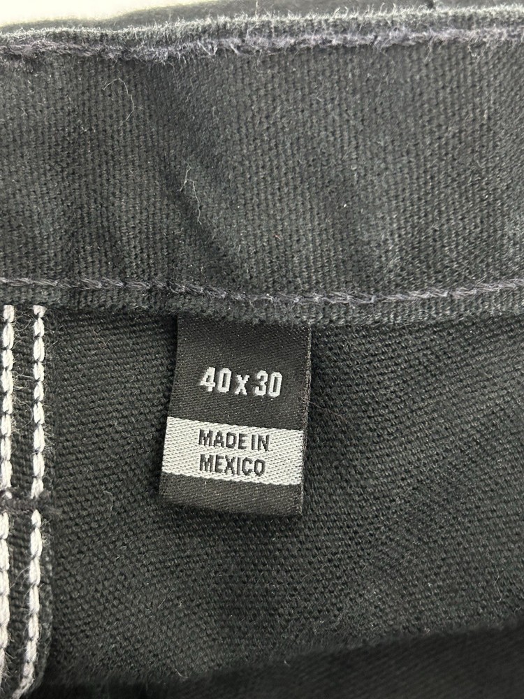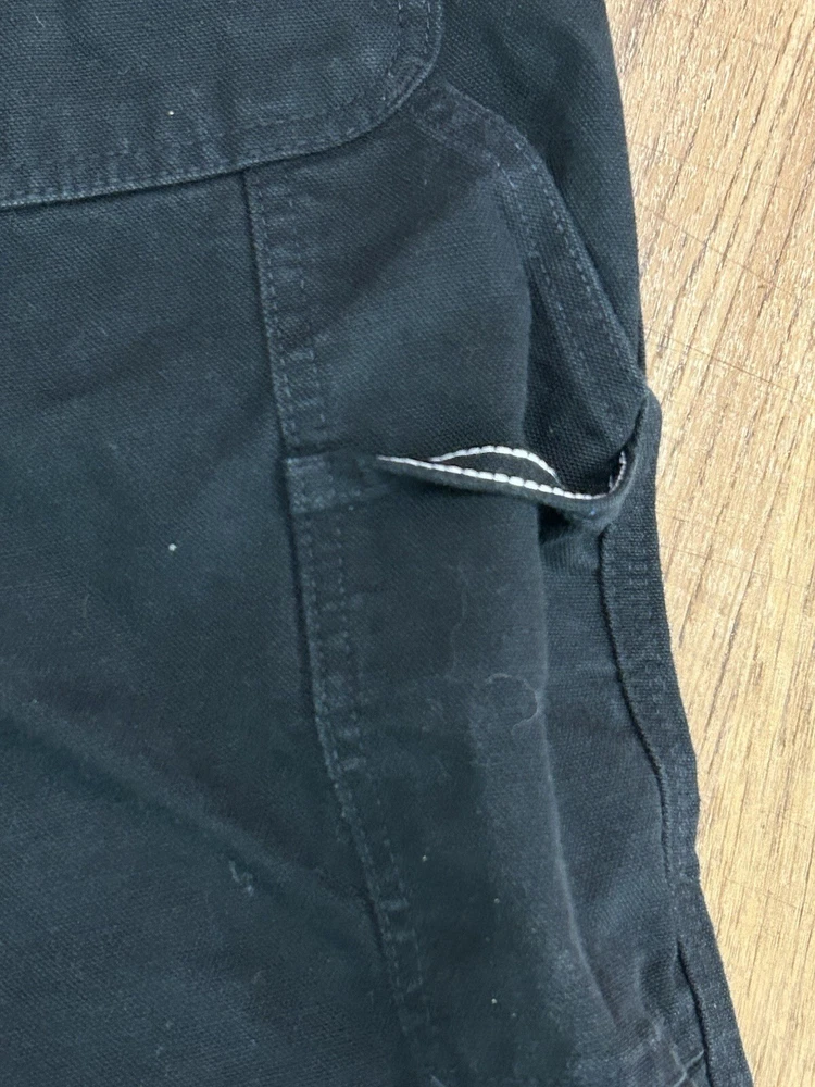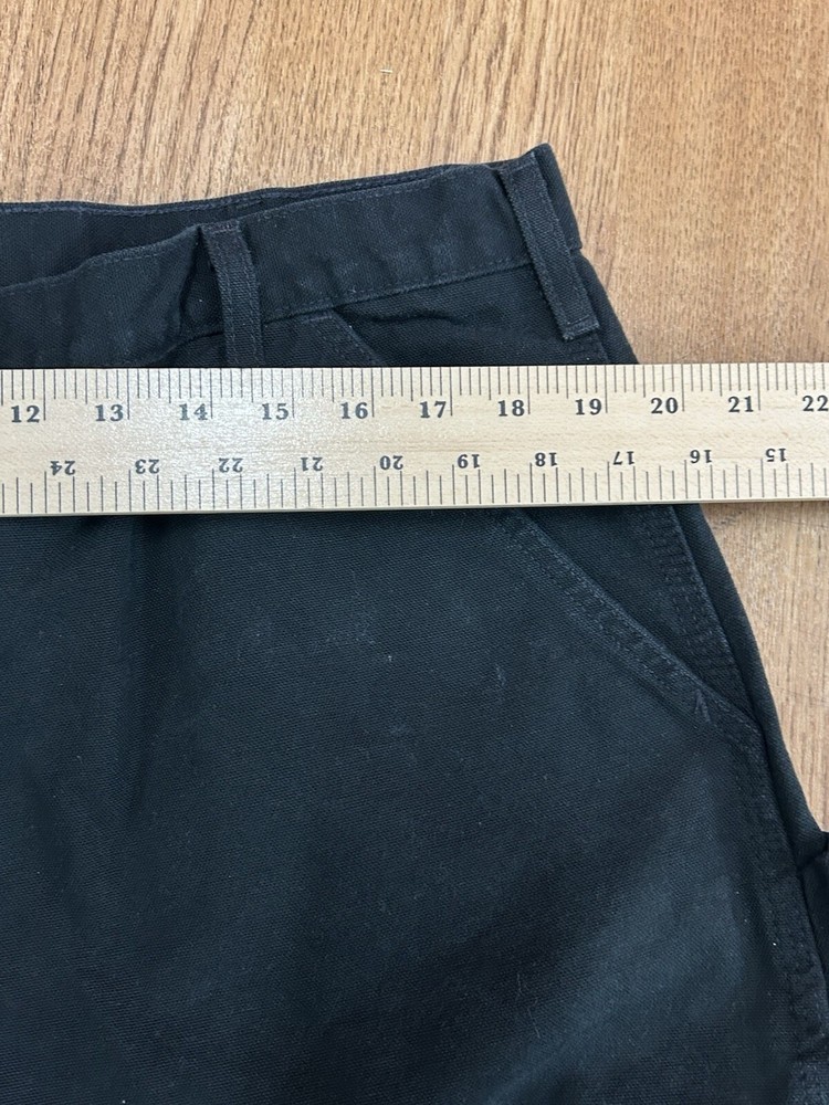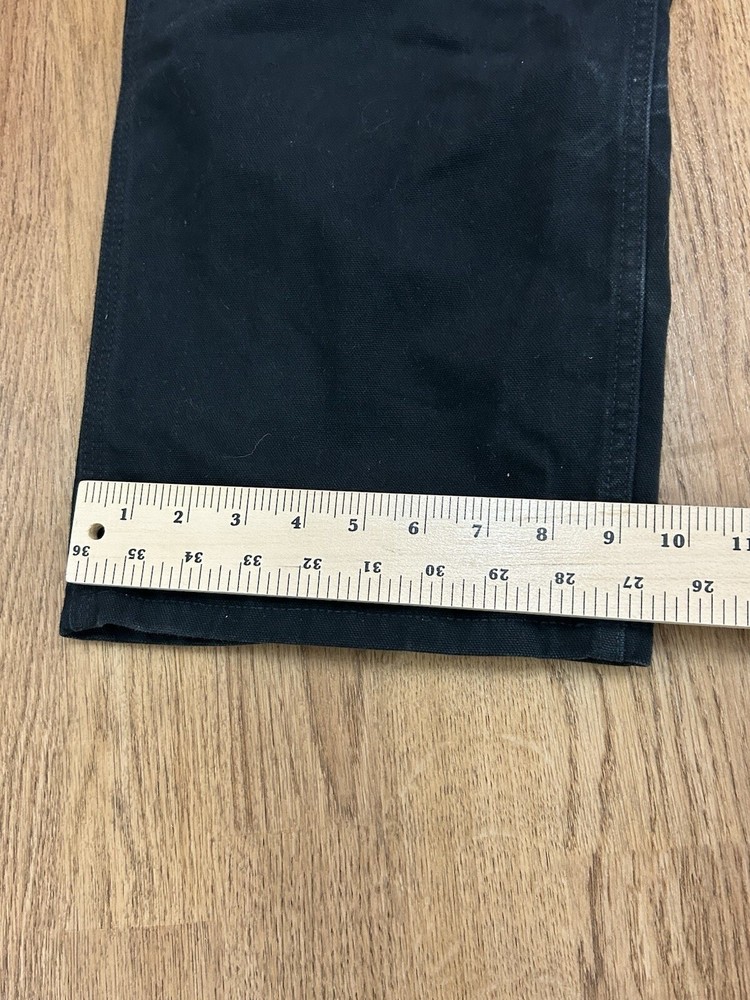 The product is a pair of vintage Carhartt B11 Black Original Dungaree Canvas Carpenter Pants in size 40x30. These workwear pants are designed for outdoor use, with a durable canvas material and original fit leg style. The black color and limited edition design make them a stylish and practical choice for rugged work environments. Made in the United States as part of the Union Made product line, these pants are perfect for those looking for quality, American-made workwear with a classic outdoor theme.