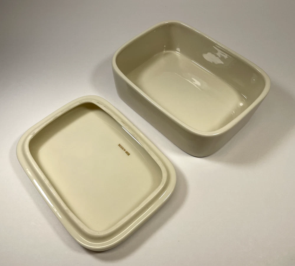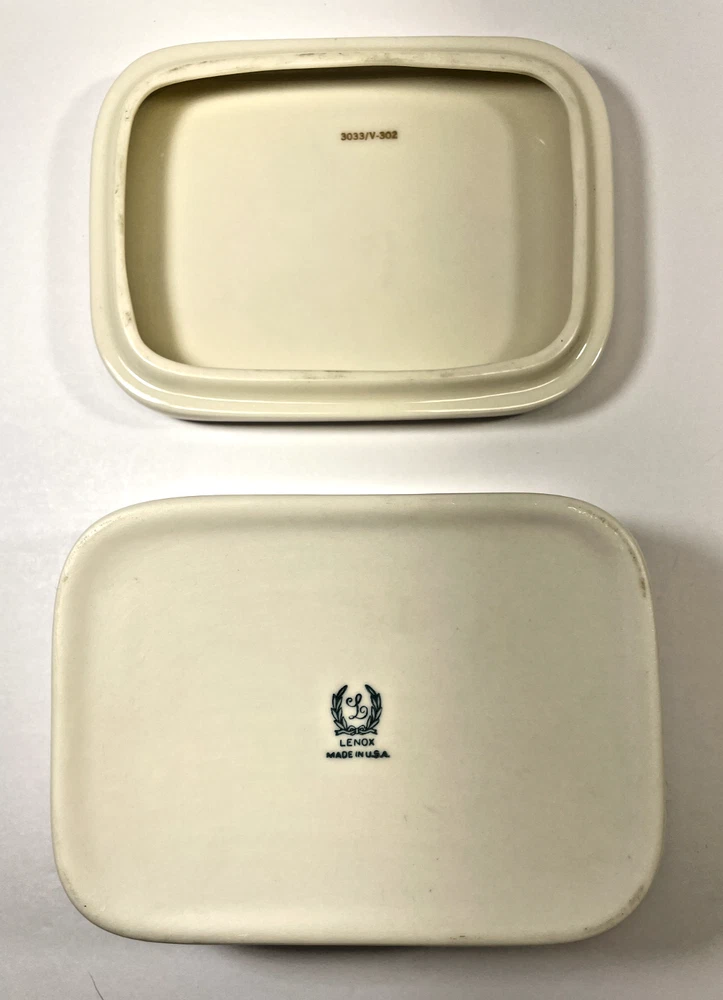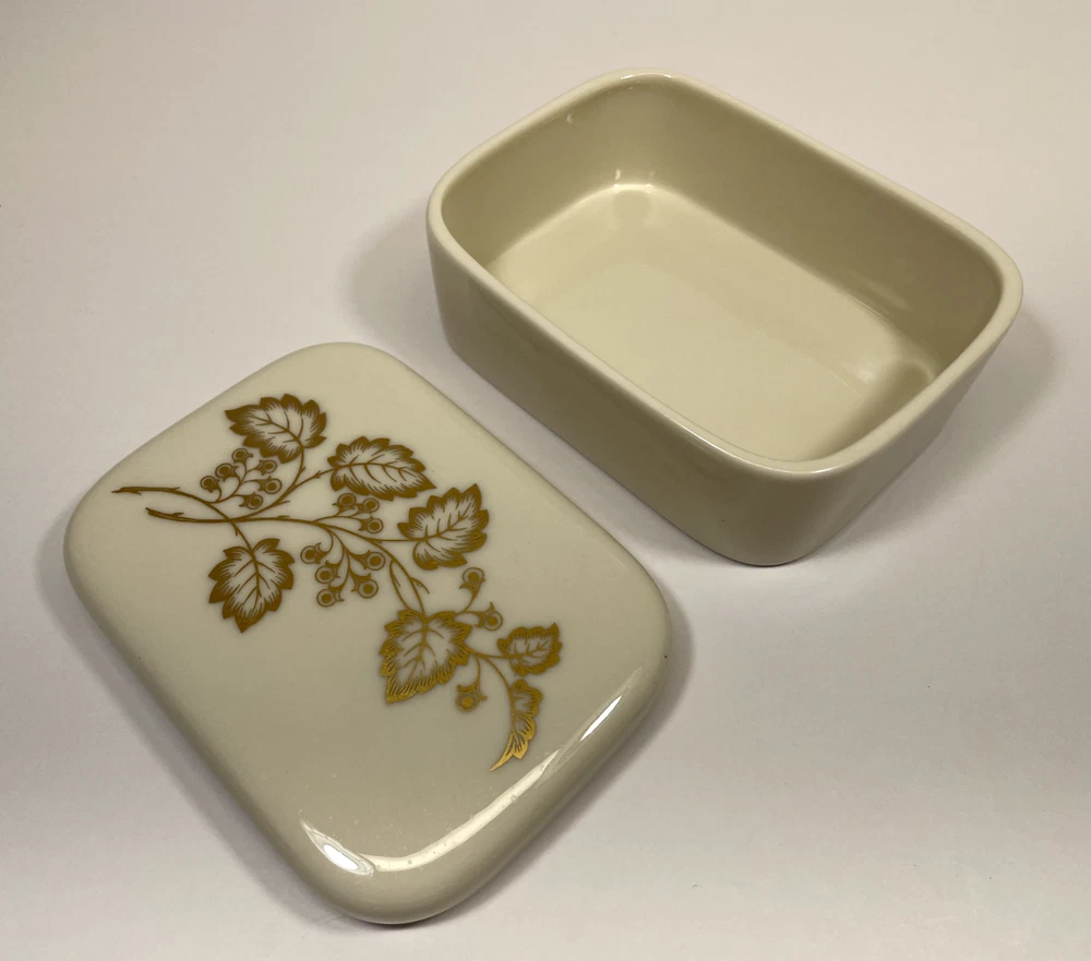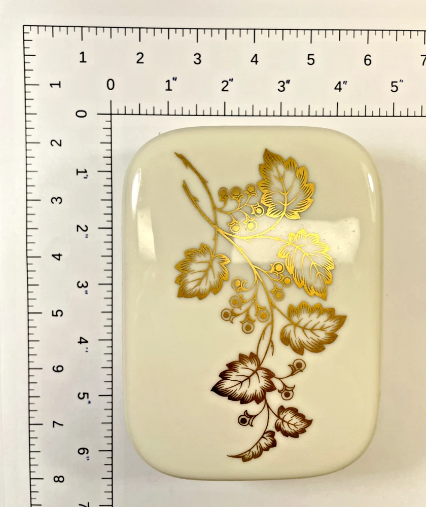 This vintage Celeste Lenox cigarette box doubles as a trinket, sugar, or jewelry box, featuring a rectangular shape with a removable lid adorned with intricate gold leaves and buds on a cream-colored porcelain/ceramic material. The box, part of the Keepsake Boxes collection, exudes a mid-20th-century charm with its glossy finish and gold floral theme. Made in the United States, this original piece from the 1940s-1970s era is a unique and elegant addition to any room, perfect for storing small items or as a decorative collectible.