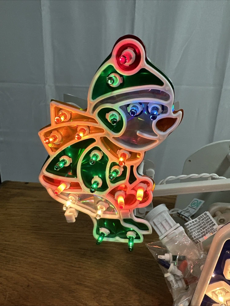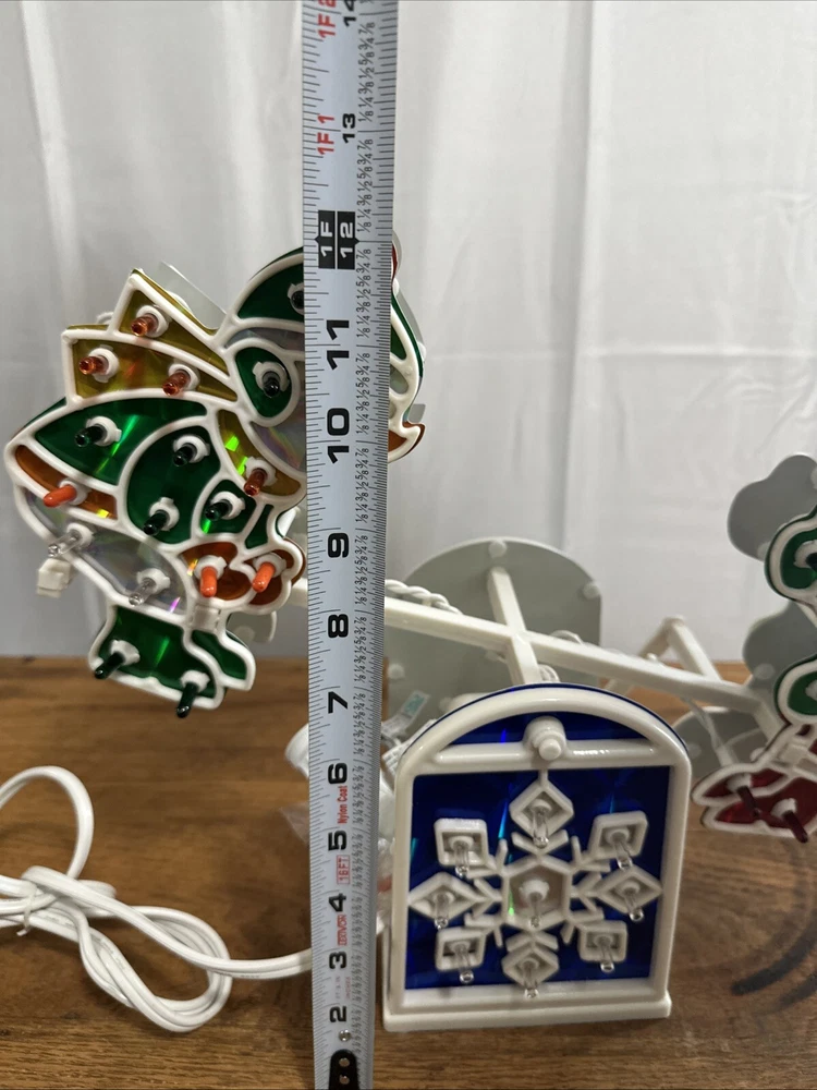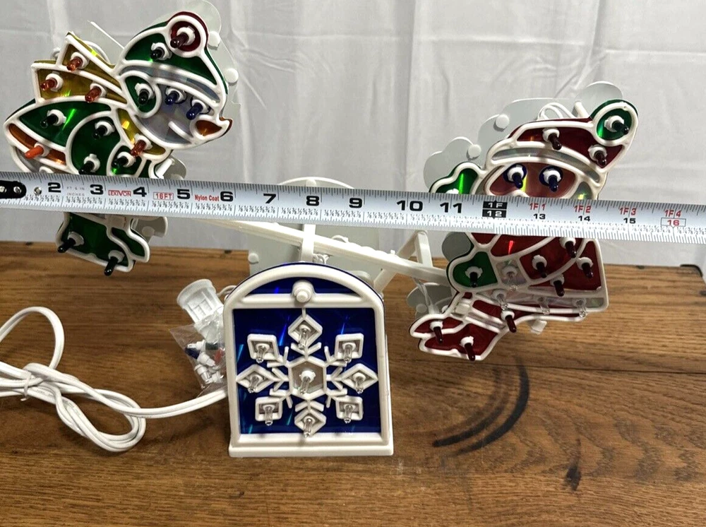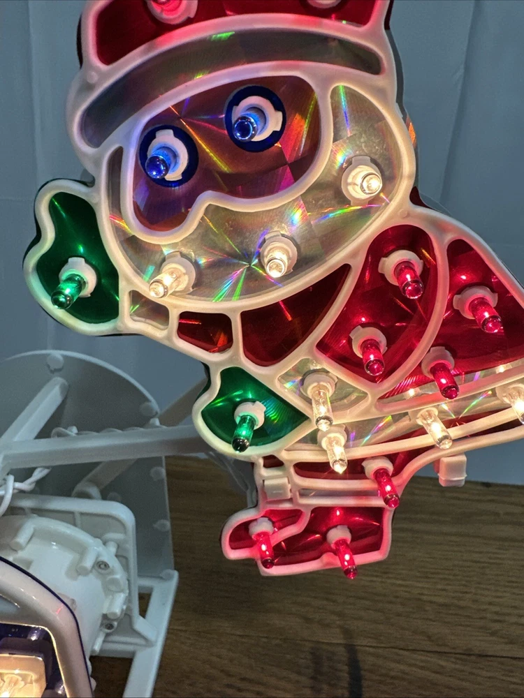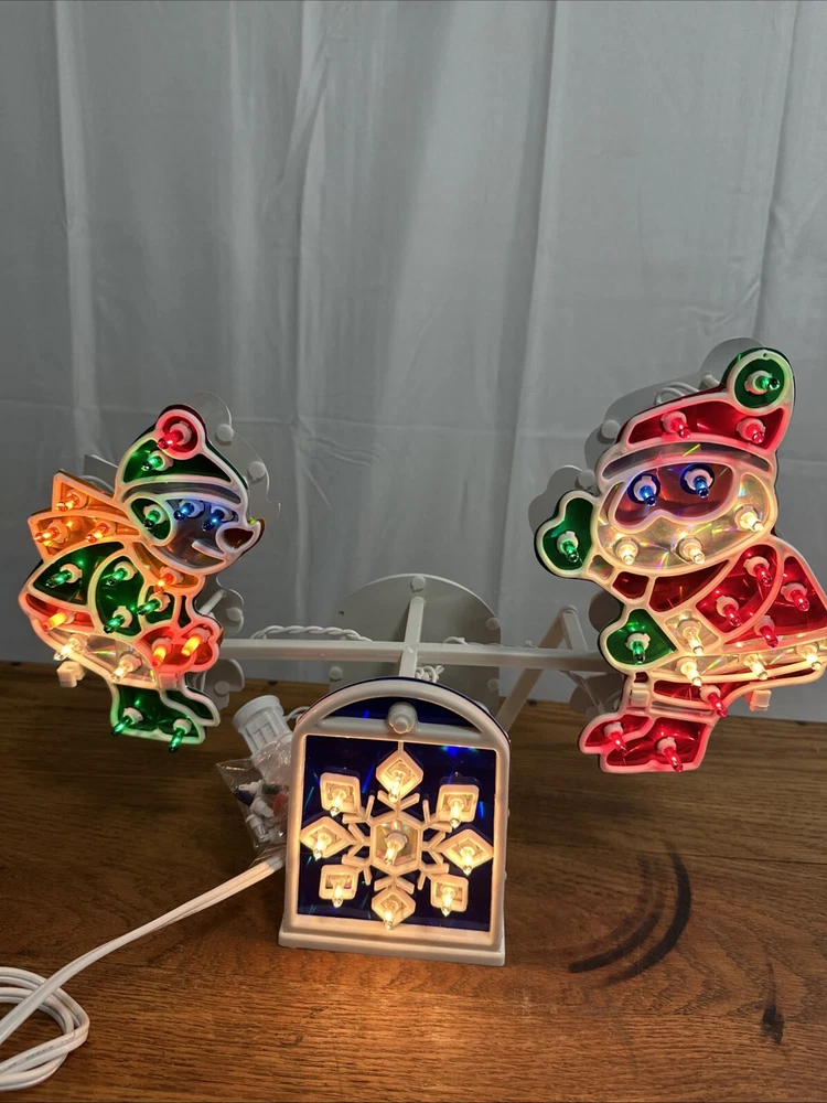 This vintage Christmas figurine features an animated Santa and elf, with a teeter totter design that adds a fun touch to your holiday decor. The holographic details and multicolor construction make it a unique addition to any collection. Measuring 15 inches in length and 12 inches in height, this corded figurine is made of plastic and features lights and motion for an added effect. It was manufactured in 2003 by Toyo for Avon. Perfect for the holiday season, this Animated Santa figurine is a must-have for collectors and fans alike. New open box condition. Has only been out of the box to test it. See photos.