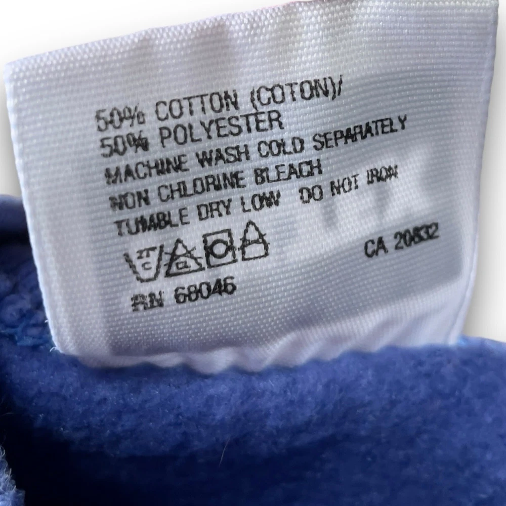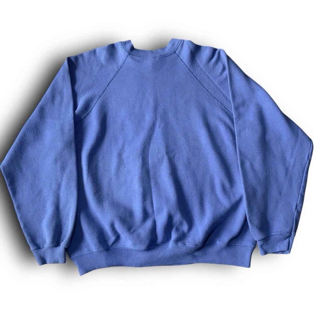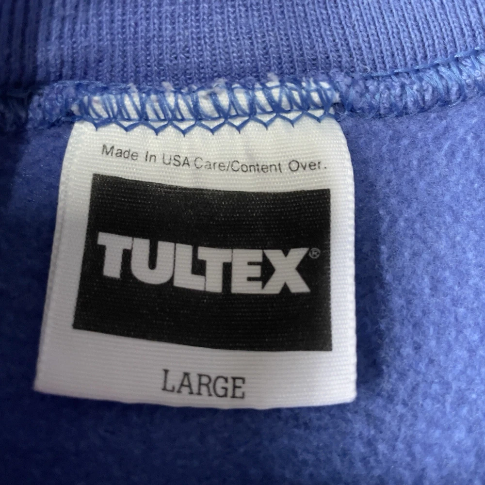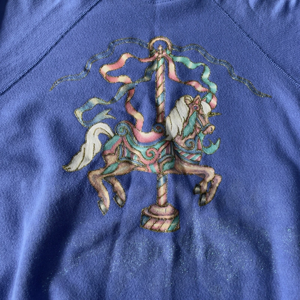 50% cotton 50% poly | USA made 🇺🇸 Vintage 80s 90s ‘tultex’ whimsical fantasy pullover crewneck Christmas sweatshirt in solid blue featuring sparkle glitter unicorn horse pony carousel graphic print on front with long sleeves in size large. Minor piling, with minor signs of wear on graphic adding to its retro appeal, overall in great pre owned condition. Laid flat: chest 21.5” length 23” sleeves 27”