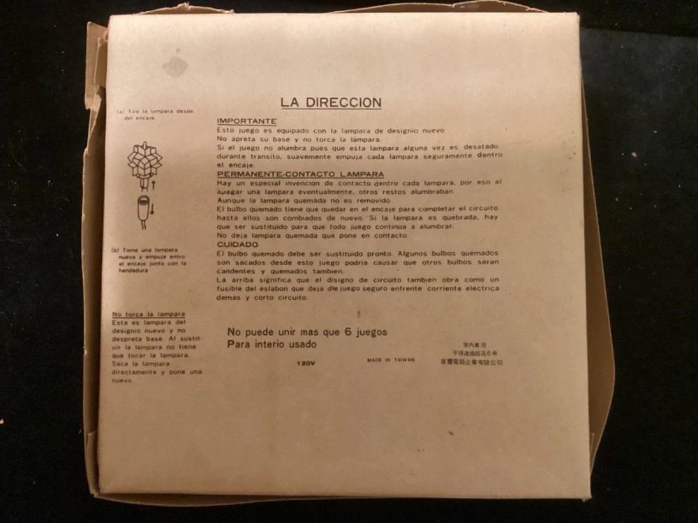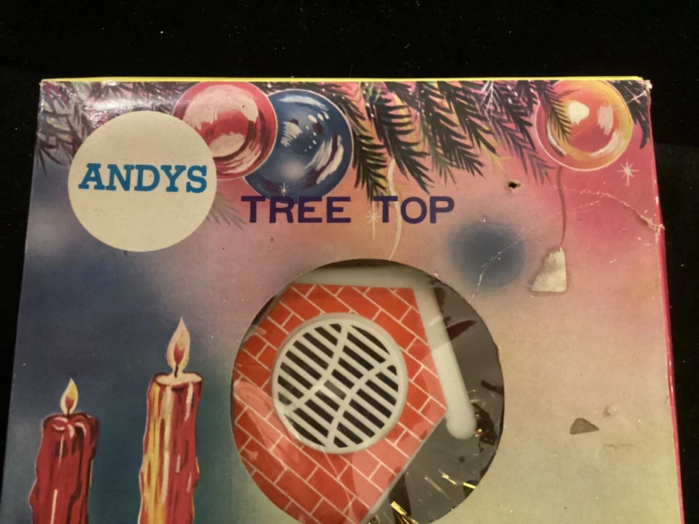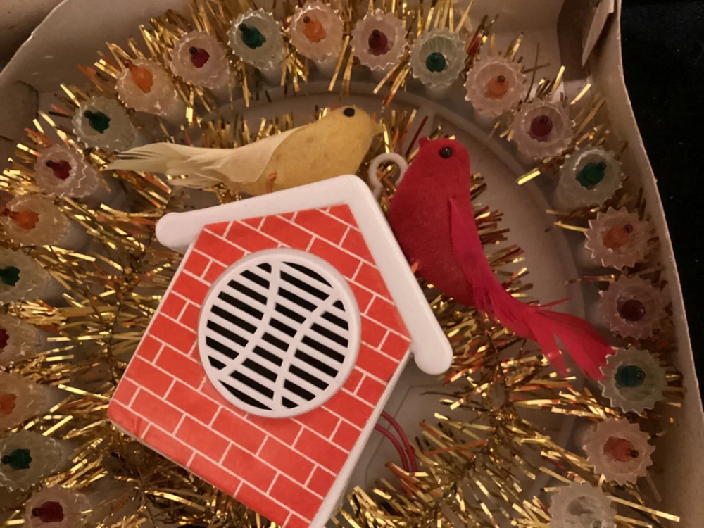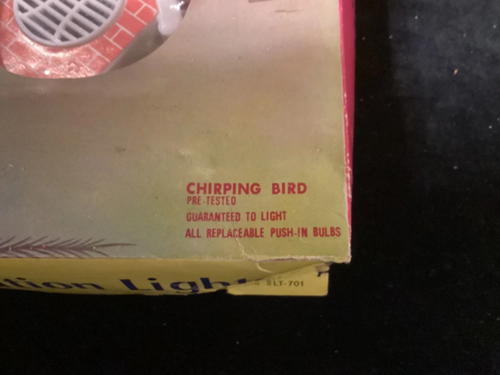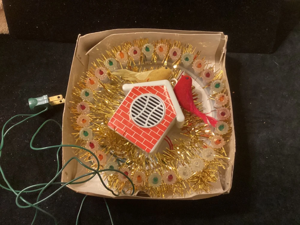 PLEASE NOTE: Photos, it looks like all the green bulbs do not work, BUT THEY DO. Apparently, when I shot the photo, because they were flashing, the green bulbs just happened to be in the non-lit flash mode. I assure you, they do work. This very unique, round, tinsel-embellished tree topper is very unique and rare. I have not found one anywhere on the Internet. I have included a little video with the photos. In the center is a little “brick” house speaker that plays chirping bird sounds, surrounded by 30 miniature lights. There are two flocked birds sitting on the roof of the house. The item comes with its original box. The box does have some damage to it. Please see photos. Everything on this item works well, and all the lights work. I just noticed that three of the lights which were probably initially different colors, apparently have been replaced with clear lights. This, of course, could be changed to suit your wishes. My guess is that this item was made in the 70s, possibly even mid to late 60s, but there is no date on it. Please ask any questions you may have, as I do not accept returns. Thanks for looking!!