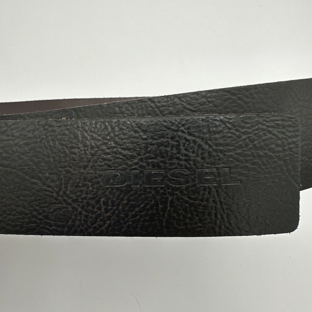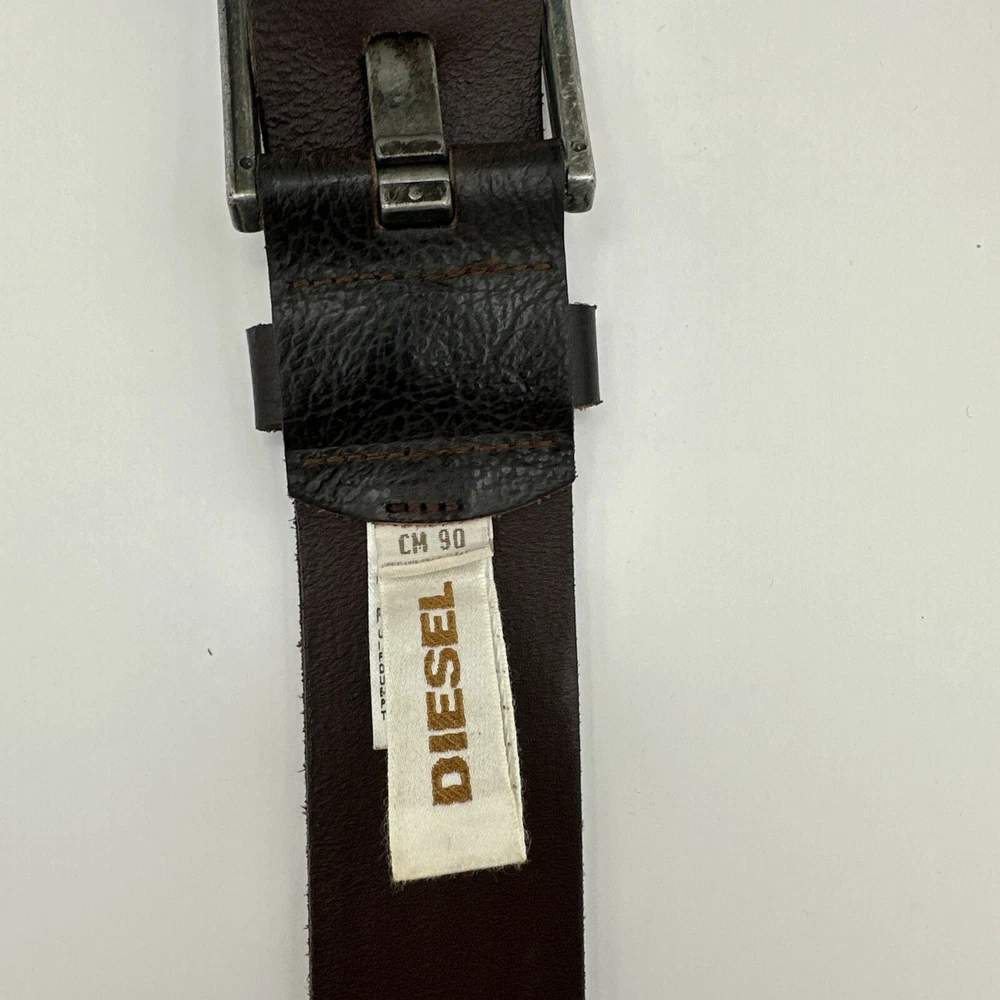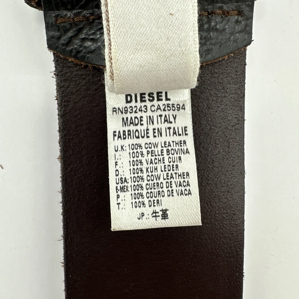 Elevate your style with this vintage Diesel belt, crafted from high-quality Italian leather. The distressed strap adds a touch of class to any outfit, while the adjustable buckle ensures a comfortable fit. This unisex belt is perfect for both casual and work wear, and the solid pattern and brown color make it a versatile addition to your wardrobe. The 1.7" width and cow leather material make this belt a durable and reliable choice. Handmade in Italy, this belt features a distressed Italian leather strap and is suitable for regular-sized adults. The timeless design and quality theme make this belt a must-have for any fashion-conscious individual.