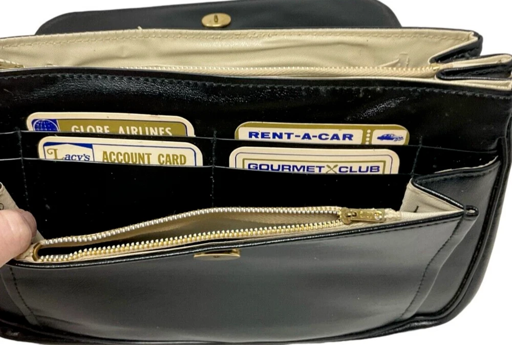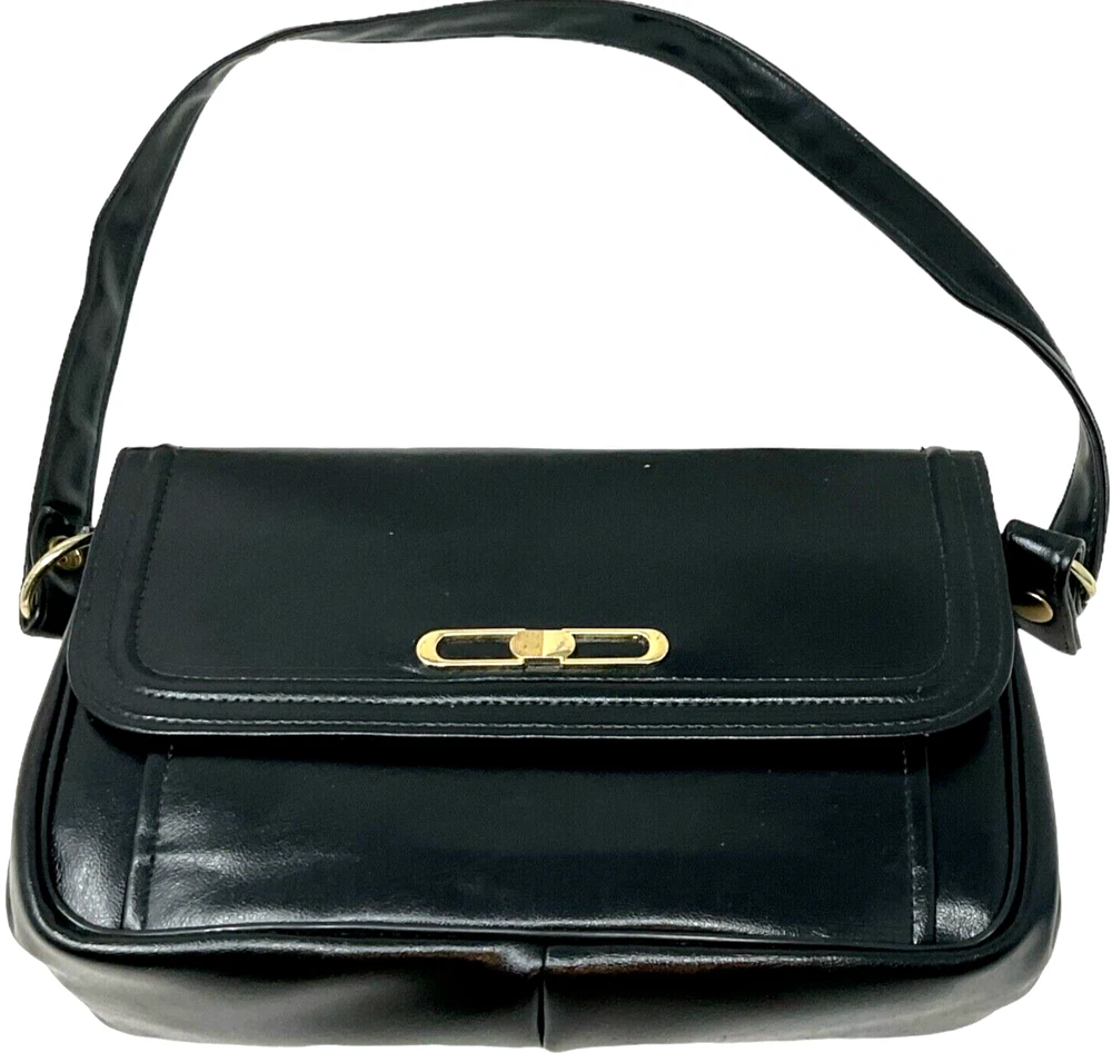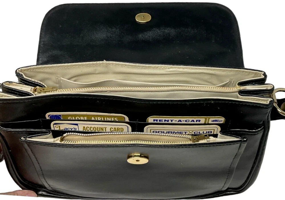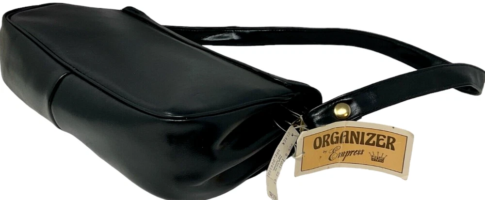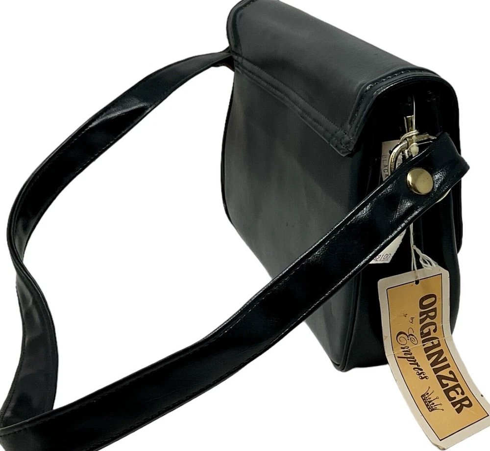 Vintage 1970's Empress Black Leather Organizer Handbag Purse With 11" Shoulder Strap, Gold Tone Hardware, & Snap Magnetic Closure - 7" x 12". Perfect for Travel or Everyday. 4 Organizational Compartments Including: 1 - Main Open Compartment 1 - 7" Large Pocket 2 - 3" Skinny Pockets (Middle & Front Zipper) 4 Card Slots Matching Zipper Coin Purse 6.5" x 4". New With Original Tags and Packaging. *Small Blemish in the Leather at Top of Strap and Coin Purse Has Some Minor Discoloration From Paper Packaging. Free Standard Shipping.