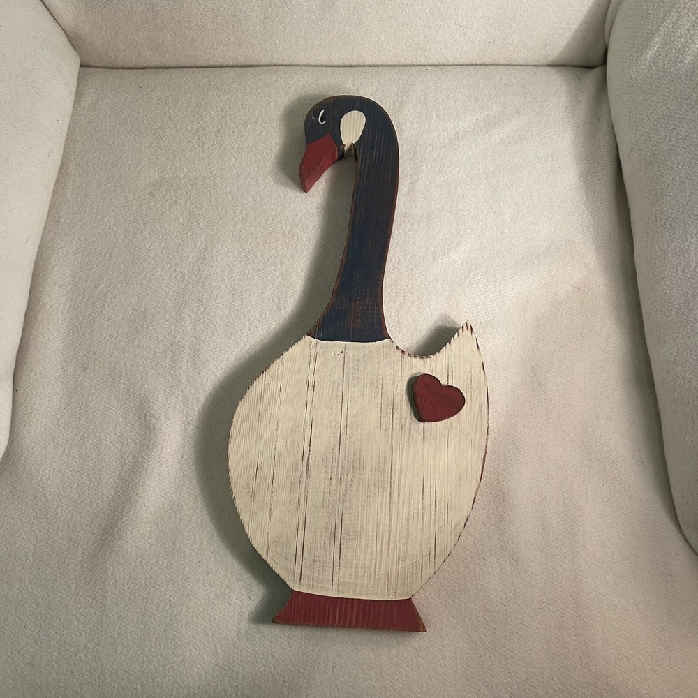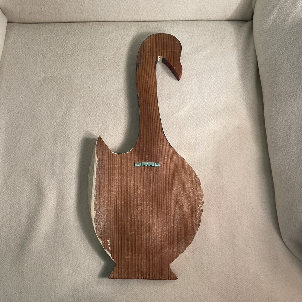 Add a touch of country charm to your home with this vintage wooden wall hanging featuring a cute duck/goose design. Measuring 7.25 inches in length, 3/4 inches in width, and 16 inches in height, this handmade plaque is perfect for adding a decorative touch to any room. The multicolor design and intricate details make it a unique addition to your home décor collection. This wall-mounted plaque is made from high-quality wood and features a mount for hanging. The duck/goose theme is perfect for those who love art and country decor. Whether you're looking to add a touch of charm to your home or office, this vintage plaque is sure to impress. Excellent condition.