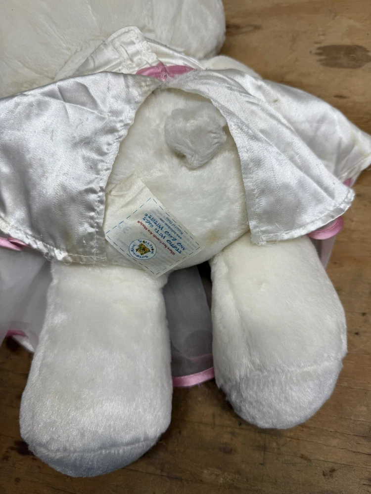 This vintage Build-A-Bear Workshop plush is a Hello Kitty character in the form of a white bear measuring 18 inches in size. It features a black eye color and comes with an original pink heart bow accessory. This retired Fluffy collection item includes the iconic Hello Kitty branding and is made of plush material. Perfect for fans of Hello Kitty or collectors of Build-A-Bear Workshop items. YELLOW MARKS ON BOW, HEAD, BACK, AND FEET, SEE PHOTOS. COMES WITH ORIGINAL BOW. INCLUDES OUTFIT THAT HAS STAINING. FAST SHIPPING.