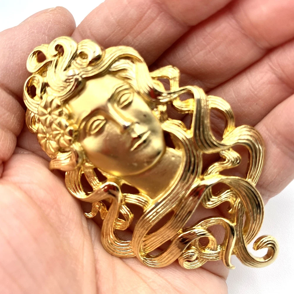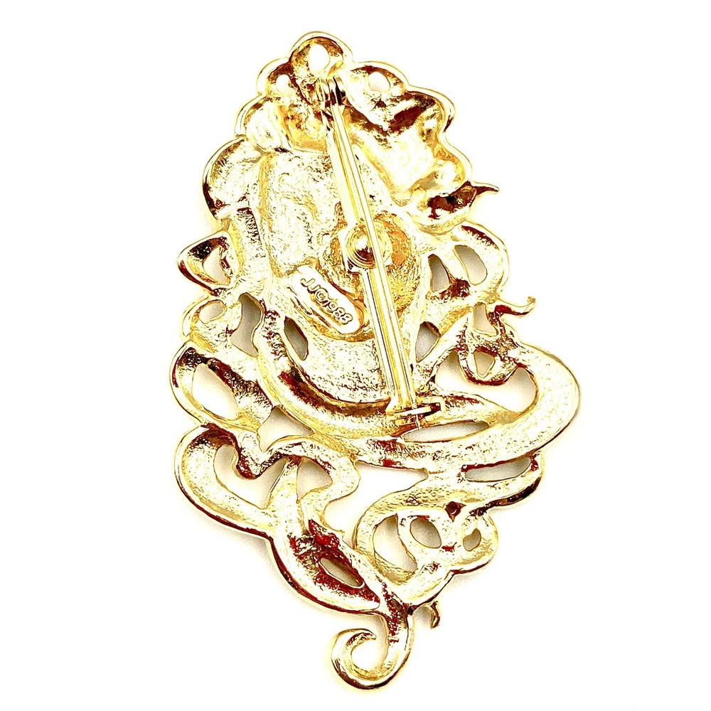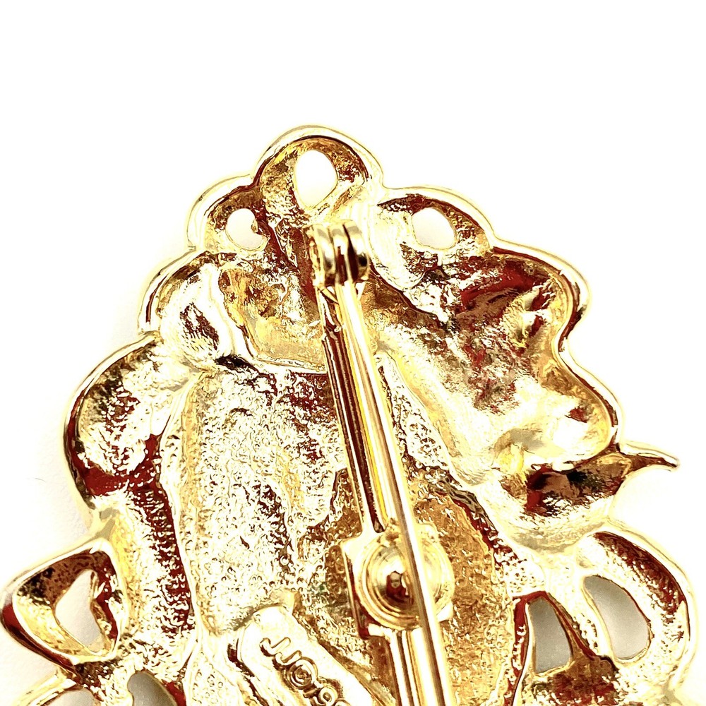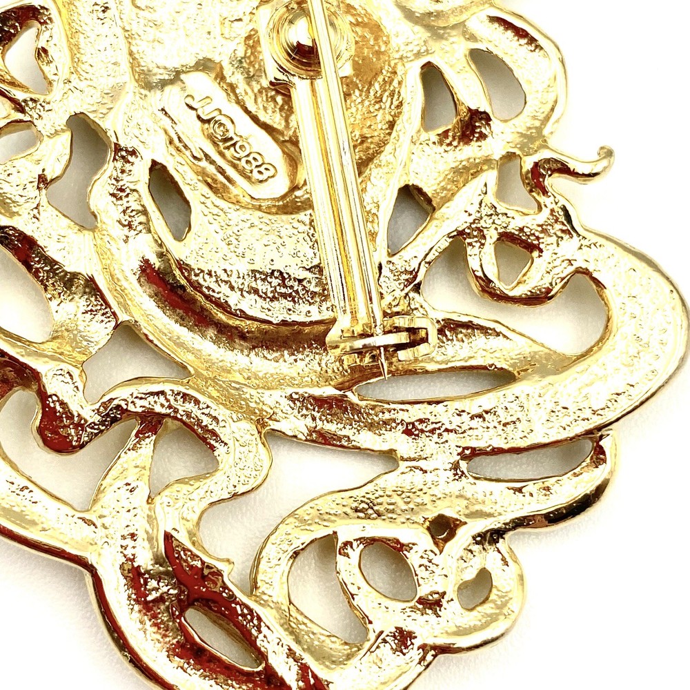 Elevate your attire with this exquisite J&J 1988 GoldTone brooch, a homage to the timeless elegance of the Victorian era. Featuring a large, ornate design with a textured hair detail and a delicate flower accent, this piece exudes a sense of artistry and sophistication that's sure to draw admiration. Ideal for a variety of occasions from anniversaries and birthdays to Christmas and Mother's Day, this brooch is versatile enough to complement any ensemble. Signed by the maker, it's a genuine vintage item that adds a touch of retro beauty to your jewelry collection. This brooch is an excellent condition! This is a pre-owned piece. May require cleaning. There may be scratching, fading, chips, normal wear, missing stones, etc… See Photos. If you have any questions, please feel free to contact me via eBay messaging. Thank you for stopping by. Make sure to check out other items in my store. Your satisfaction is my priority. Have a wonderful blessed day!