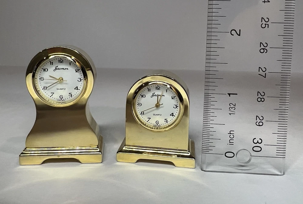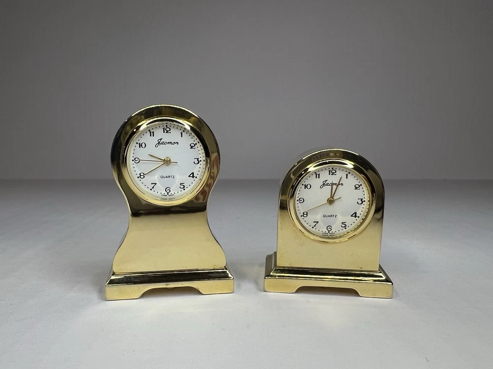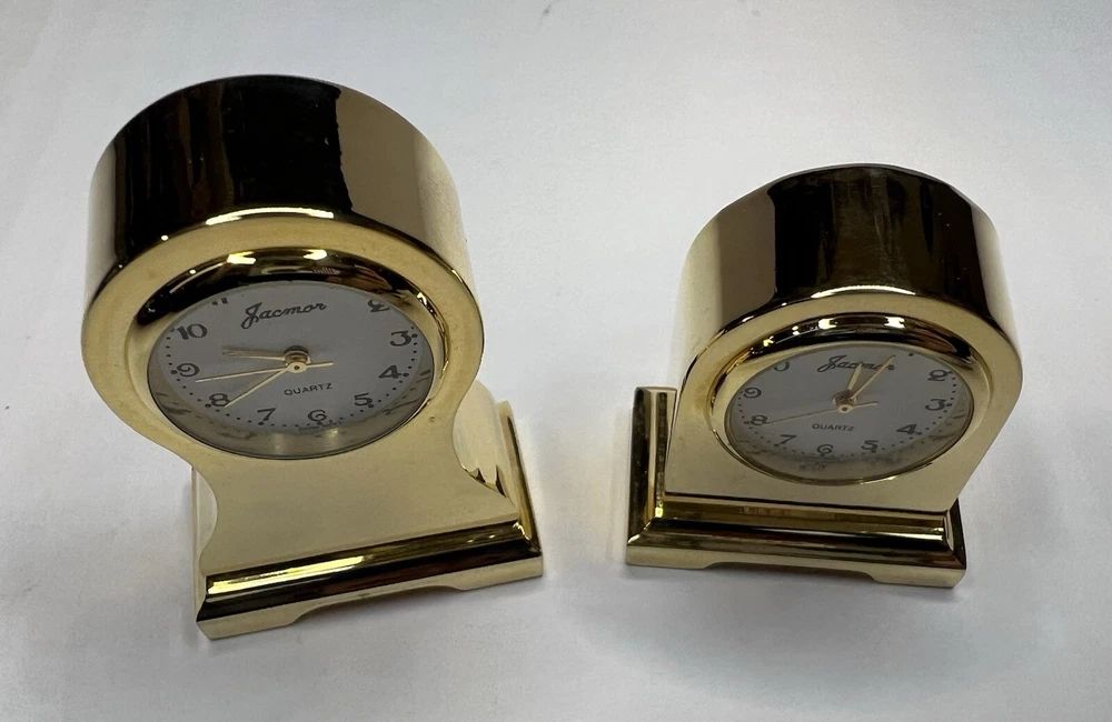 The "Vtg Jacmor Quartz Small Clocks" are vintage novelty clocks from the late 20th century, specifically designed with a quartz movement powered by batteries. These small clocks feature an analog display in a gold-colored metal casing, reflecting the unique style of the Jacmor franchise. Made in China, these clocks cater to collectors and enthusiasts of decorative timepieces, offering a blend of vintage charm and functional timekeeping through their quartz-powered mechanism. DISCLAIMER****NEEDS BATTERIES****